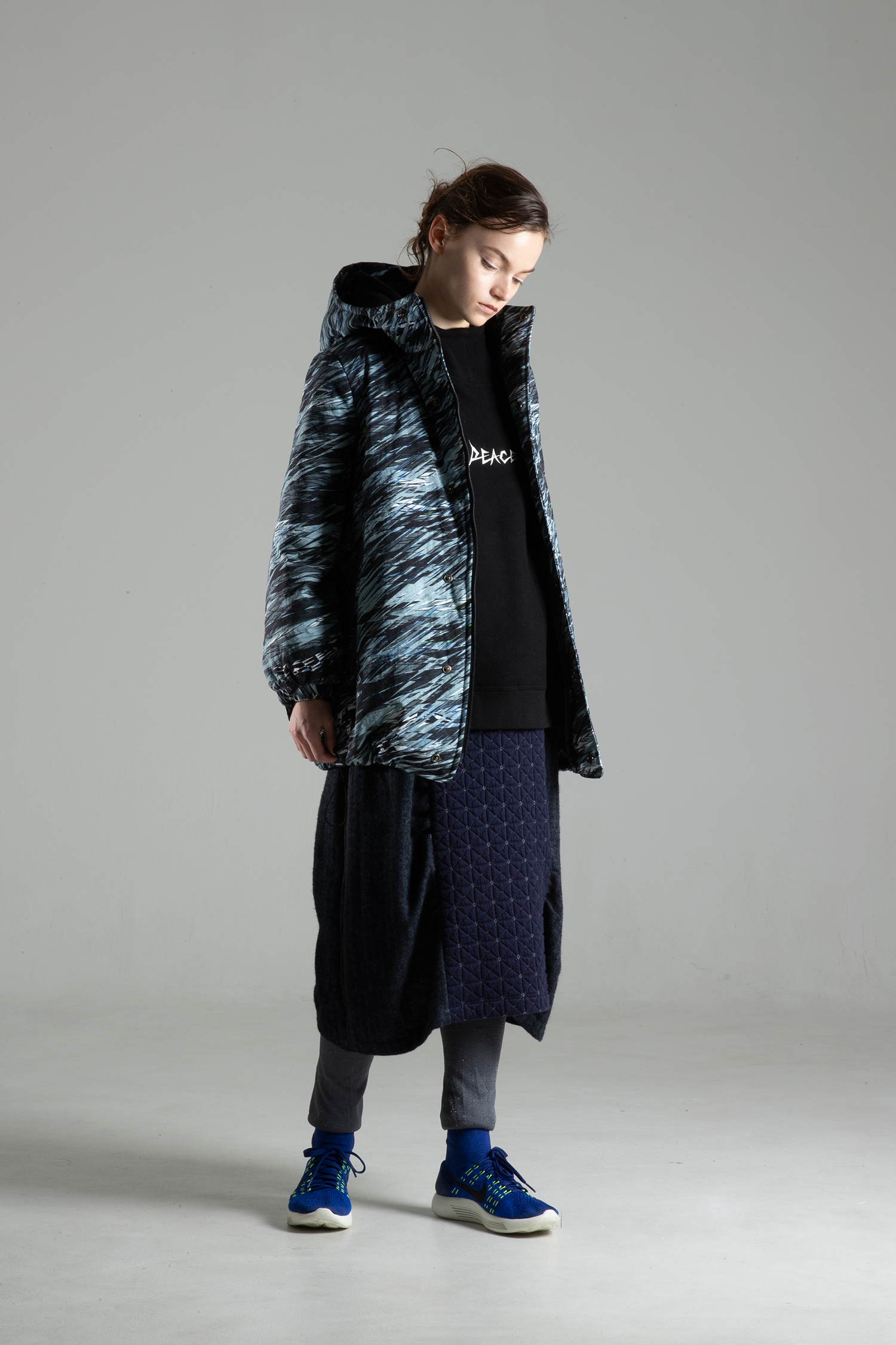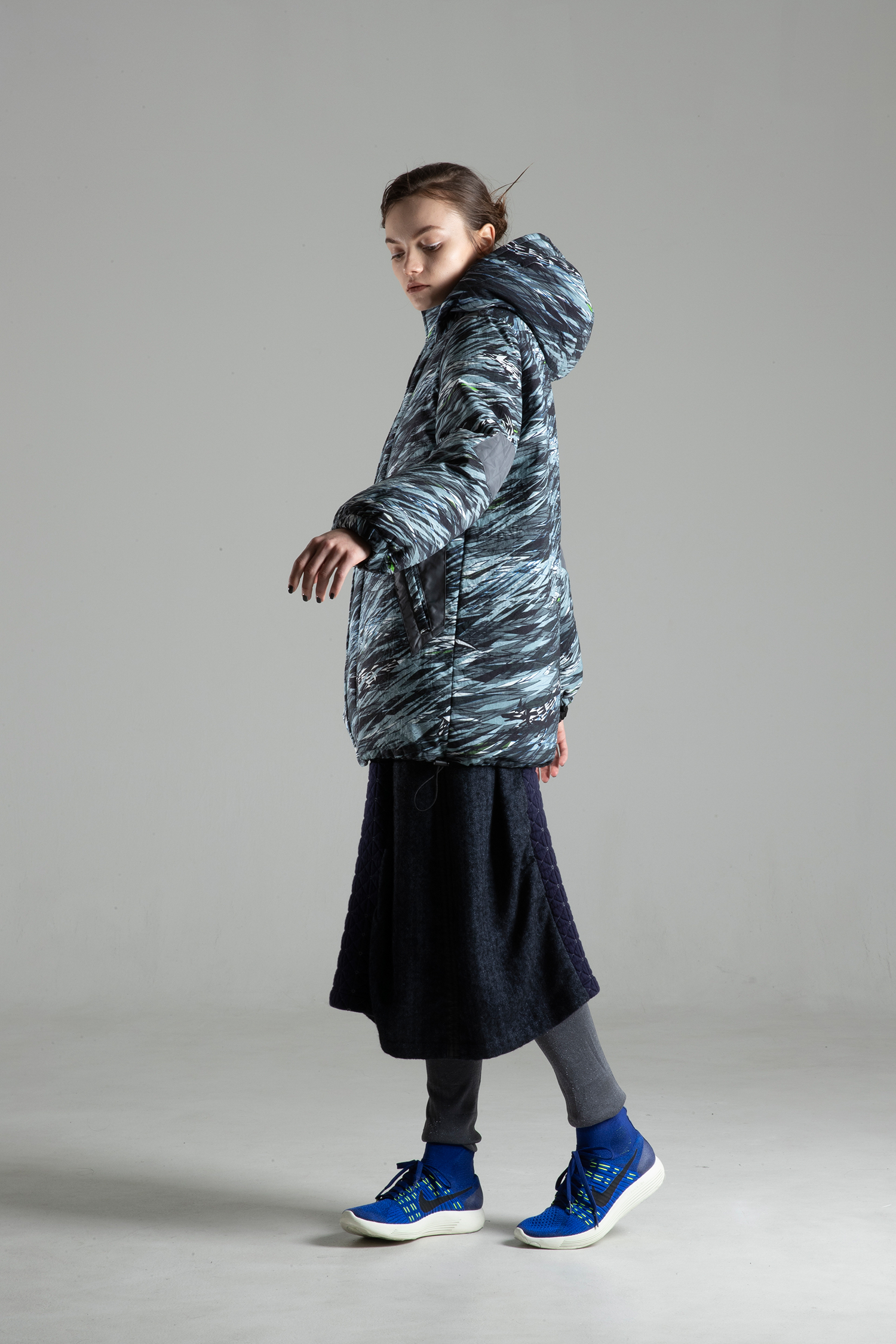 Hooded collar jacket with zipper with padding in nylon oxford with natural texture and fullness "WILD IS THE WIND" print with charcoal gray recycled polyester taffeta elbow patches on sleeves.
