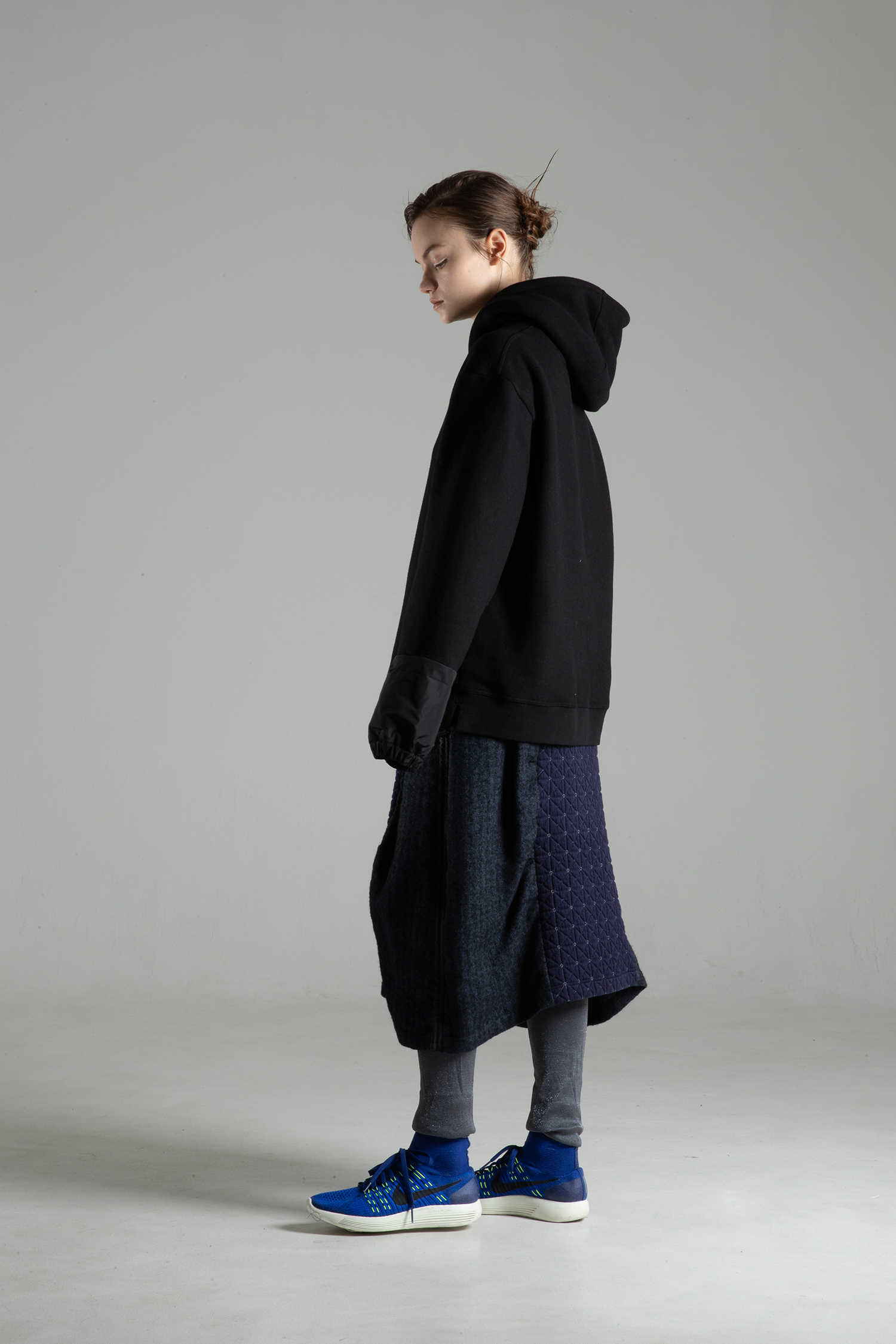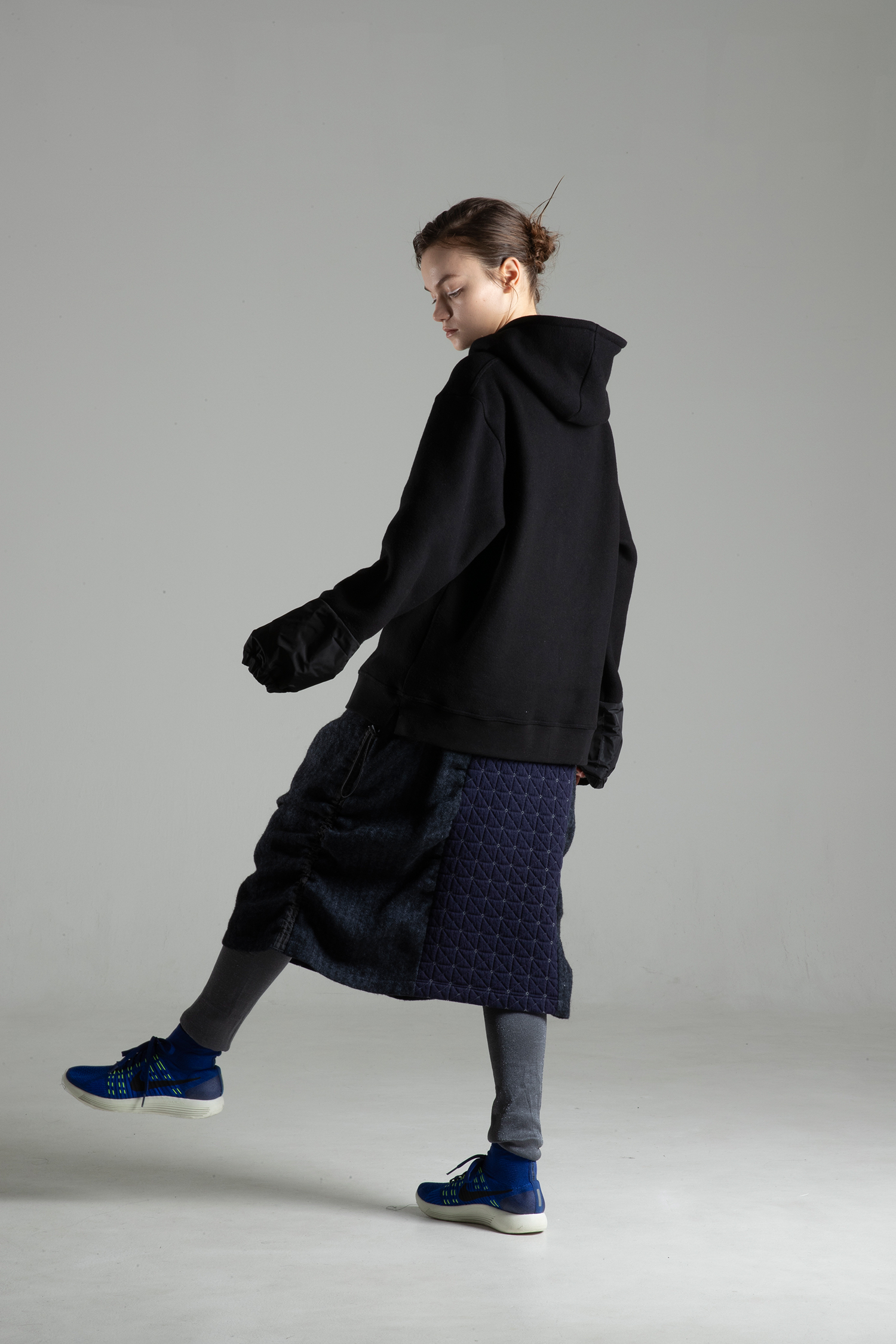Below-the-knee length skirt in melange navy herringbone linen/wool tweed with navy jersey with geometric quilted stitching on the center of front and back with elastic and adjuster at sides to tuck up the hem.