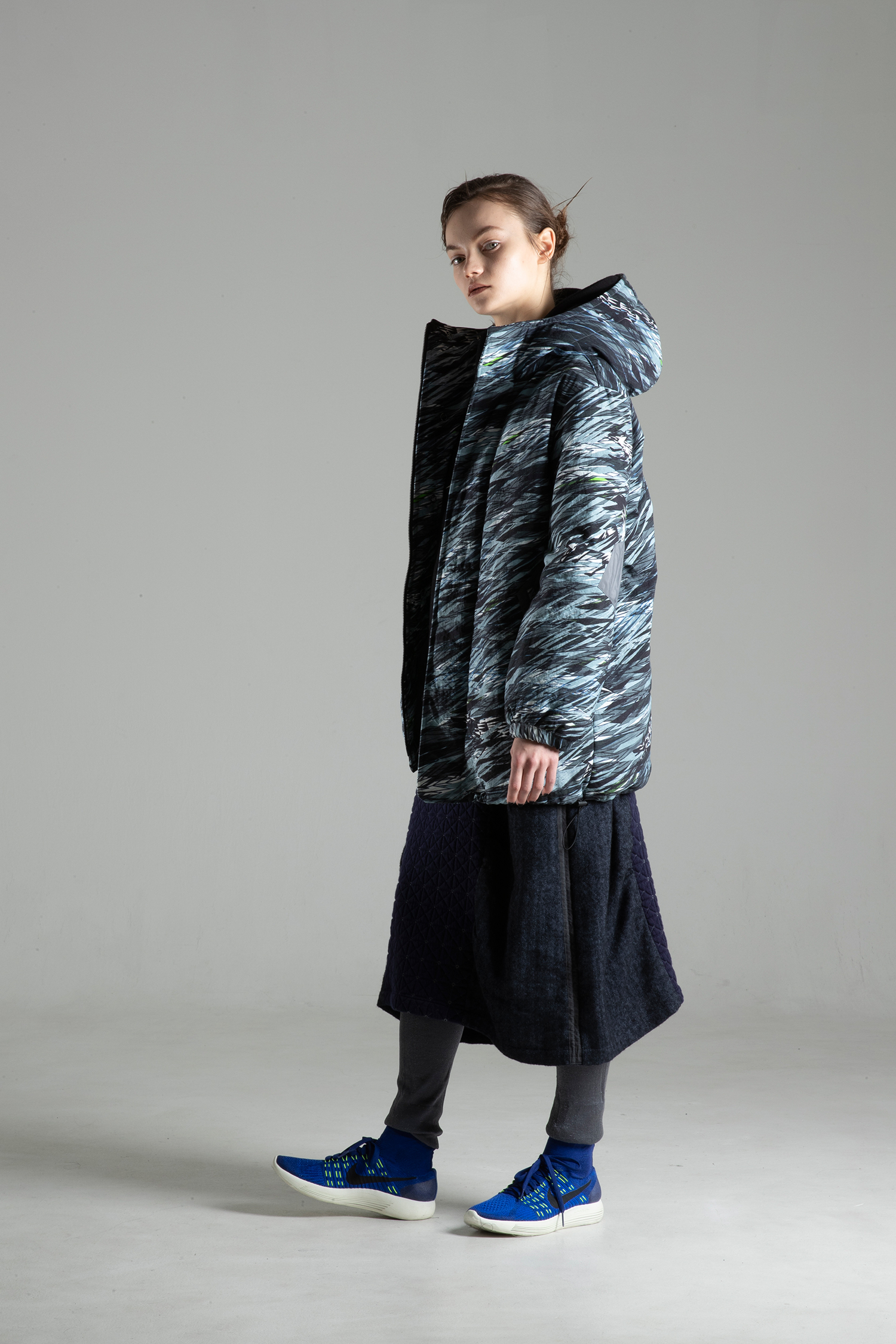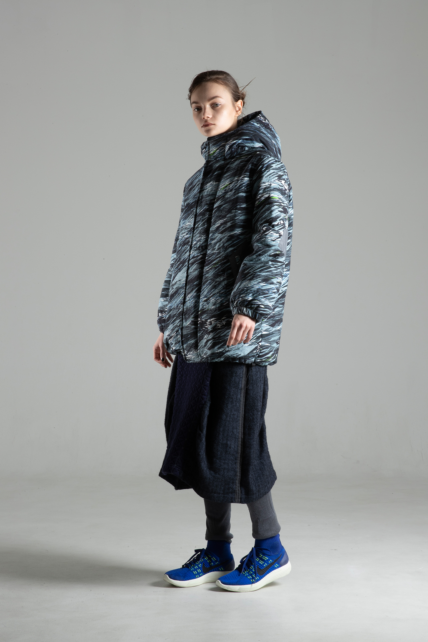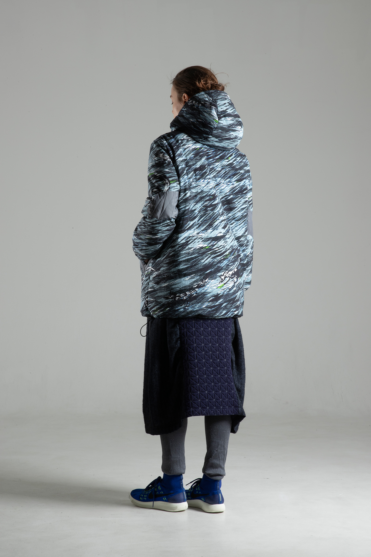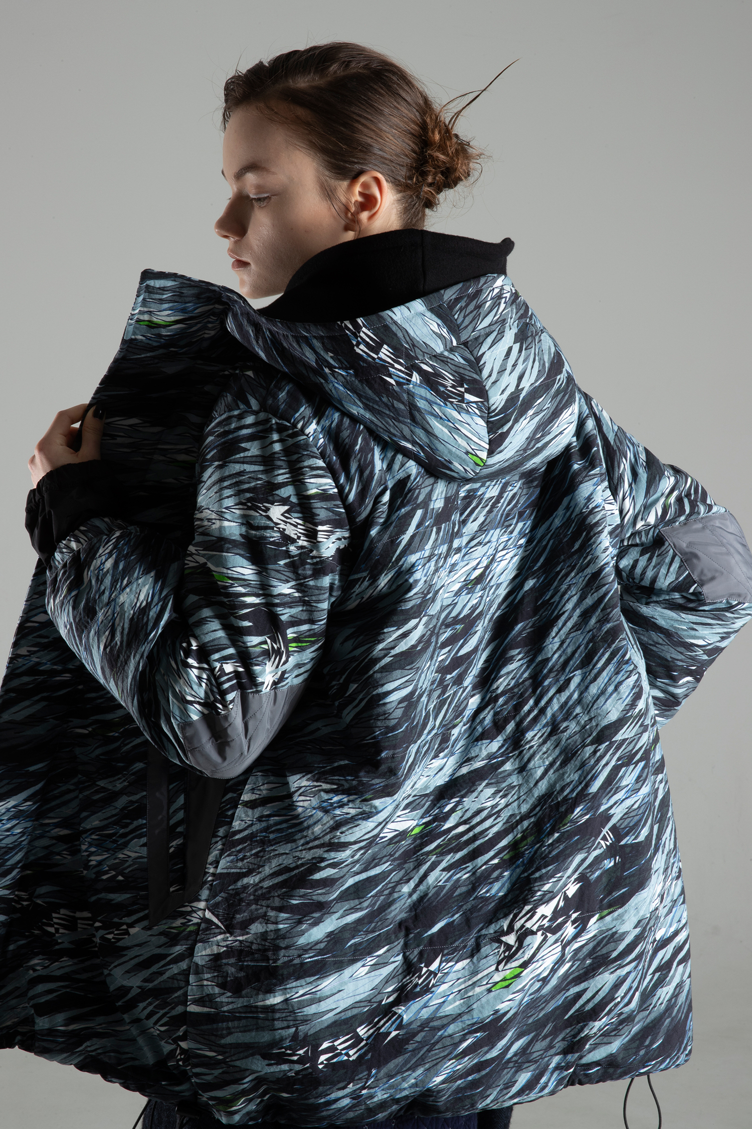 天然素材のような風合いと膨らみのあるナイロンオックス素材 “WILD IS THE WIND” プリントを使用した、袖にチャコールグレー色 リサイクルポリエステルタフタの肘当ての付いた、中綿入り、ファスナーとドットボタン開きのフードカラージャケット。