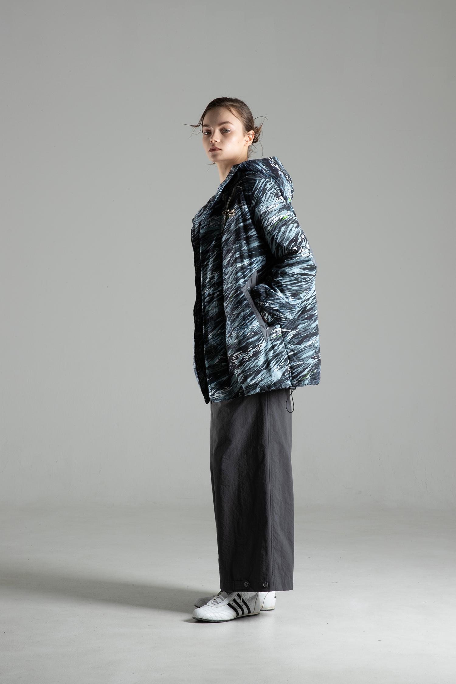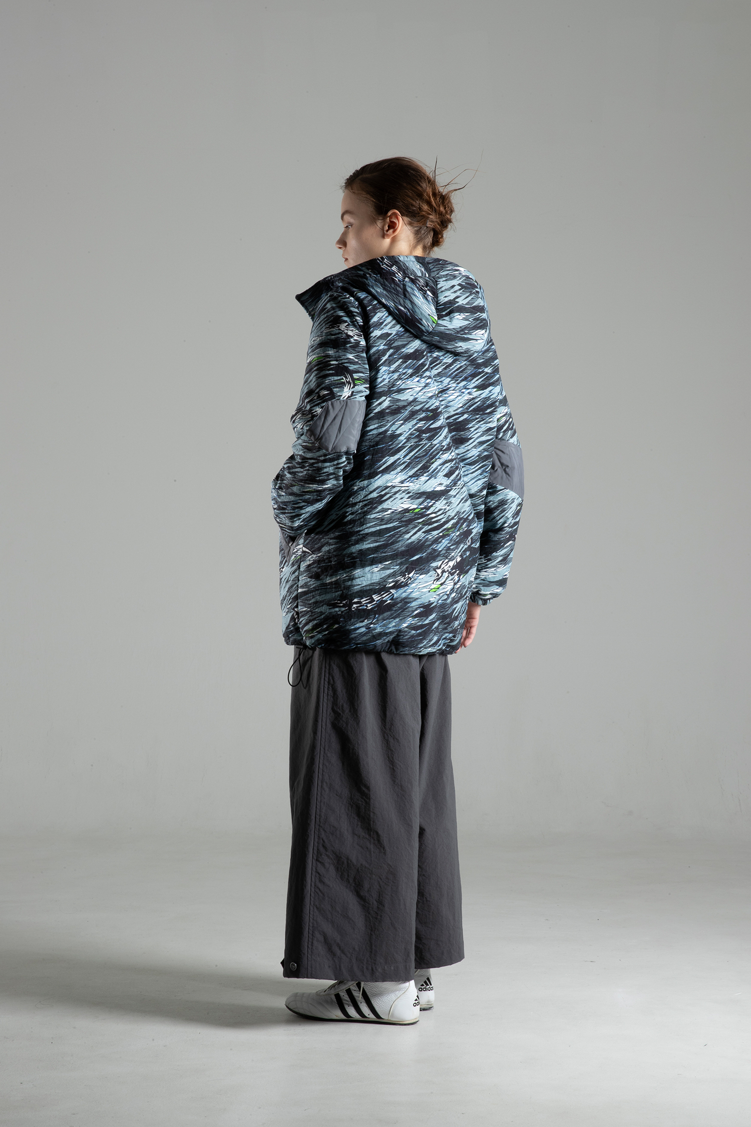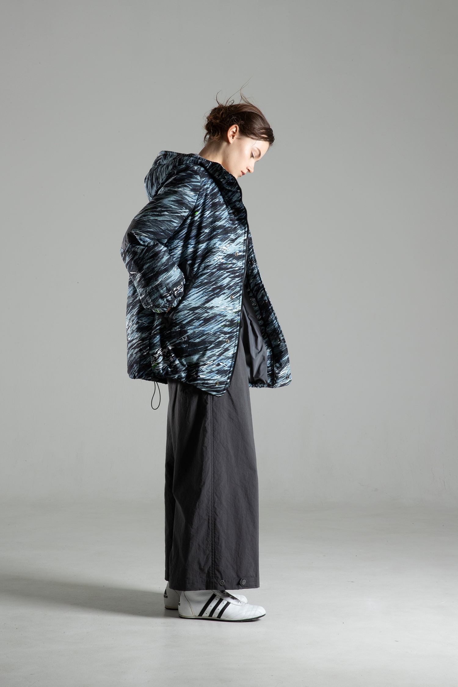 天然素材のような風合いと膨らみのあるナイロンオックス素材 “WILD IS THE WIND” プリントを使用した、袖にチャコールグレー色 リサイクルポリエステルタフタの肘当ての付いた、中綿入り、ファスナーとドットボタン開きのフードカラージャケット。