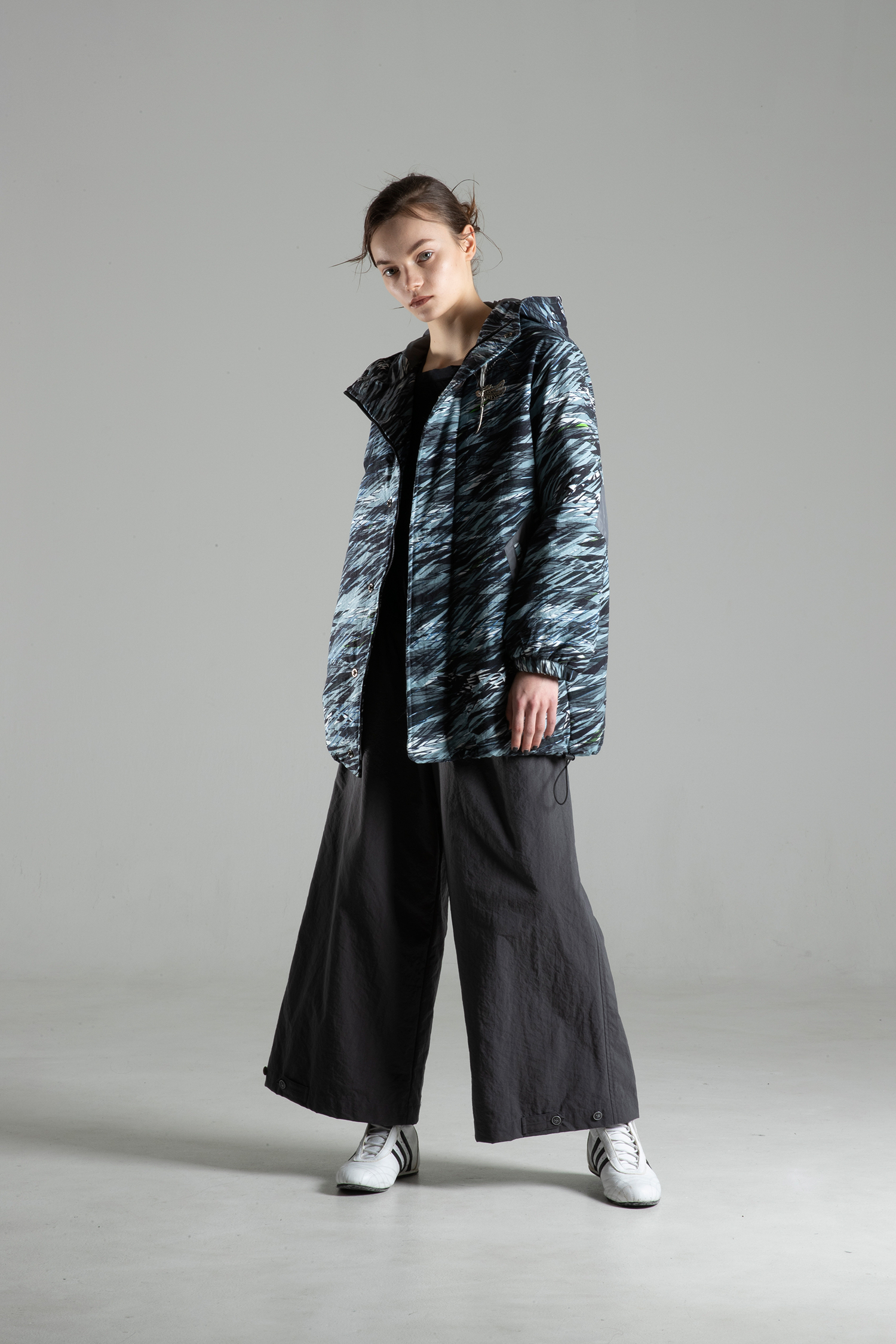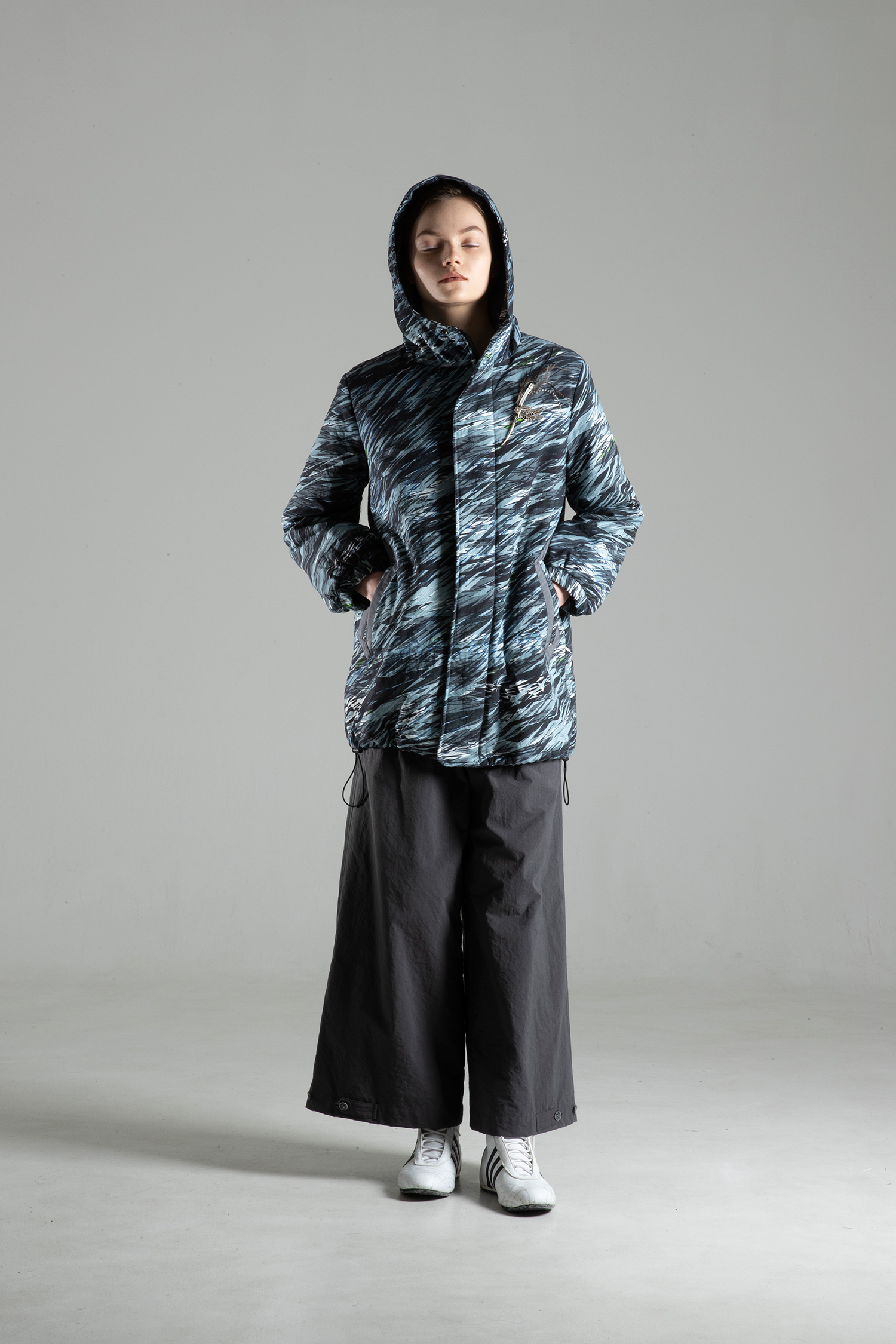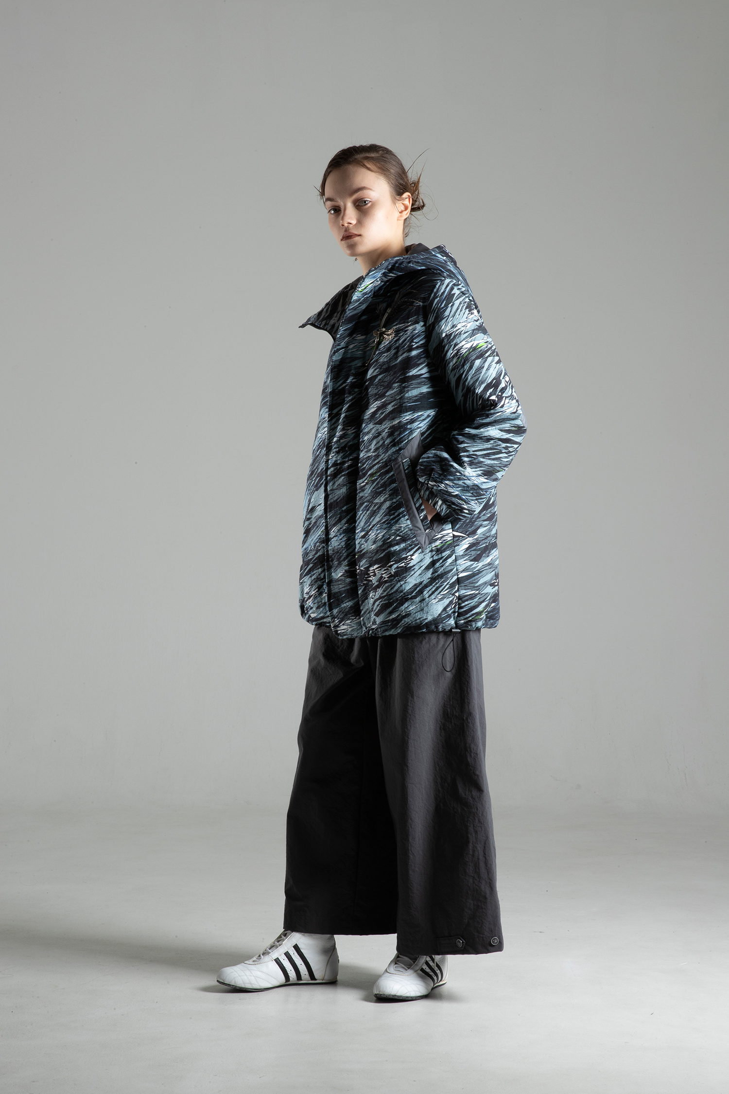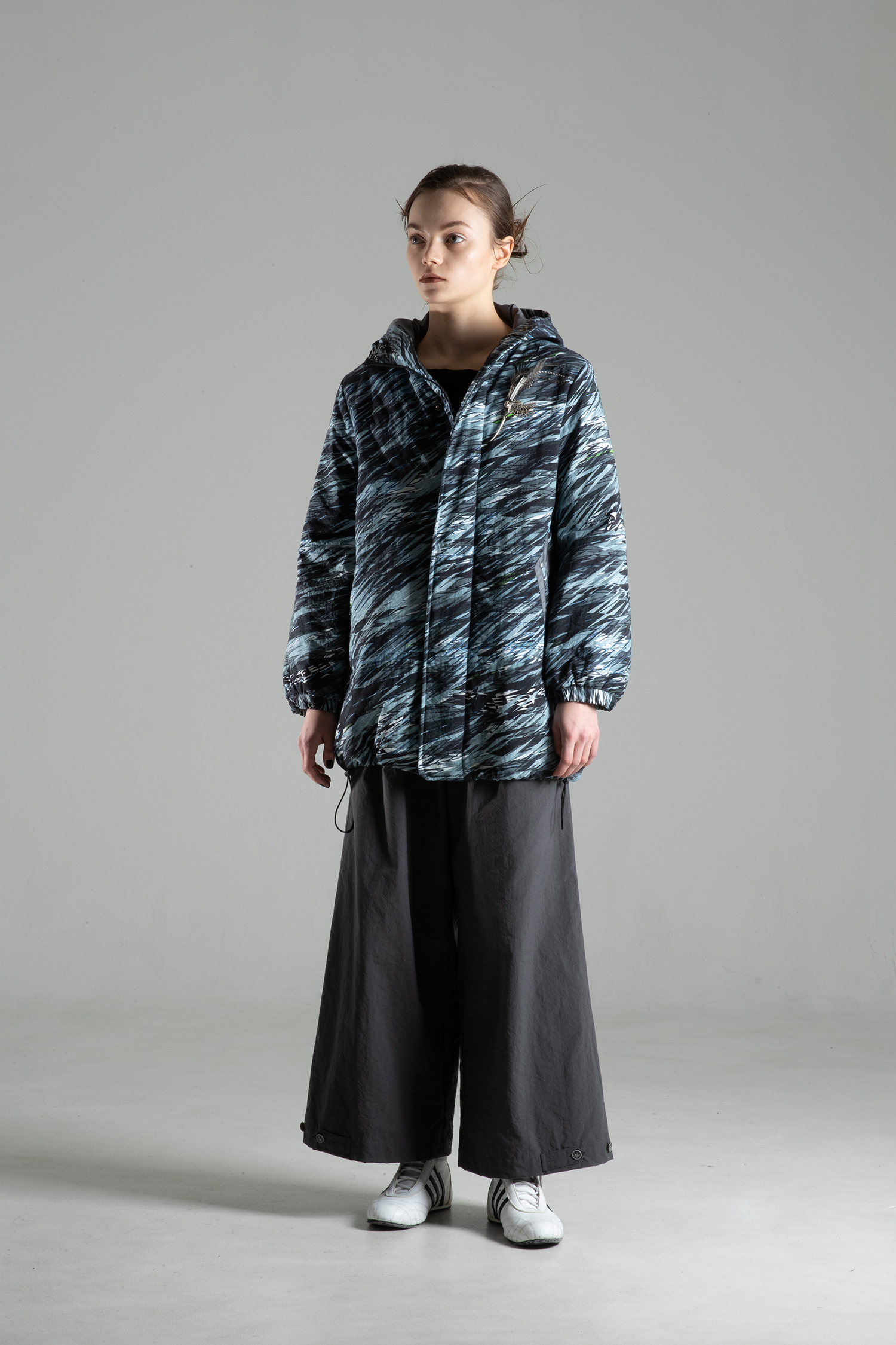 天然素材のような風合いと膨らみのあるナイロンオックス素材 “WILD IS THE WIND” プリントを使用した、袖にチャコールグレー色 リサイクルポリエステルタフタの肘当ての付いた、中綿入り、ファスナーとドットボタン開きのフードカラージャケット。