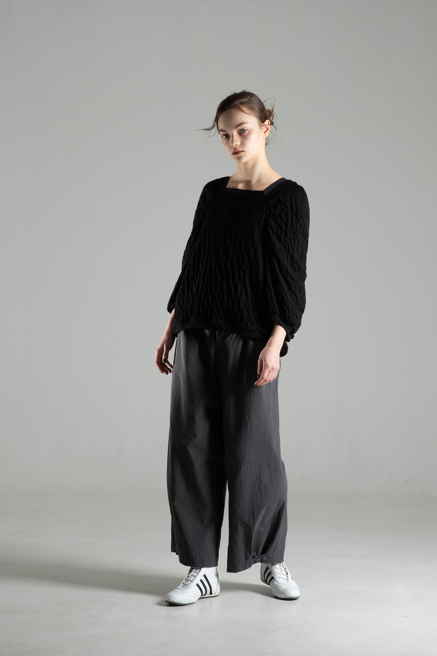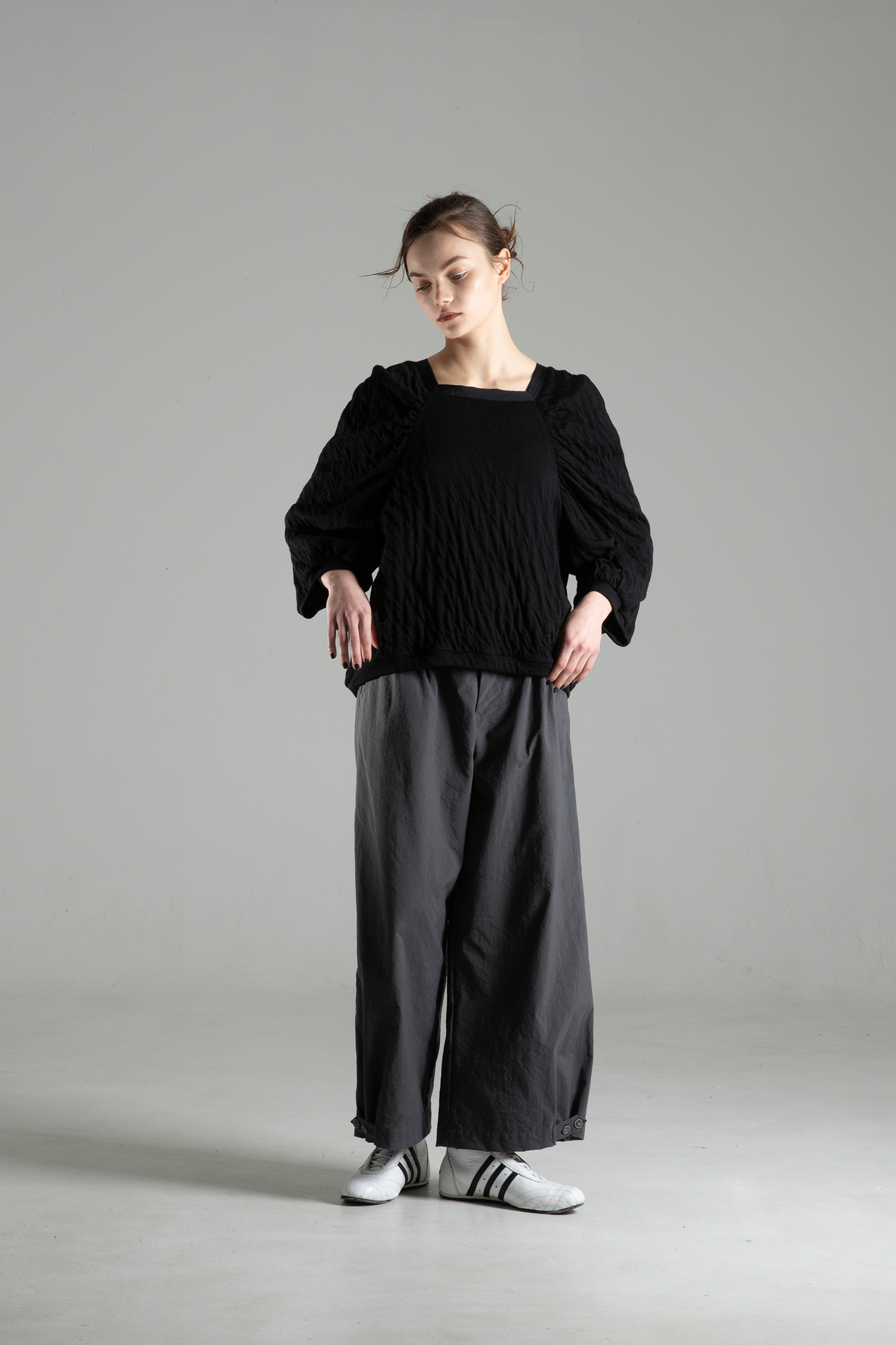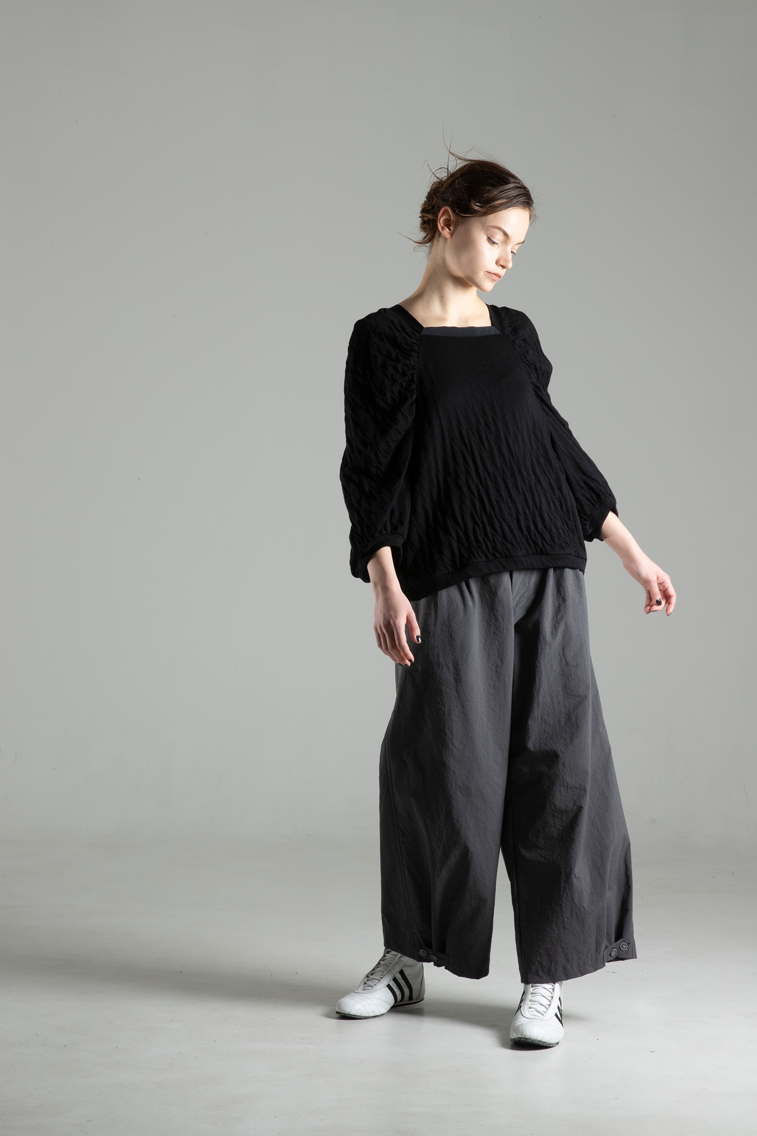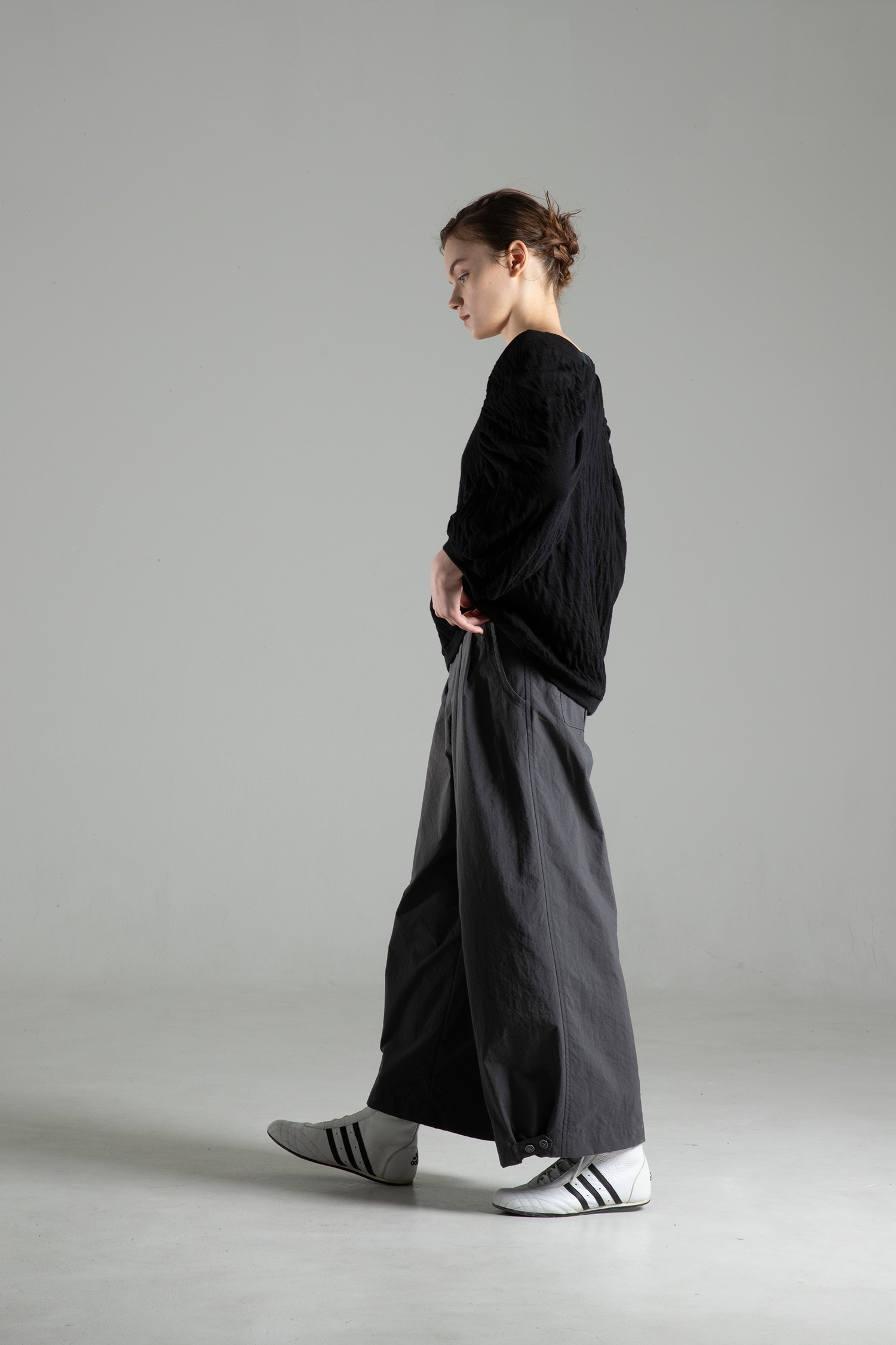 チャコール色 天然素材のような風合いと膨らみのあるナイロンオックス素材を使用した、裾に絞ることの出来るアジャスターボタン付きの、ワイドパンツ。