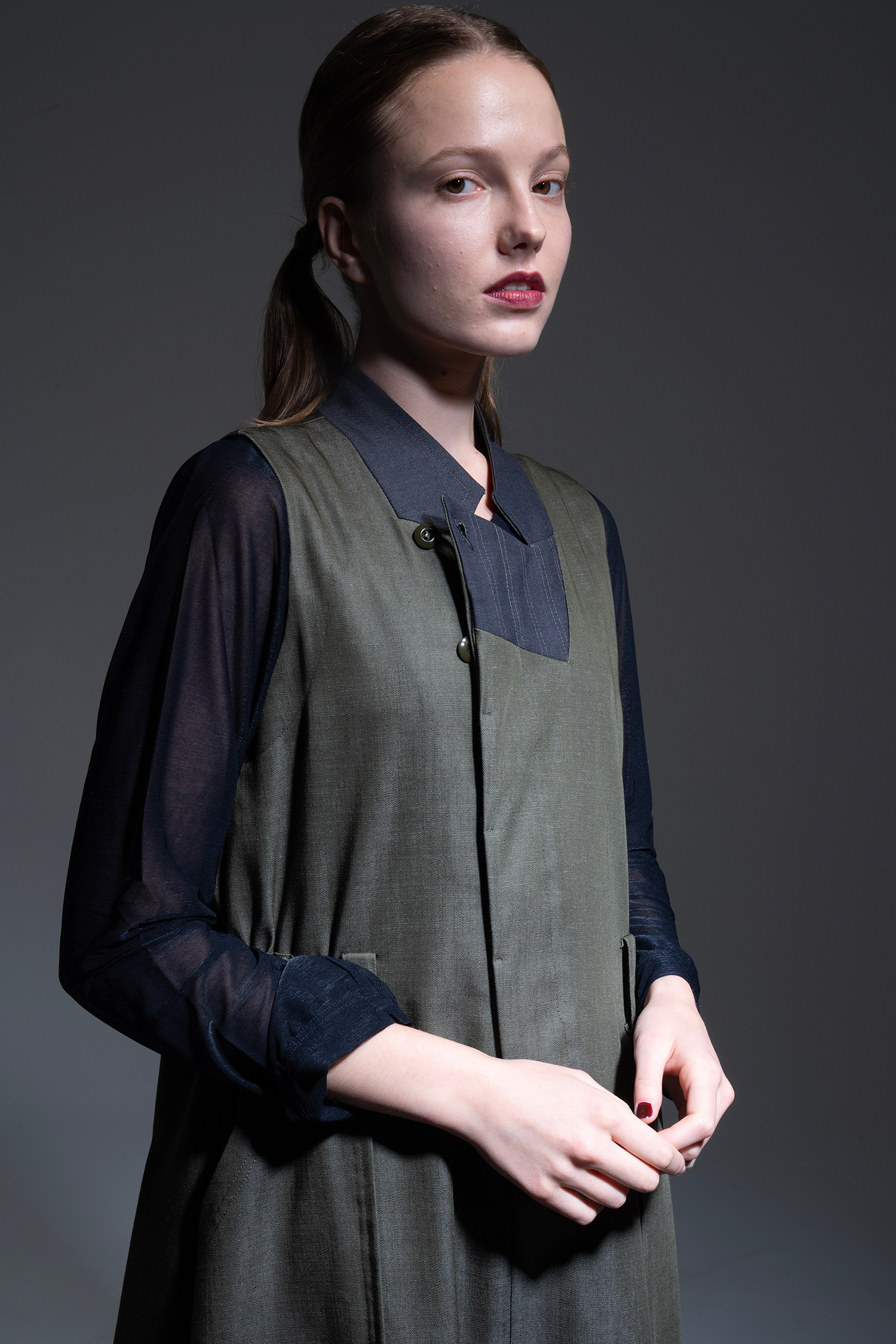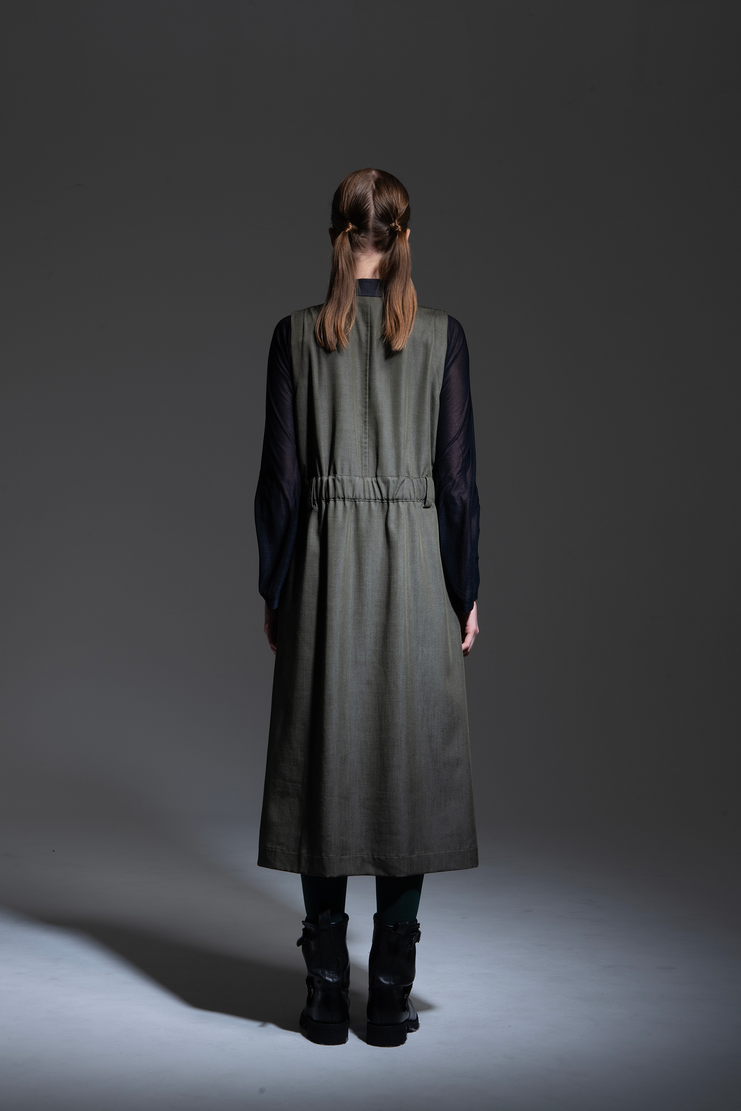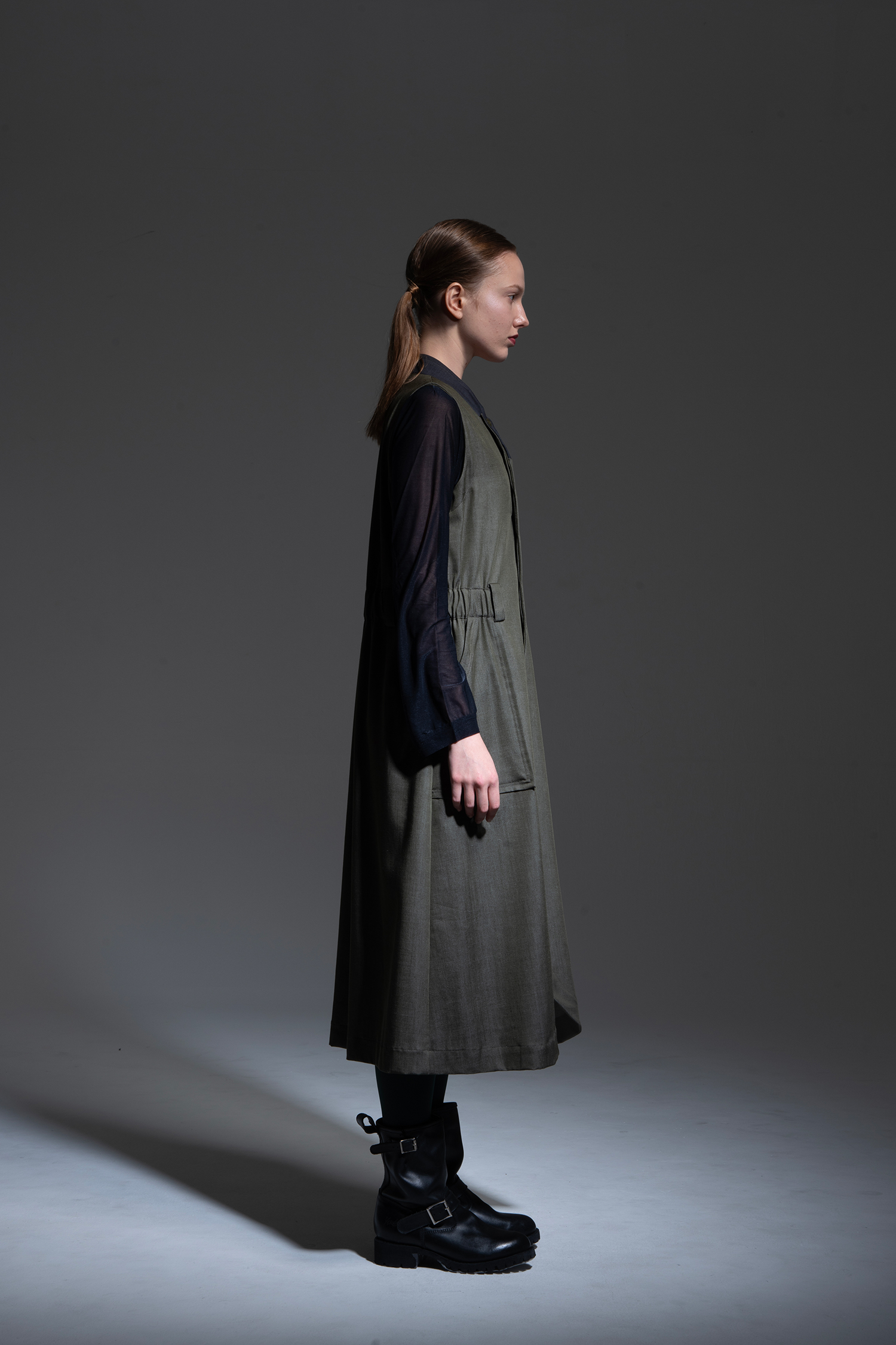 カーキ色 テンセル/トリアセテート/ポリエステルのデニムライクな素材を使用、襟元にチャコールグレー色ノンミュールジングウール/ポリエステルギャバジン素材を配した、ラペルを立てたようなデザインのノースリーブドレス。