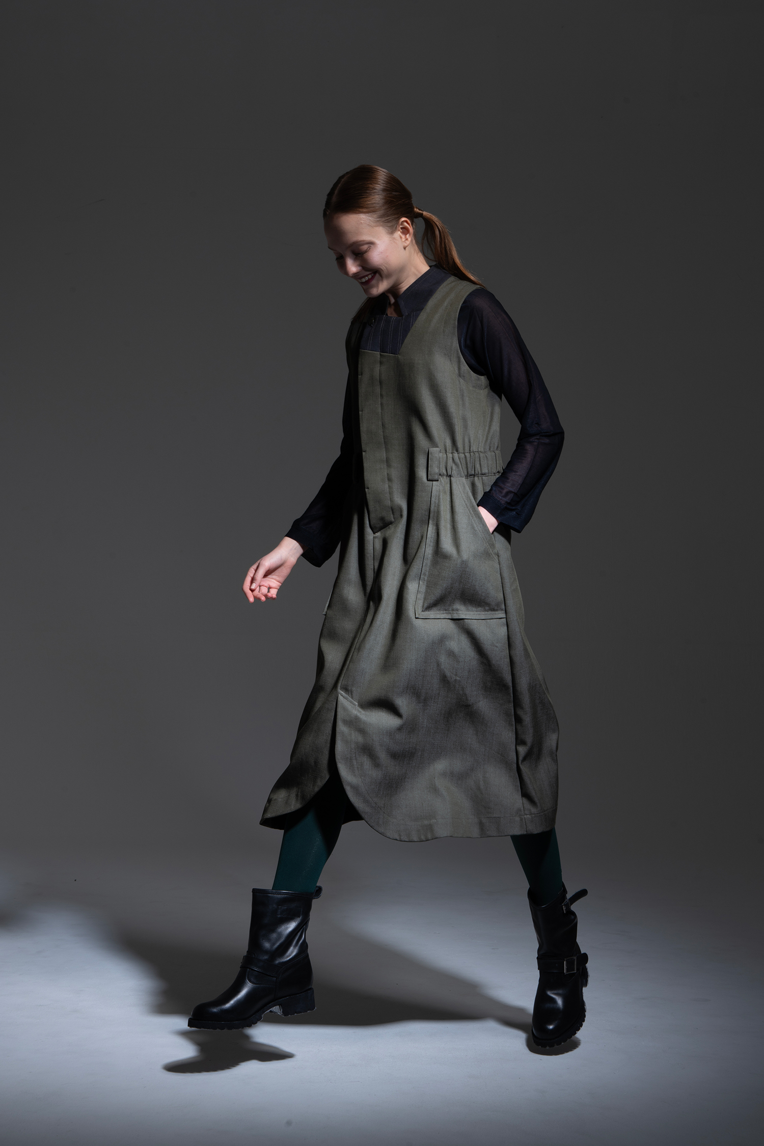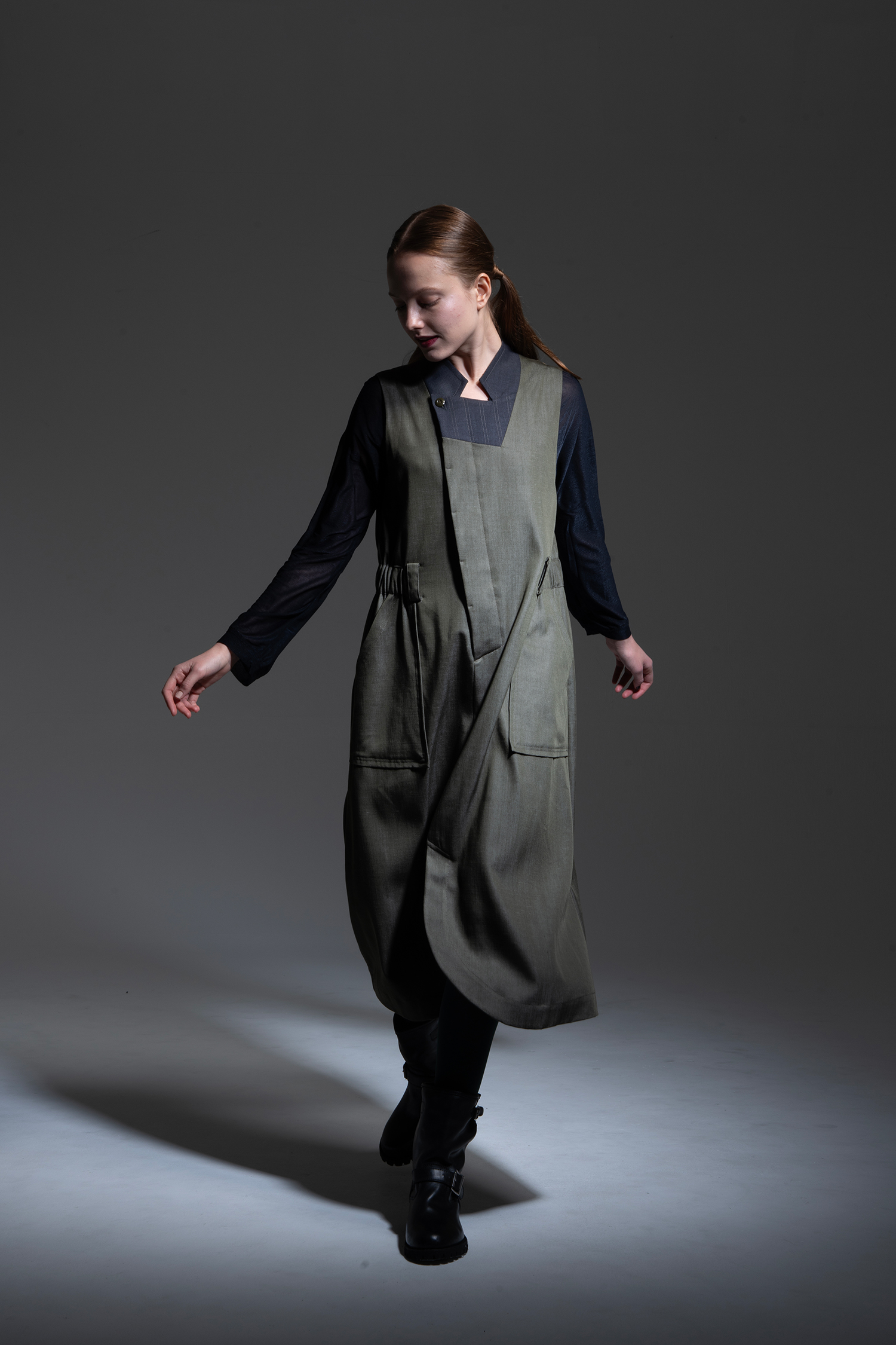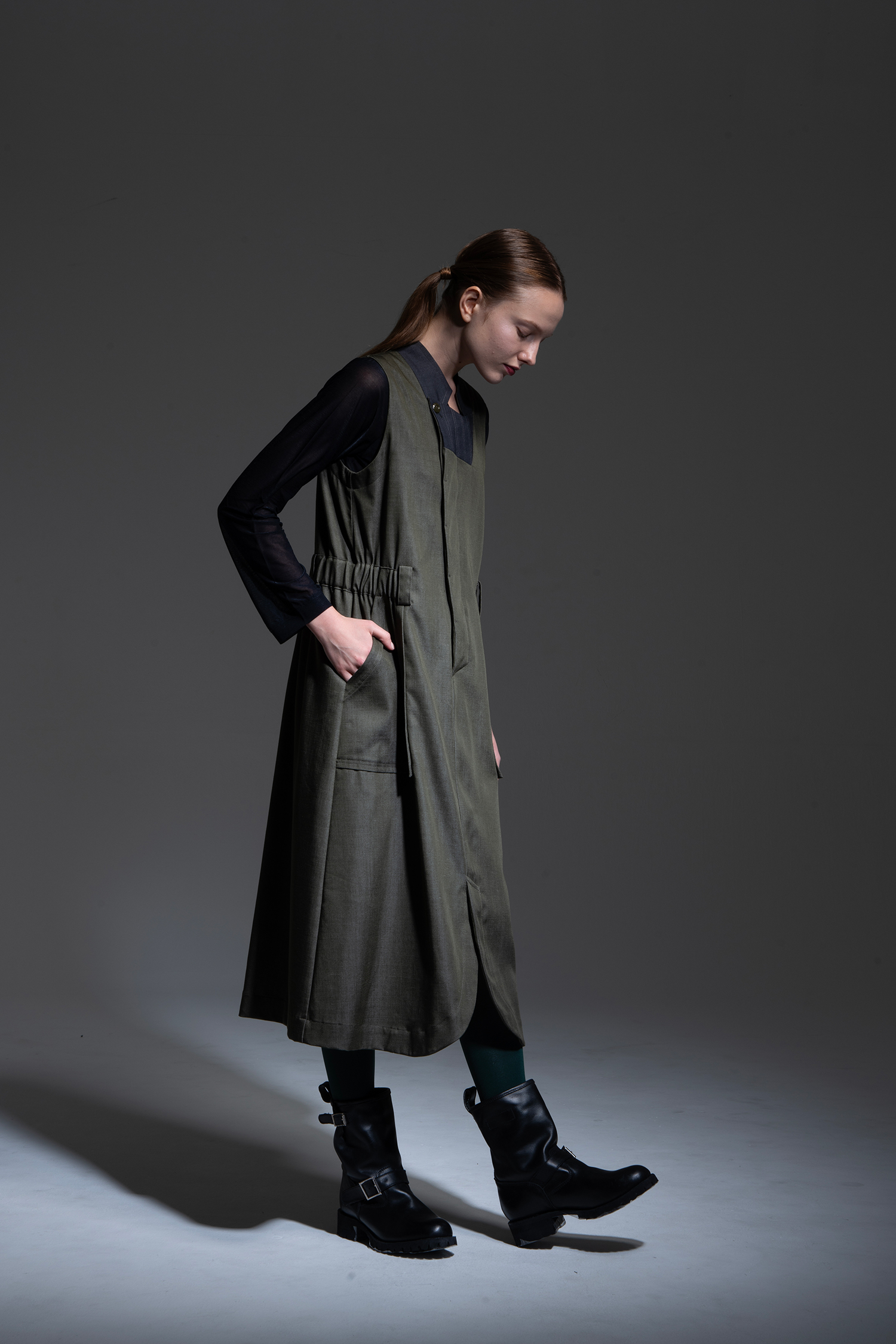 カーキ色 テンセル/トリアセテート/ポリエステルのデニムライクな素材を使用、襟元にチャコールグレー色ノンミュールジングウール/ポリエステルギャバジン素材を配した、ラペルを立てたようなデザインのノースリーブドレス。