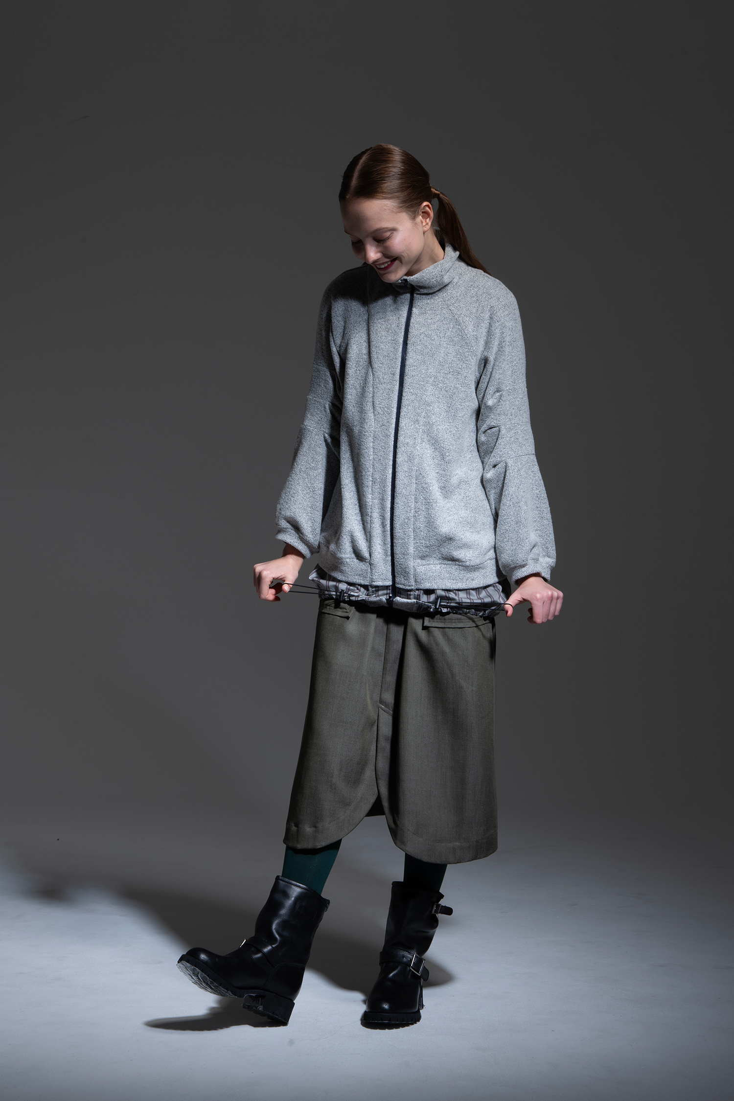 Long zip-up jumper in light gray shrunken wool jersey with three tiers of tucks at the sleeves and striped cupra at the hem.