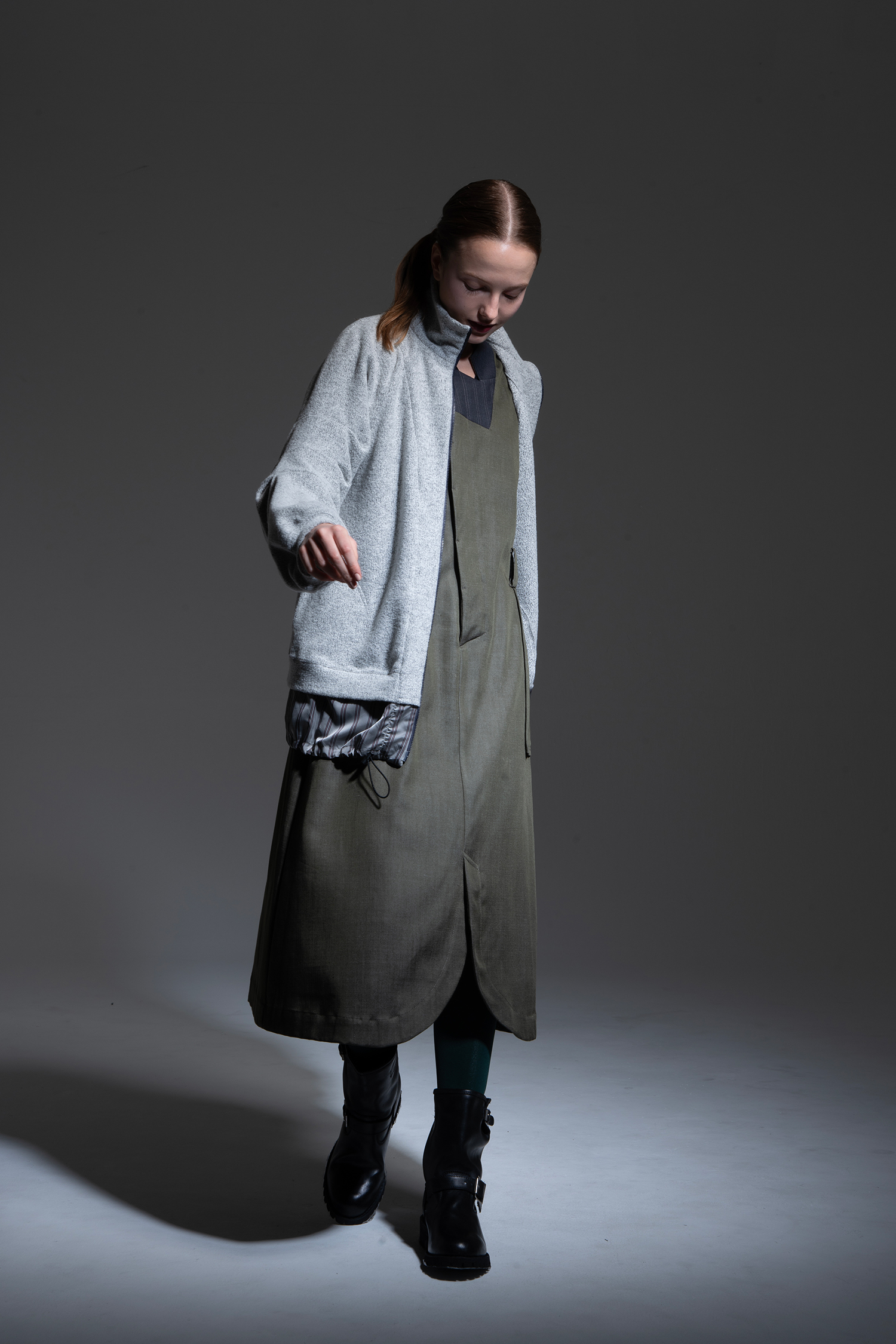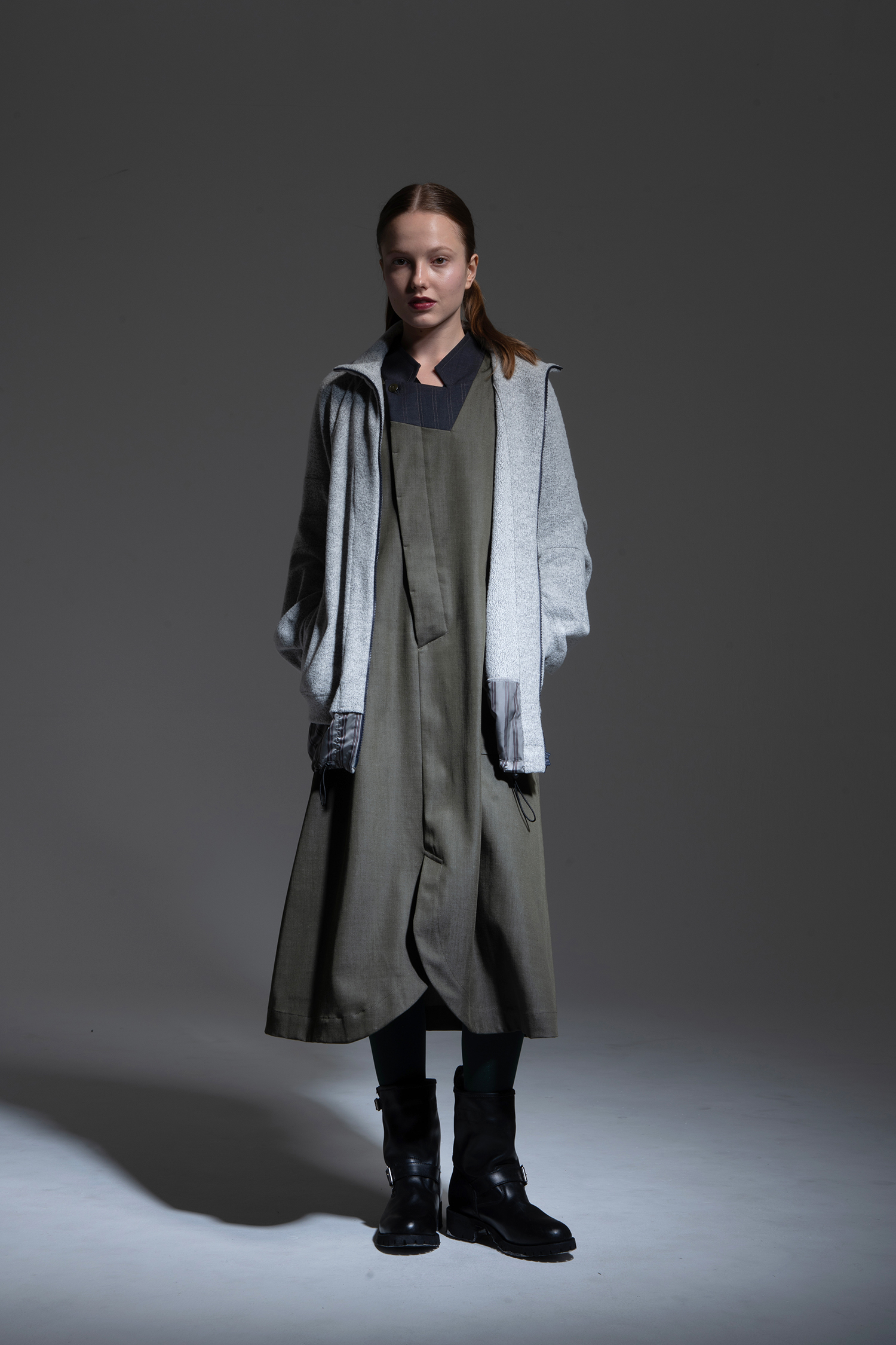 トップライトグレー色のウールブークレーアムンゼン素材を使用、袖に三段のタックを寄せ 裾にストライプ柄のキュプラ素材を組み合わせたジップアップロングブルゾン。