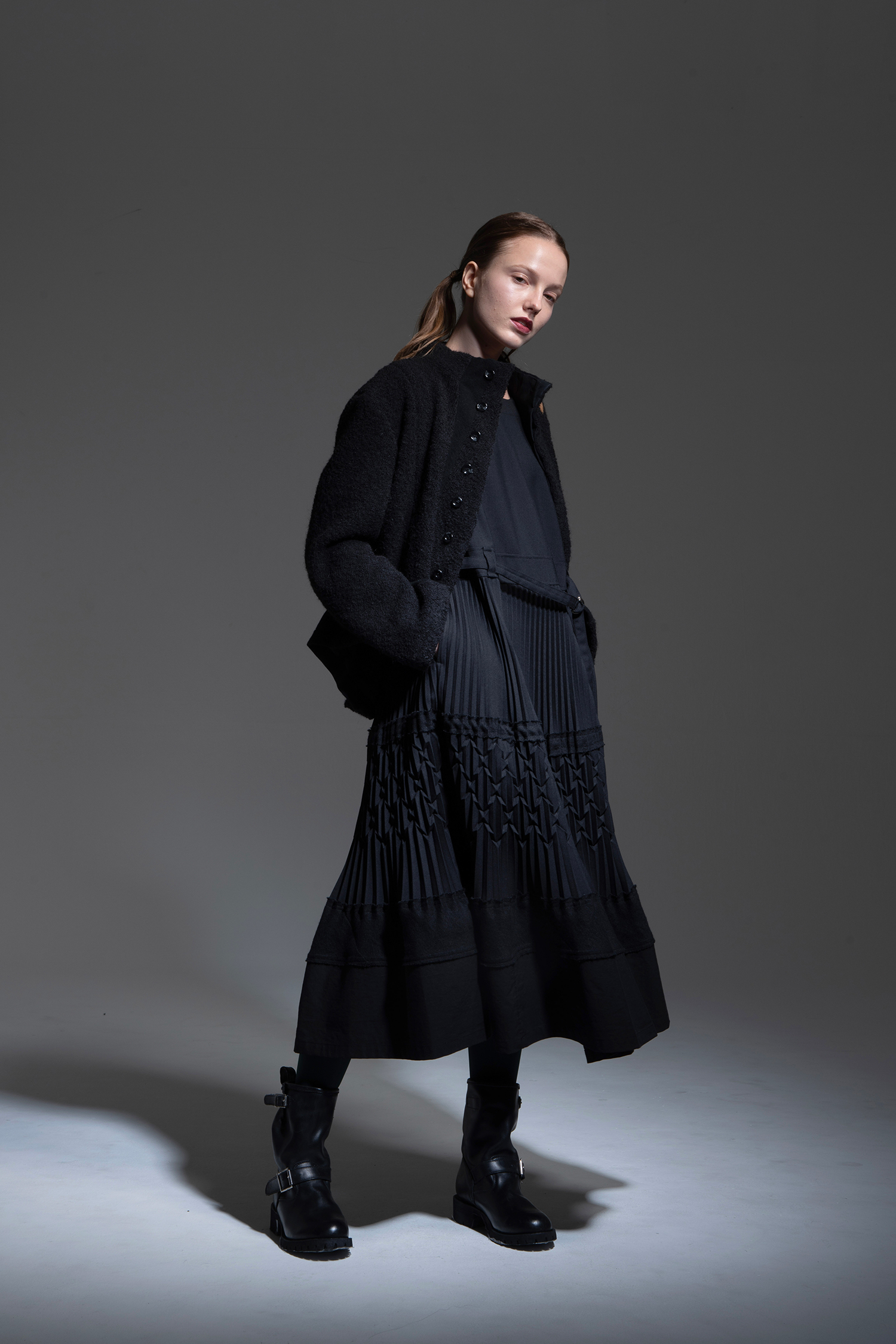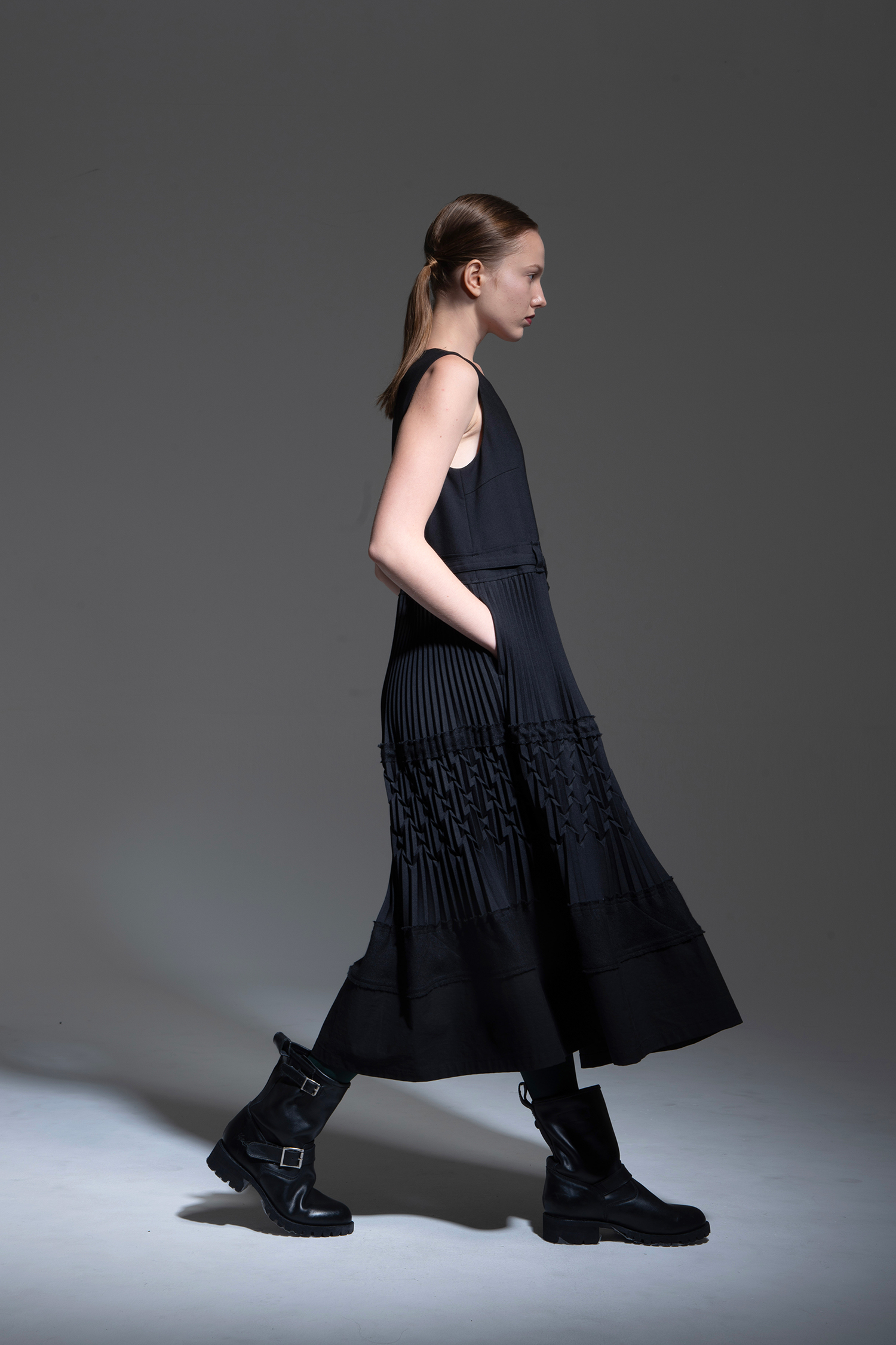 黒色 ノンミュールジングウール/ポリエステルギャバジン素材を使用、スカート部分にはアコーディオンプリーツの中に更にダイヤ柄のプリーツを入れ込み、裾には黒色ウールリネンギャバジンと黒色コットンタイプライターを二段に組み合わせた、ノーカラー ノースリーブのロングドレス。