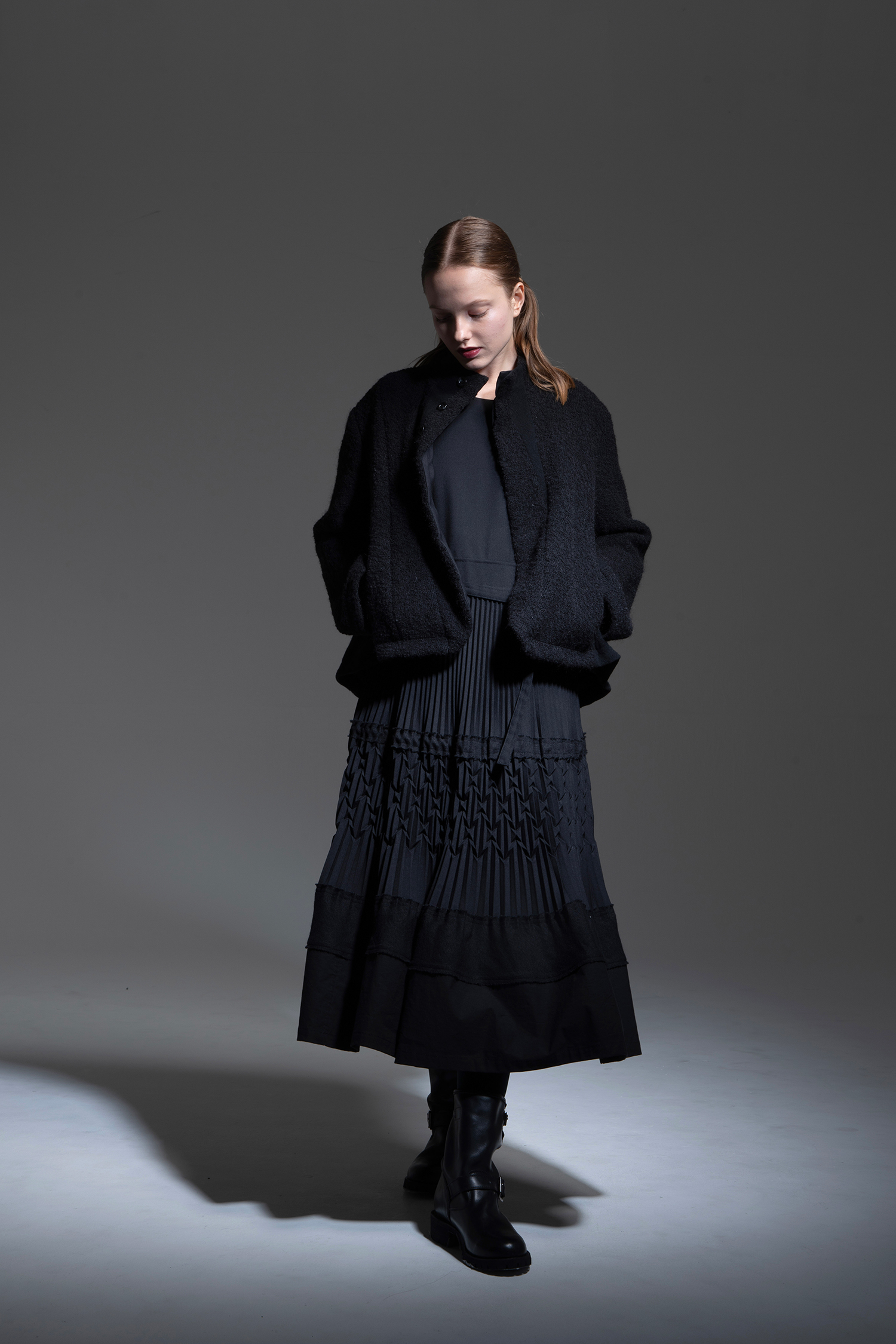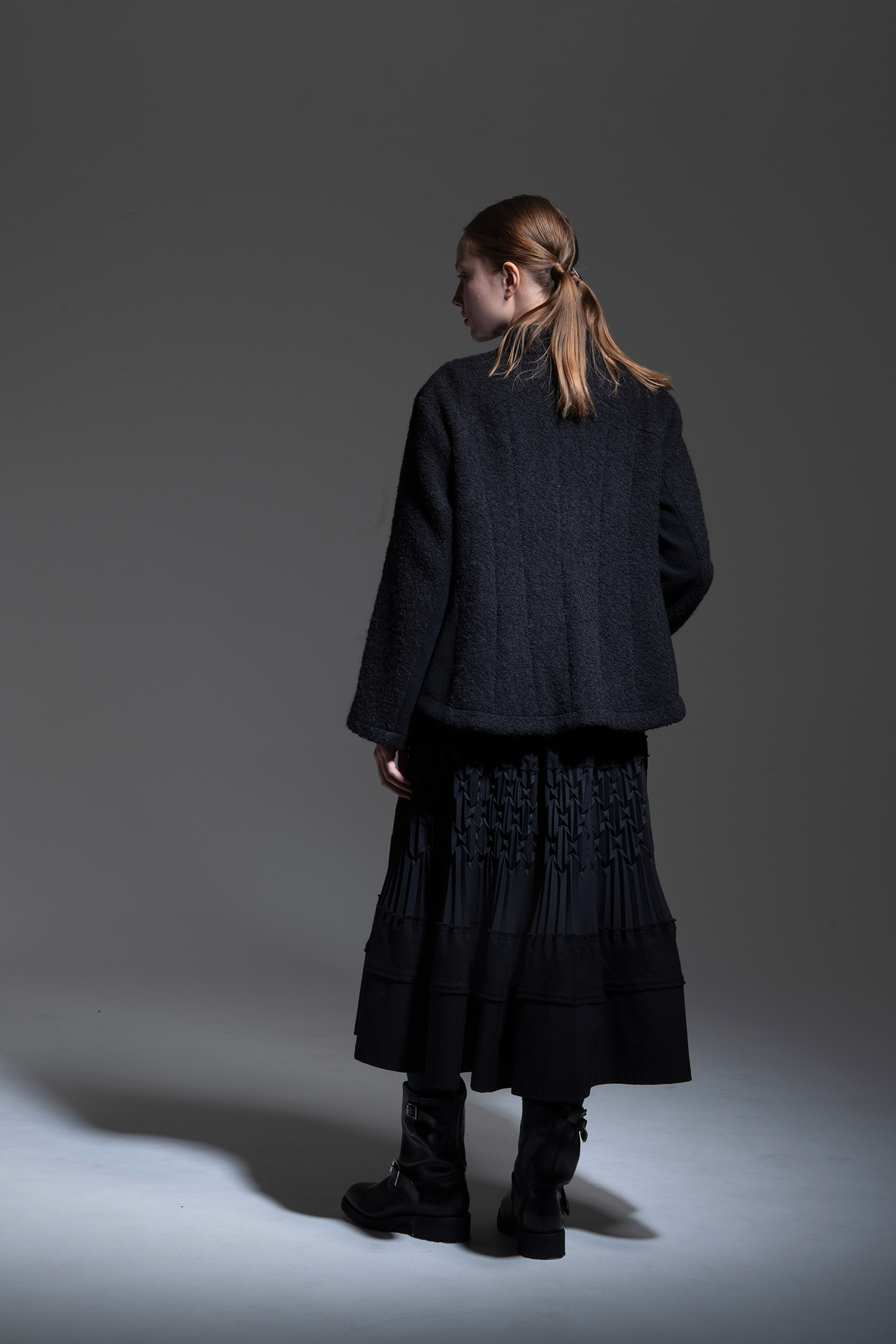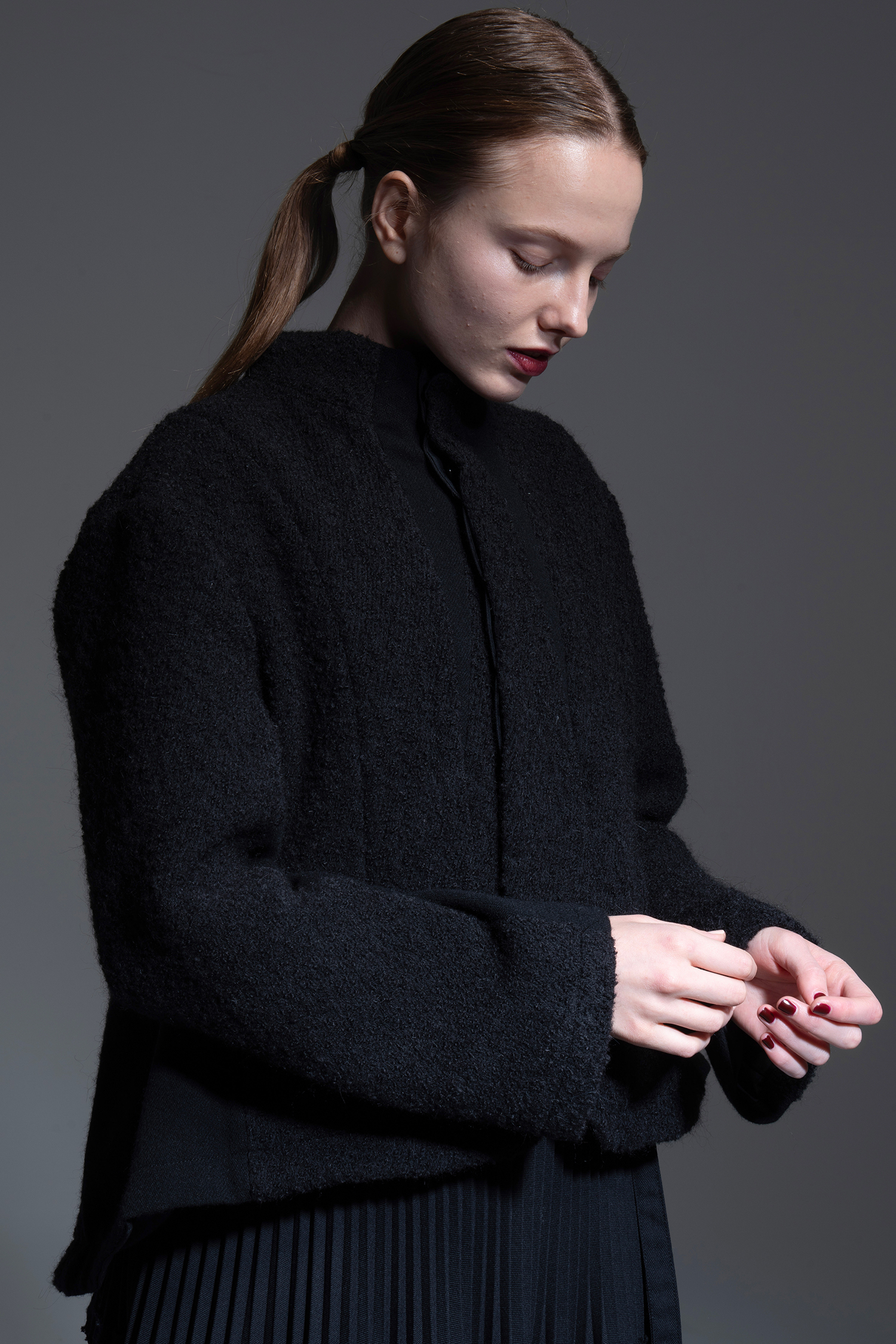 縮絨加工した黒色アルパカループツィード素材を使用、身頃に縦に多数の切り替えを入れシェイプしたシルエットのスタンドカラージャケット。