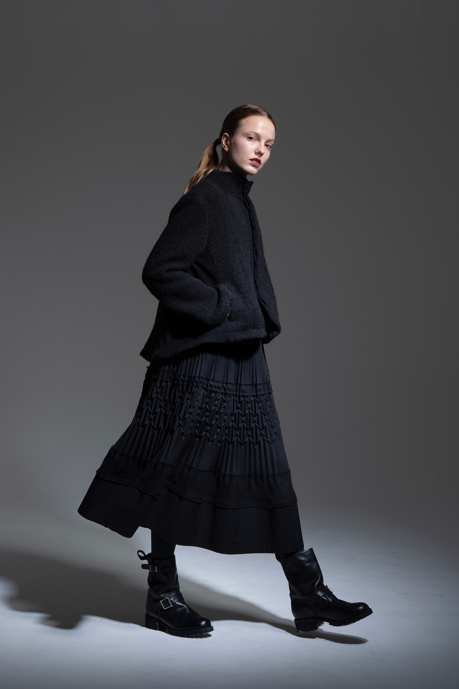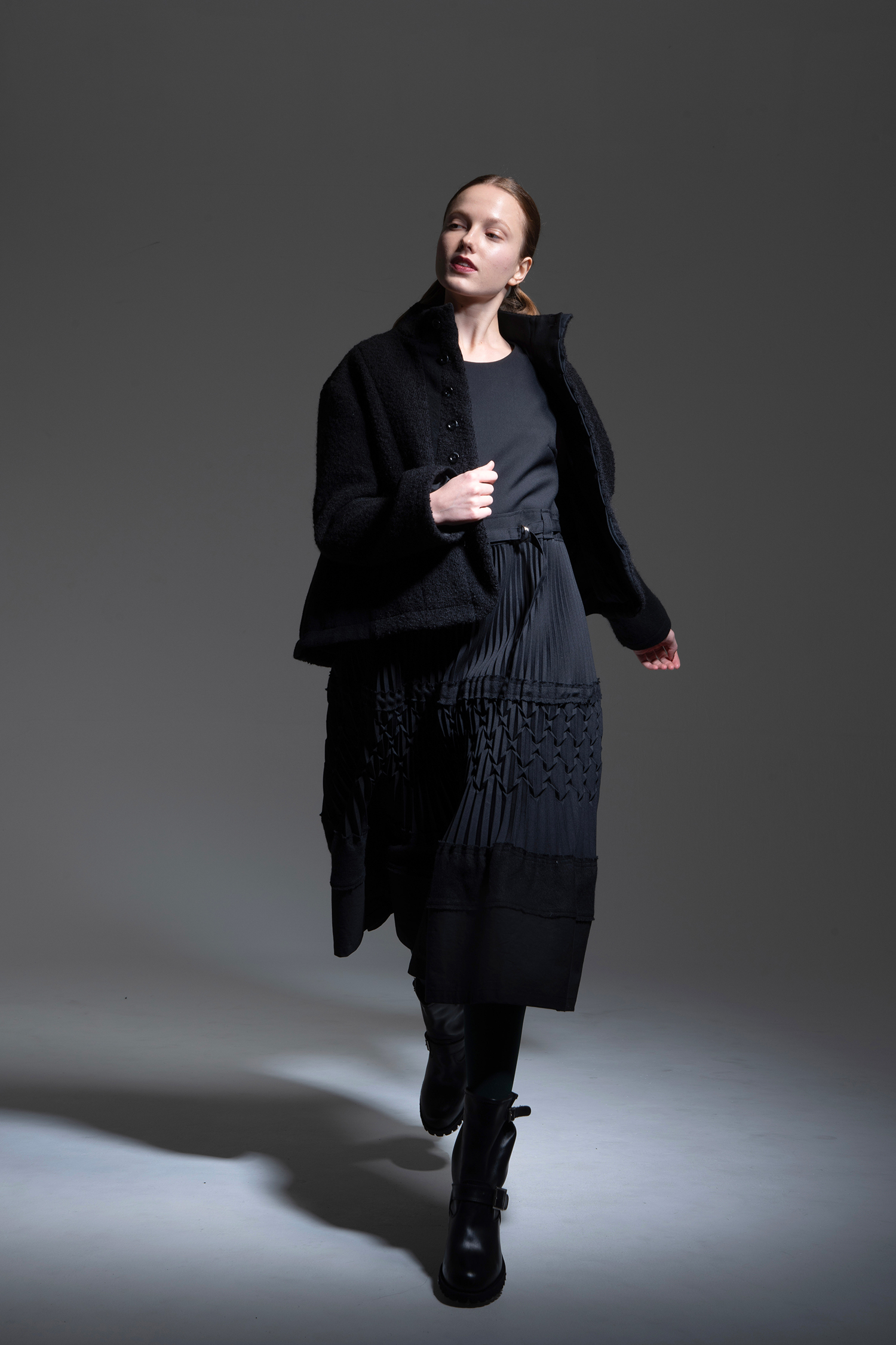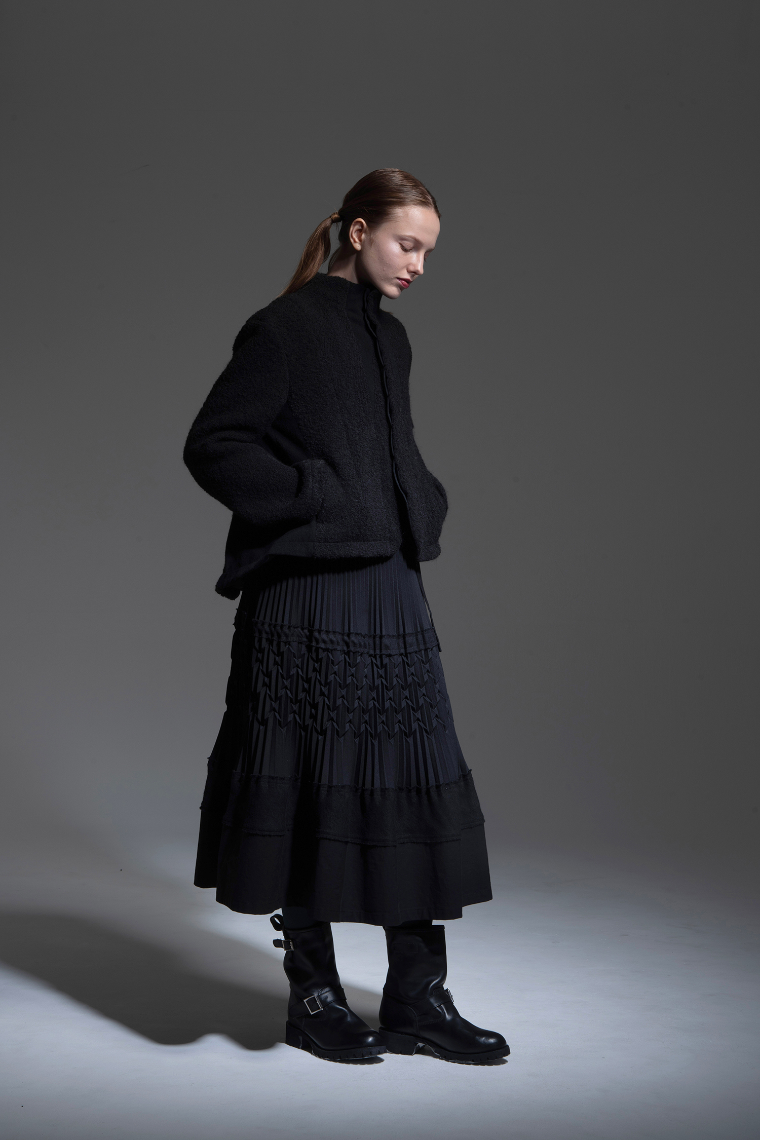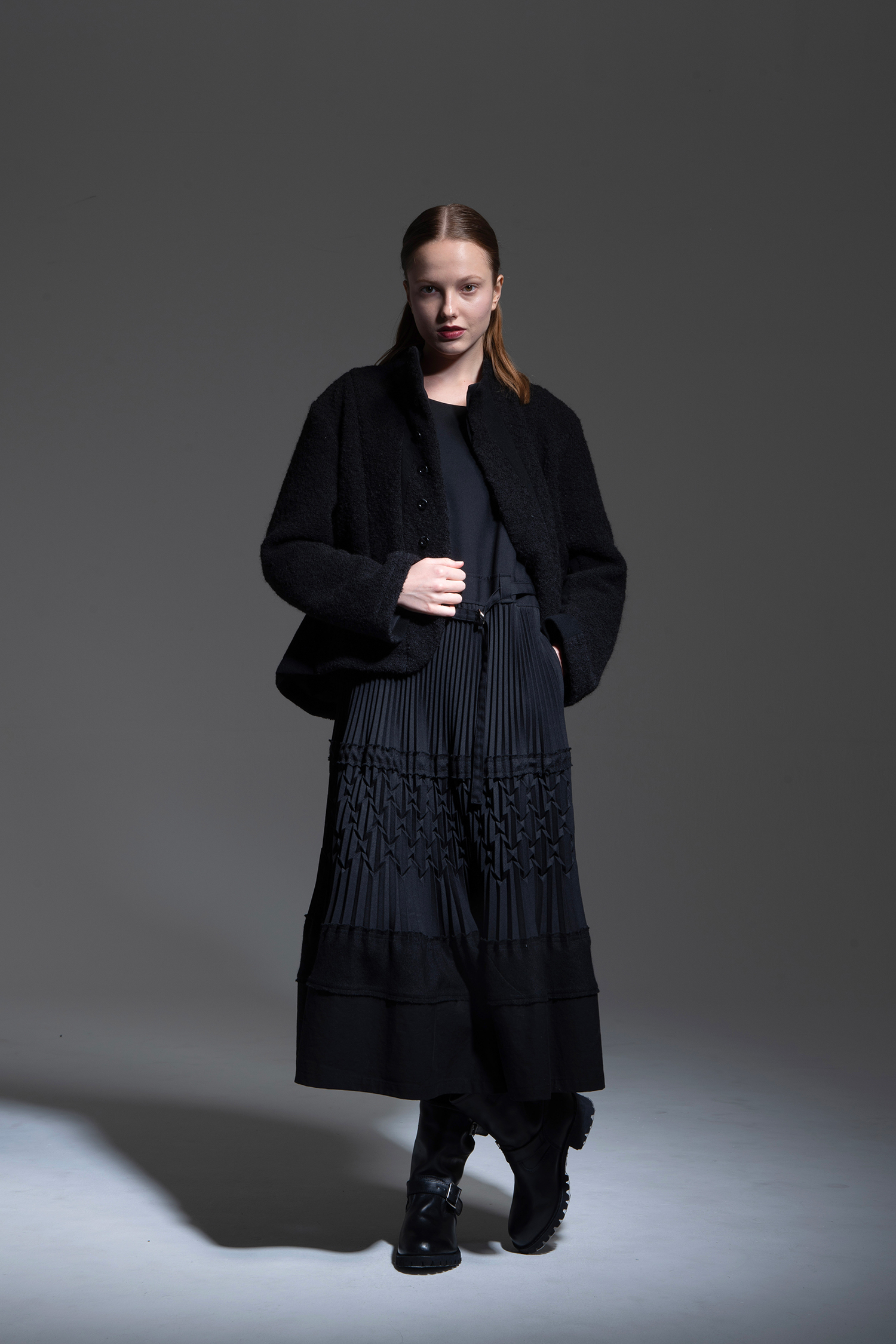 縮絨加工した黒色アルパカループツィード素材を使用、身頃に縦に多数の切り替えを入れシェイプしたシルエットのスタンドカラージャケット。