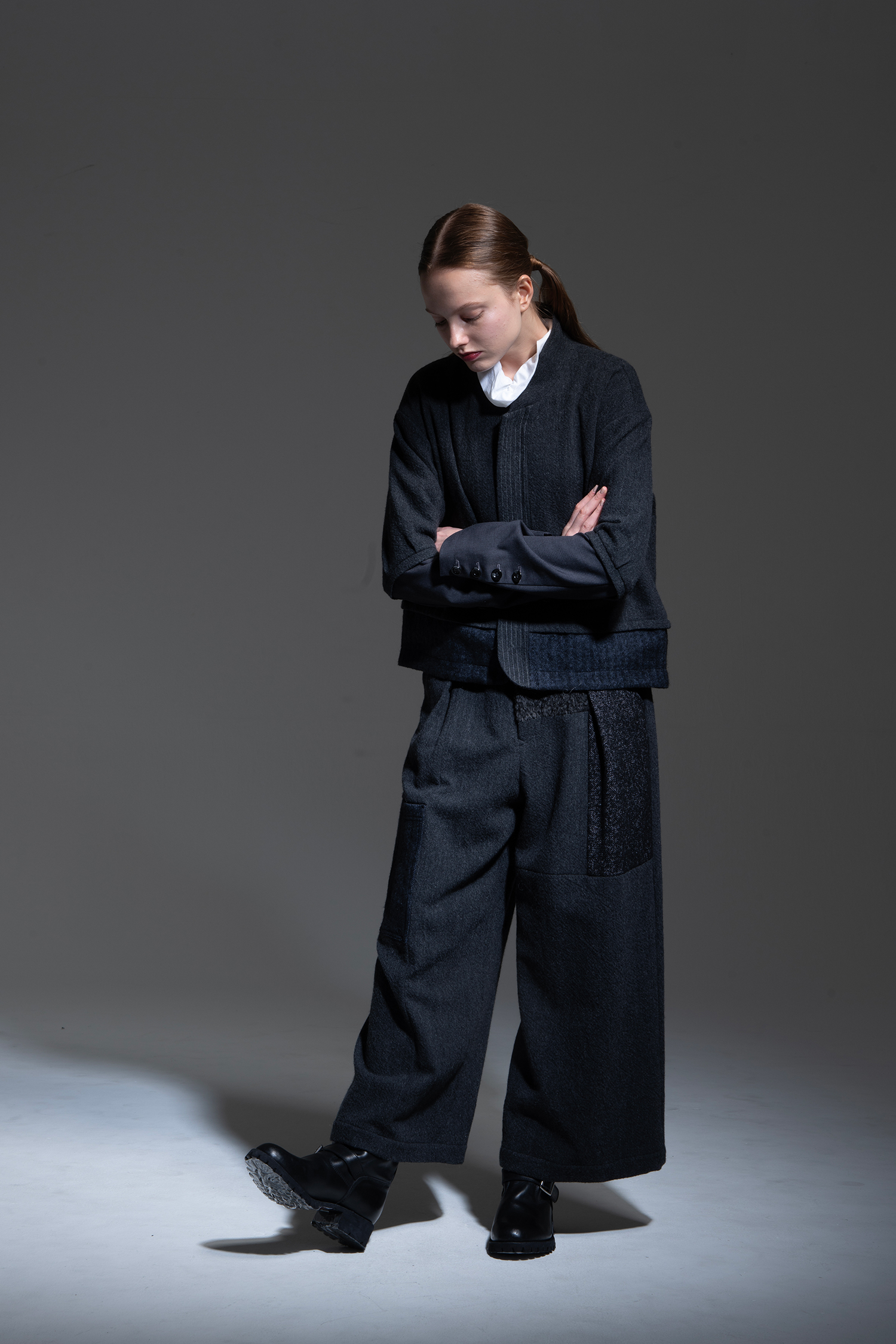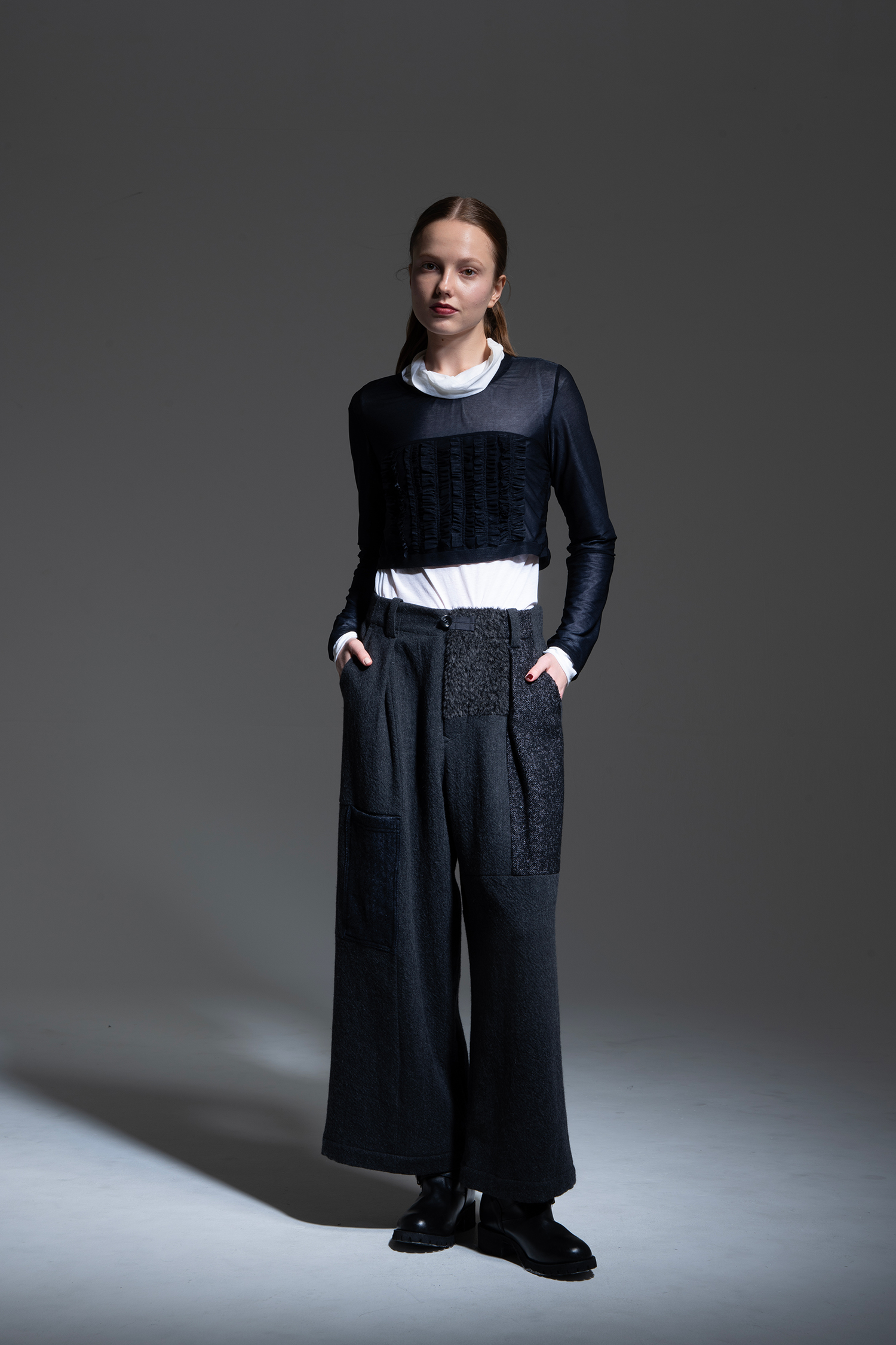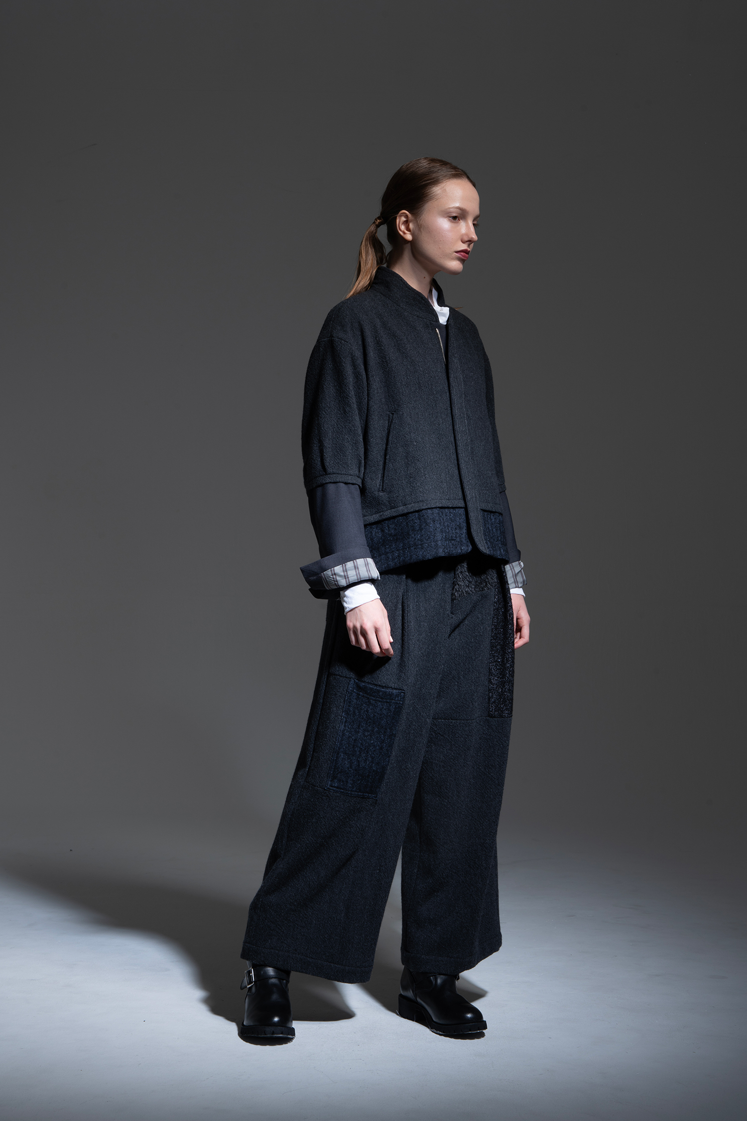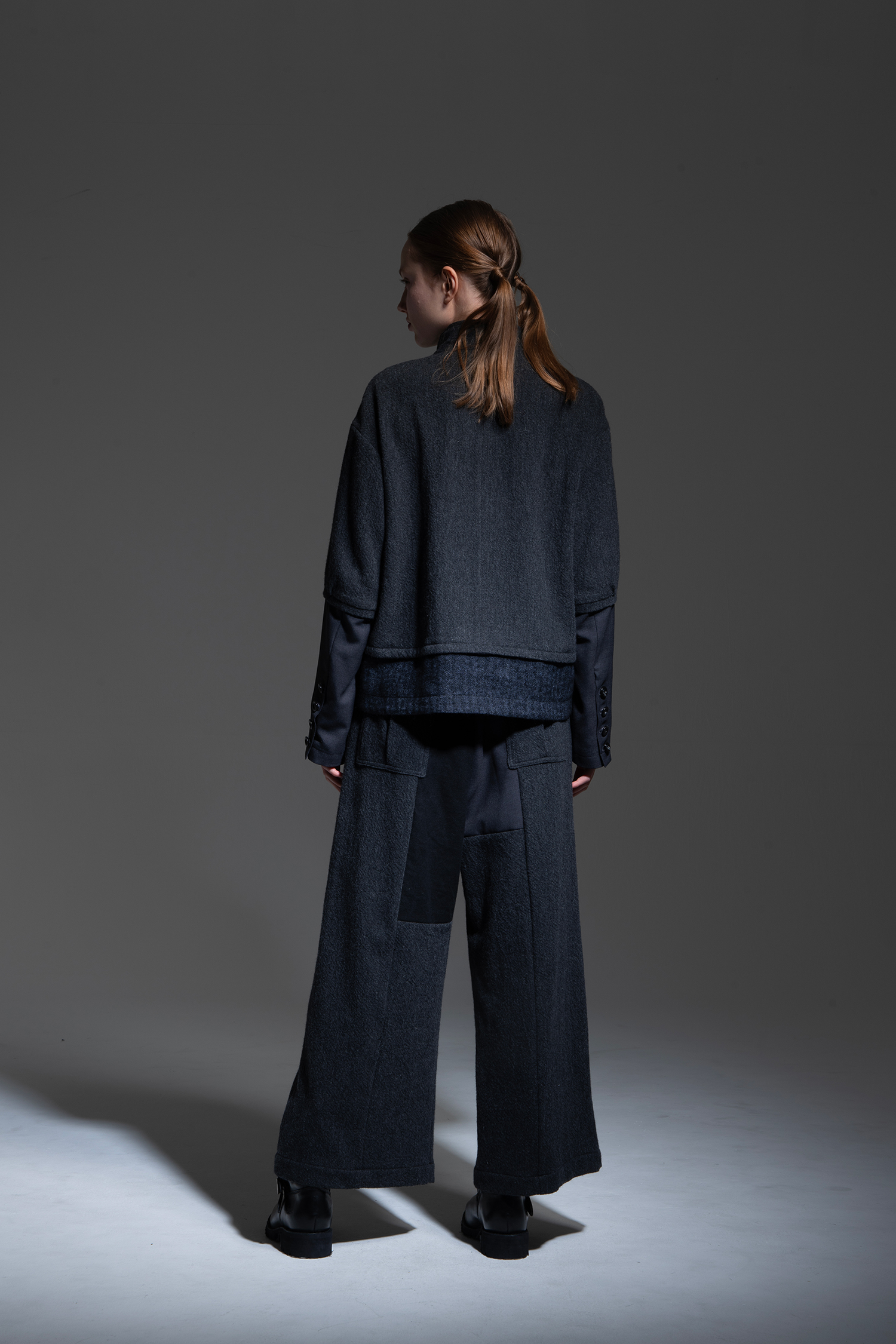 Wide pants in charcoal wool tweed with a patchwork of charcoal alpaca shaggy, black melange loop tweed, dark blue wool/linen herringbone, charcoal non-mulesing wool/polyester gabardine, and black cotton/linen gabardine.