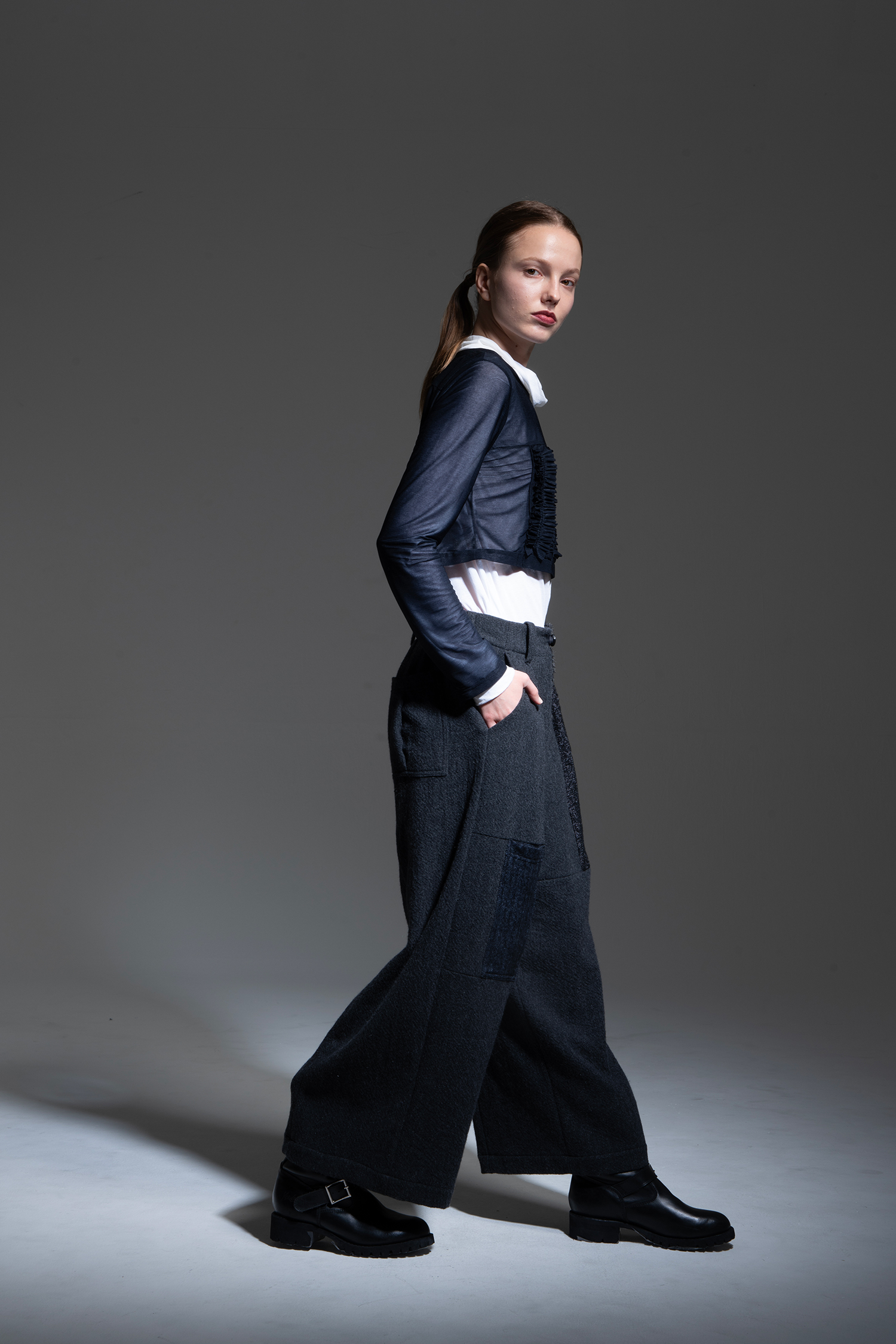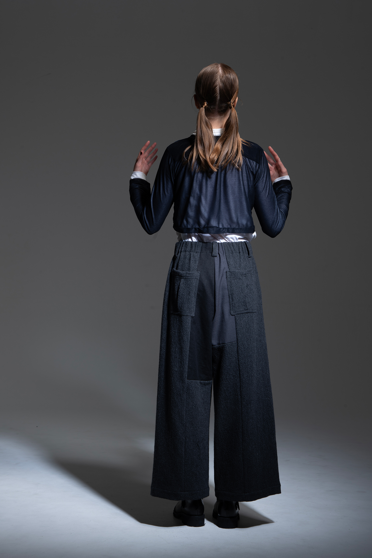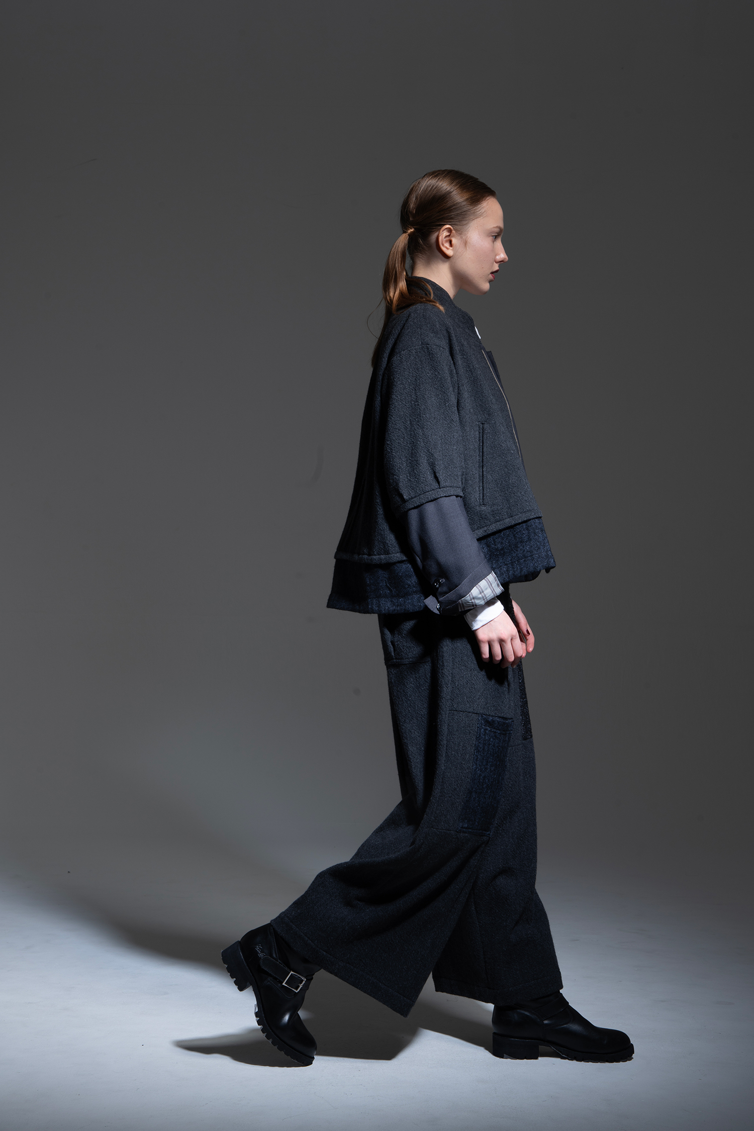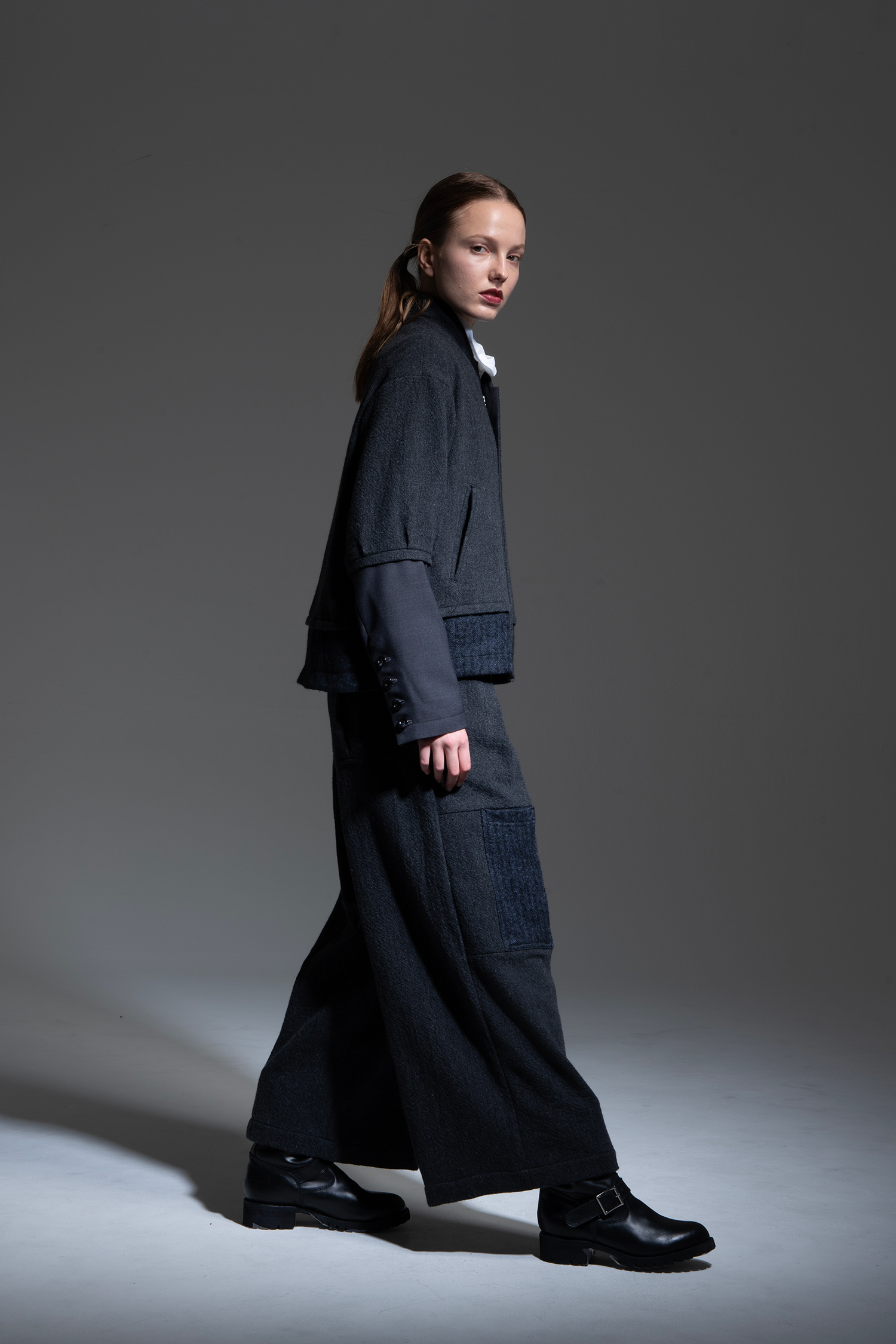 Wide pants in charcoal wool tweed with a patchwork of charcoal alpaca shaggy, black melange loop tweed, dark blue wool/linen herringbone, charcoal non-mulesing wool/polyester gabardine, and black cotton/linen gabardine.