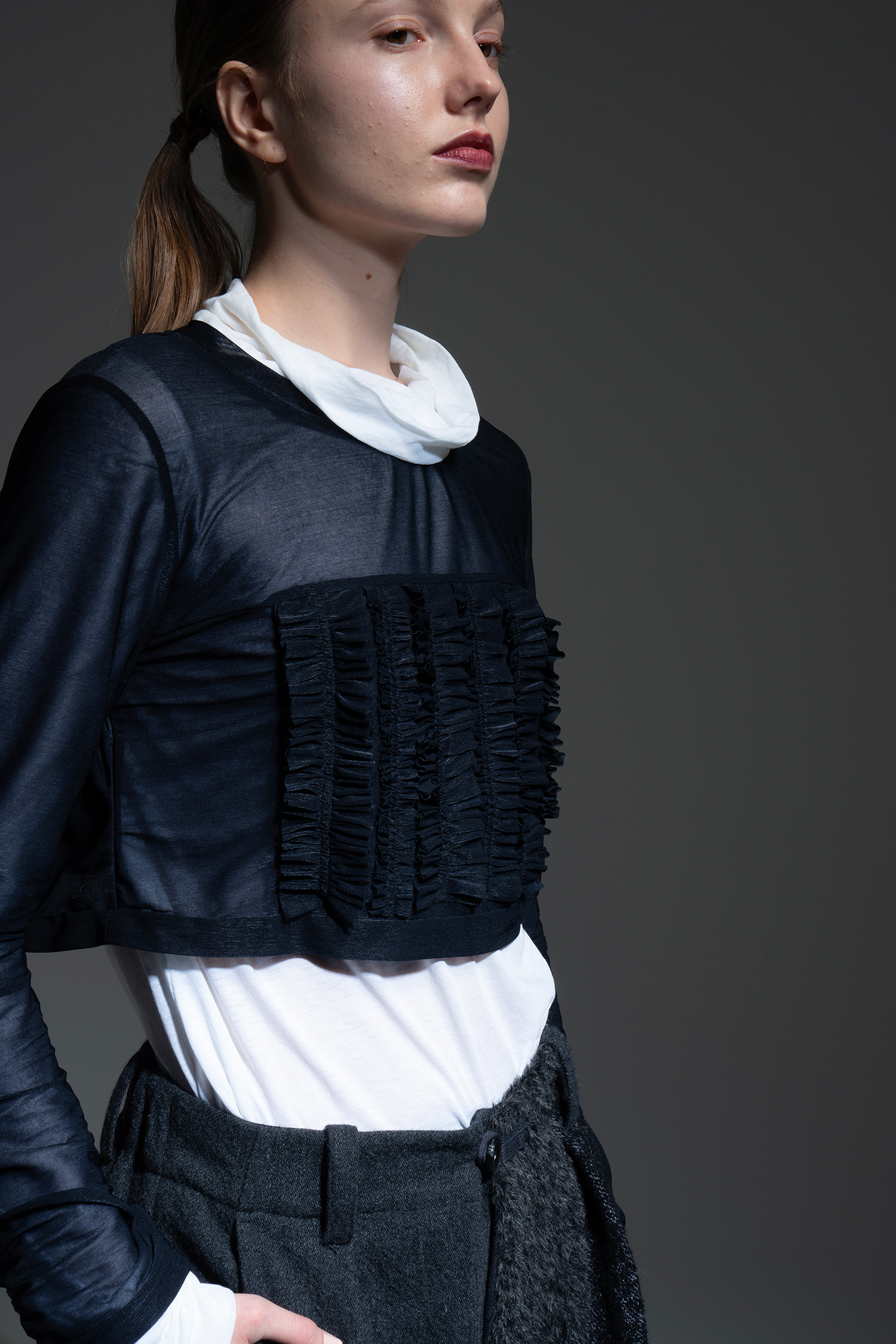 濃紺色 トランスペアレント ポリエステル天竺素材を使用、胸にフリルのデコレーションをあしらった長袖ショート丈 T-シャツ。