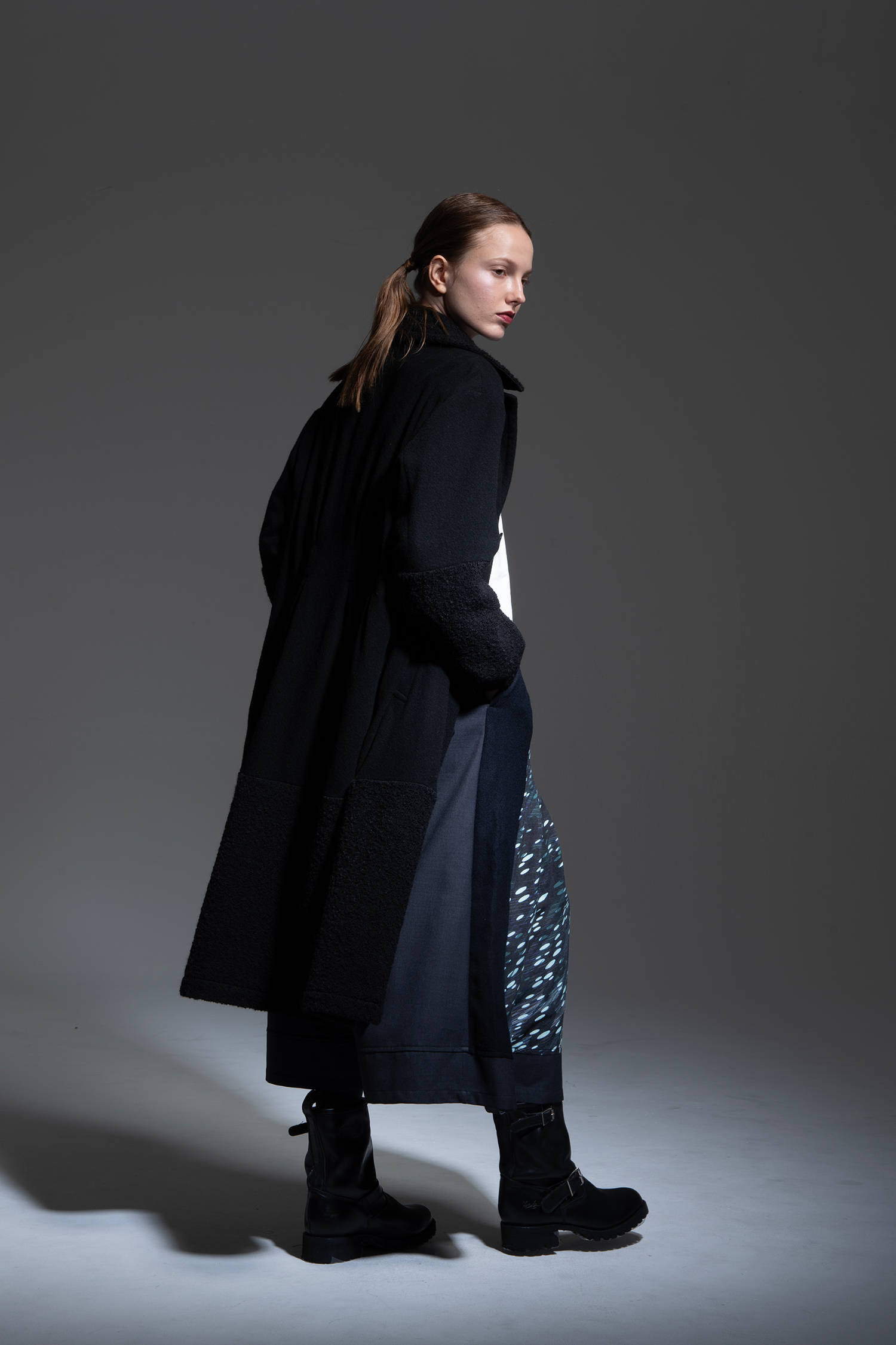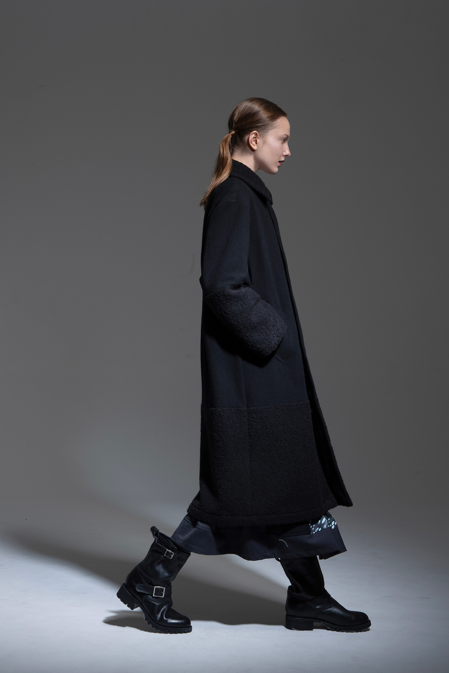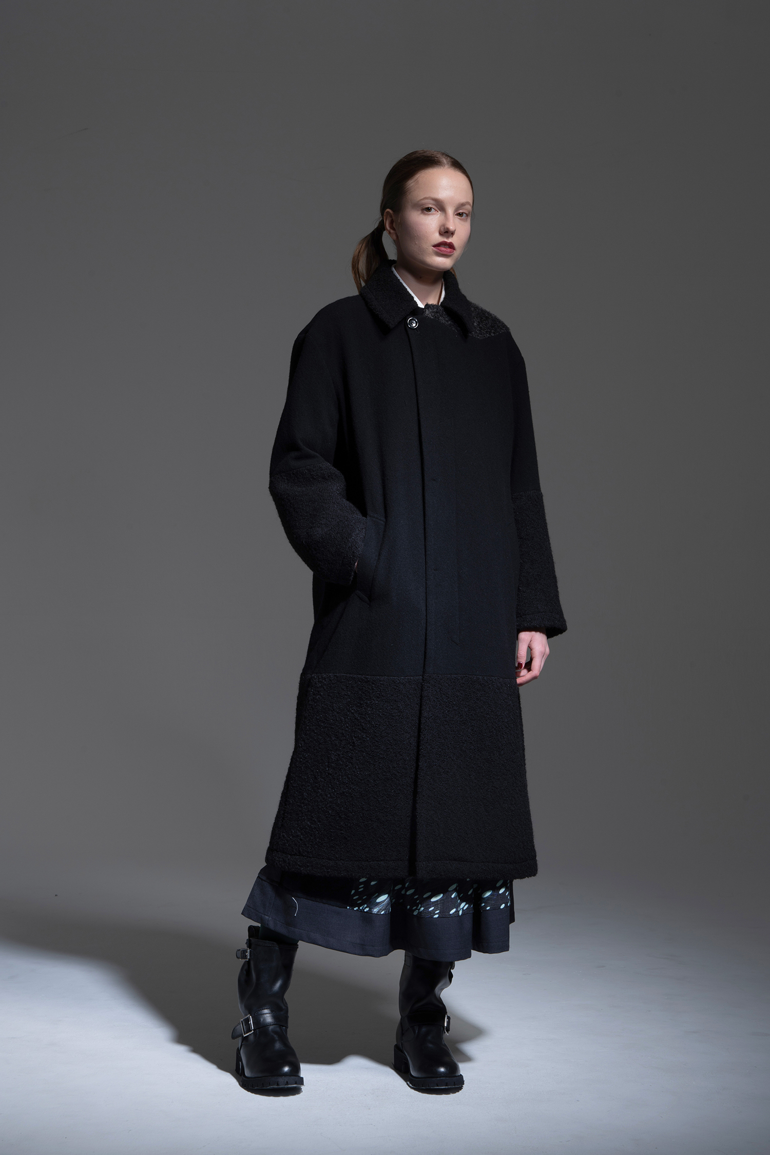 Long black wool tweed coat with fly front with shrunken black alpaca loop tweed at the front collar, cuffs, and hem, and charcoal alpaca shaggy fabric at the left shoulder.