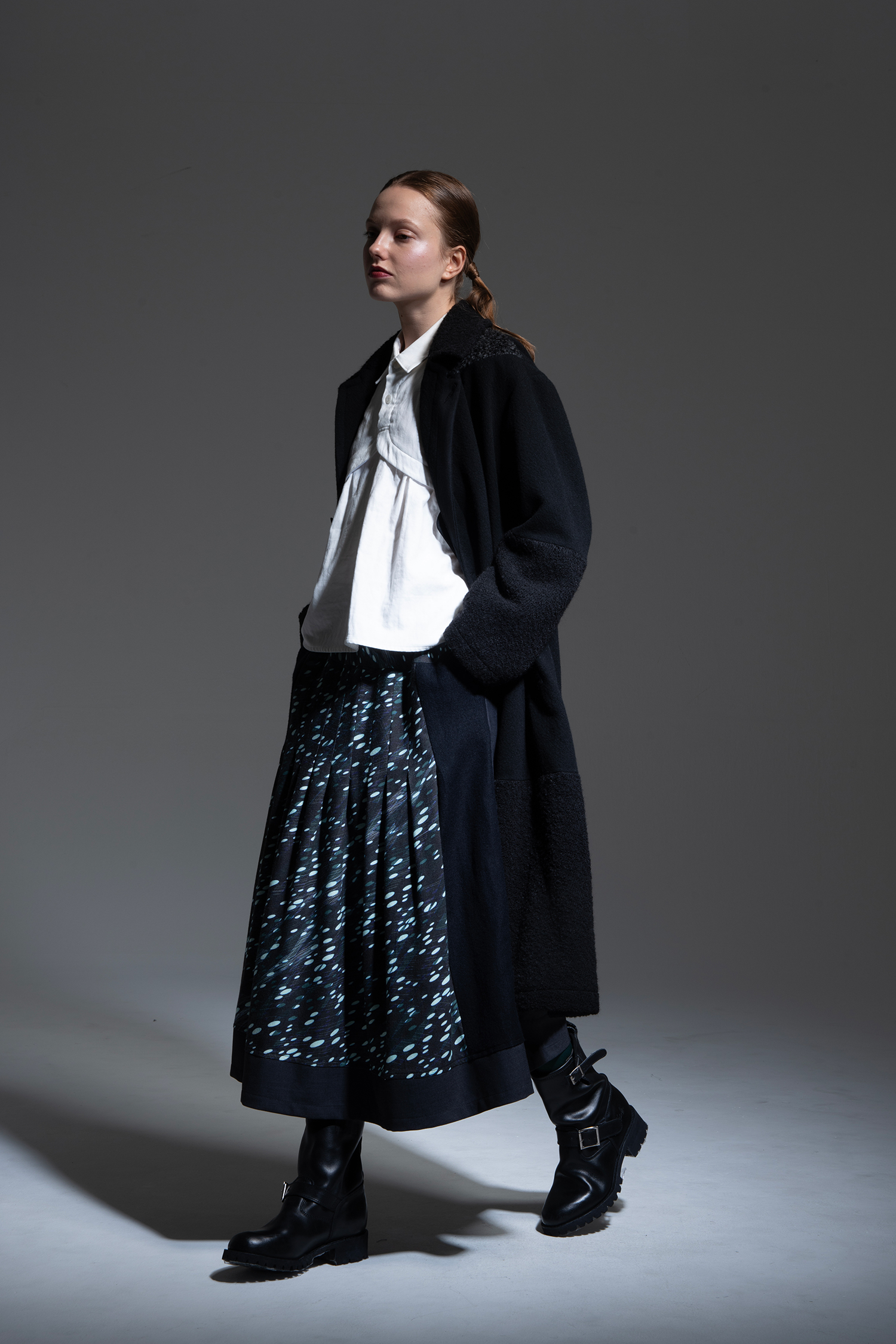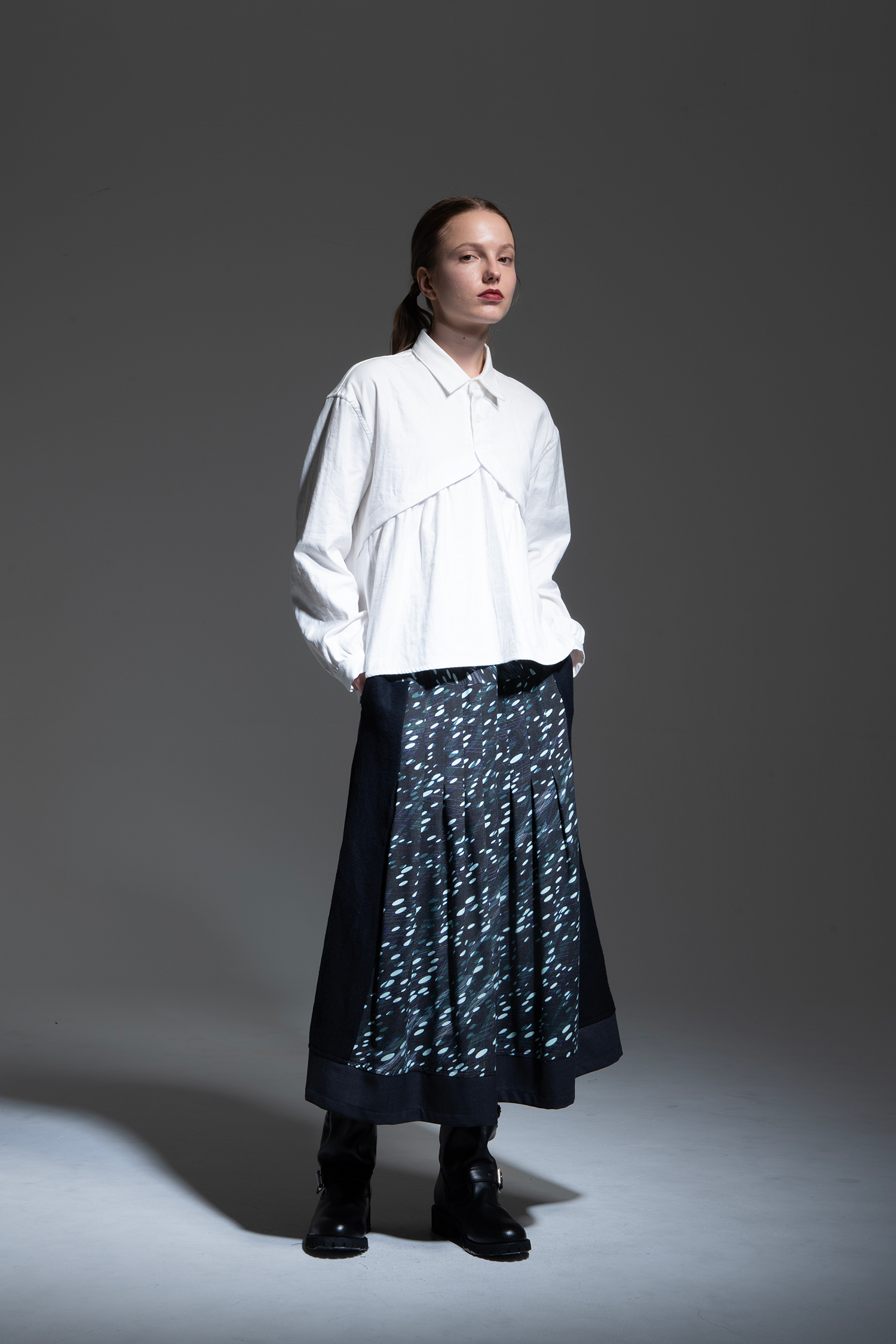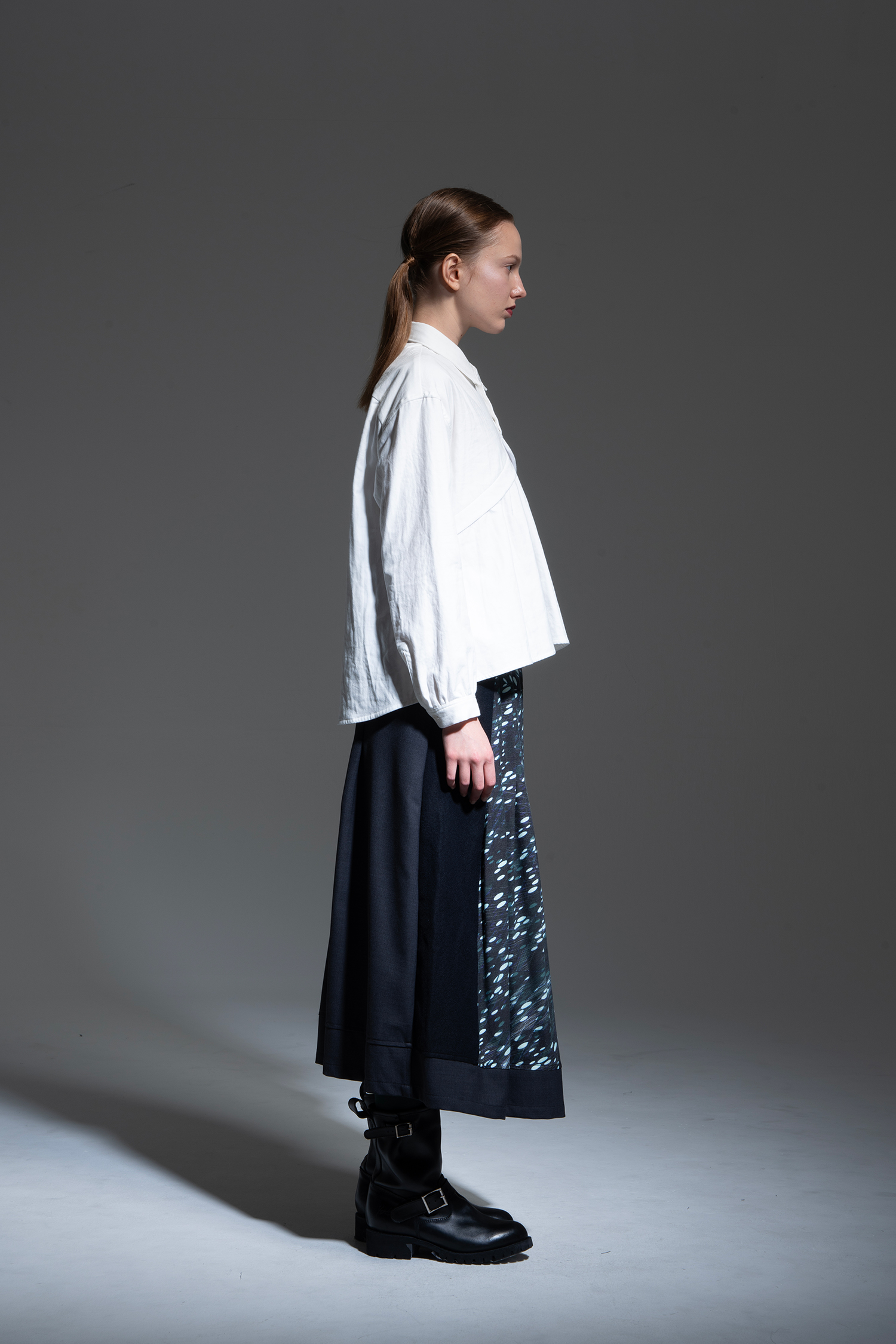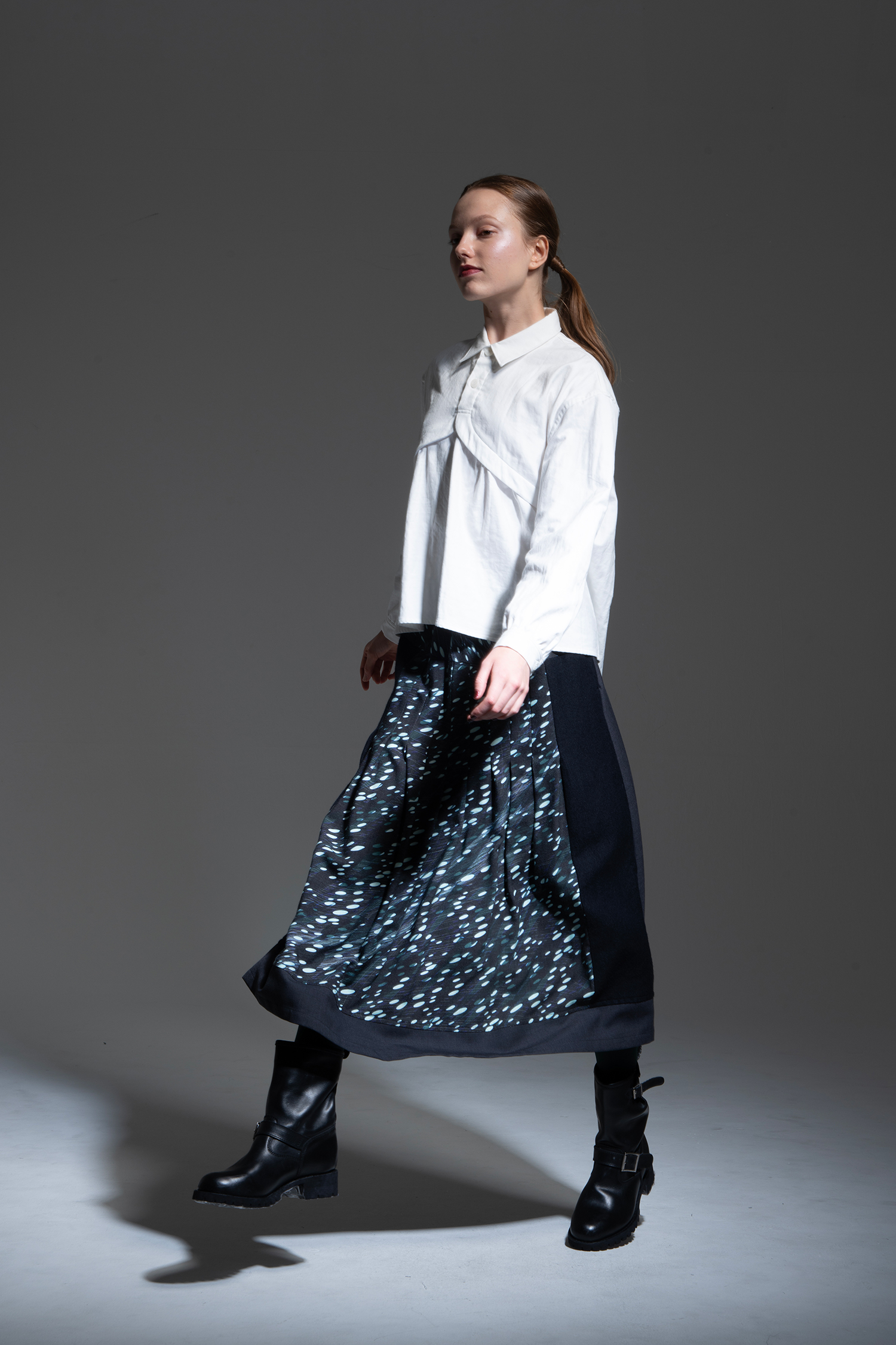 Mi-mollet skirt in 2019A/W " BLIZZARD (massive drop of snow)" printed wool/rayon viyella on the front yoke and front body, and dark blue wool/linen gabardine on the sides.