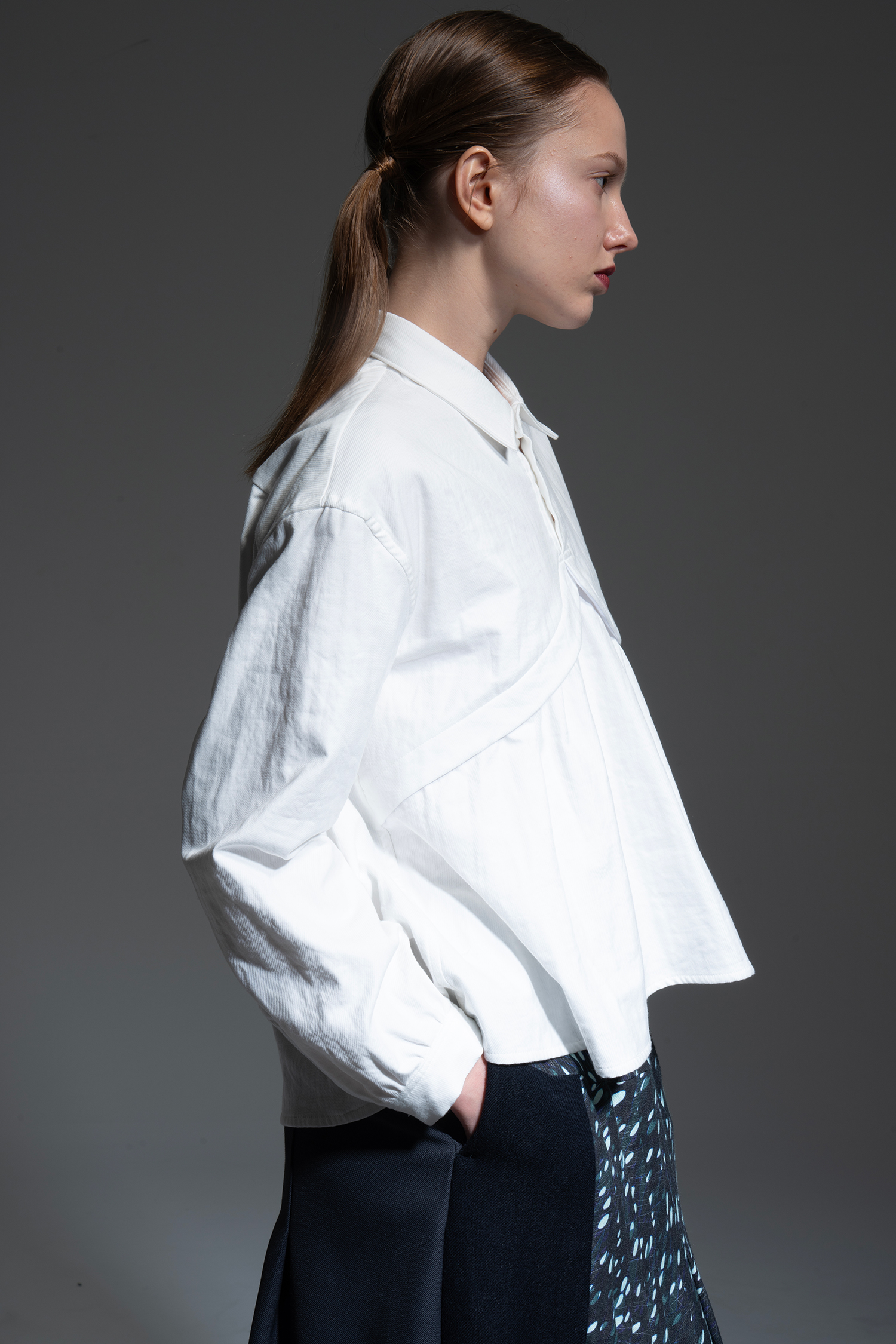 Pullover shirt in white cotton double gauze with twill weave surface.