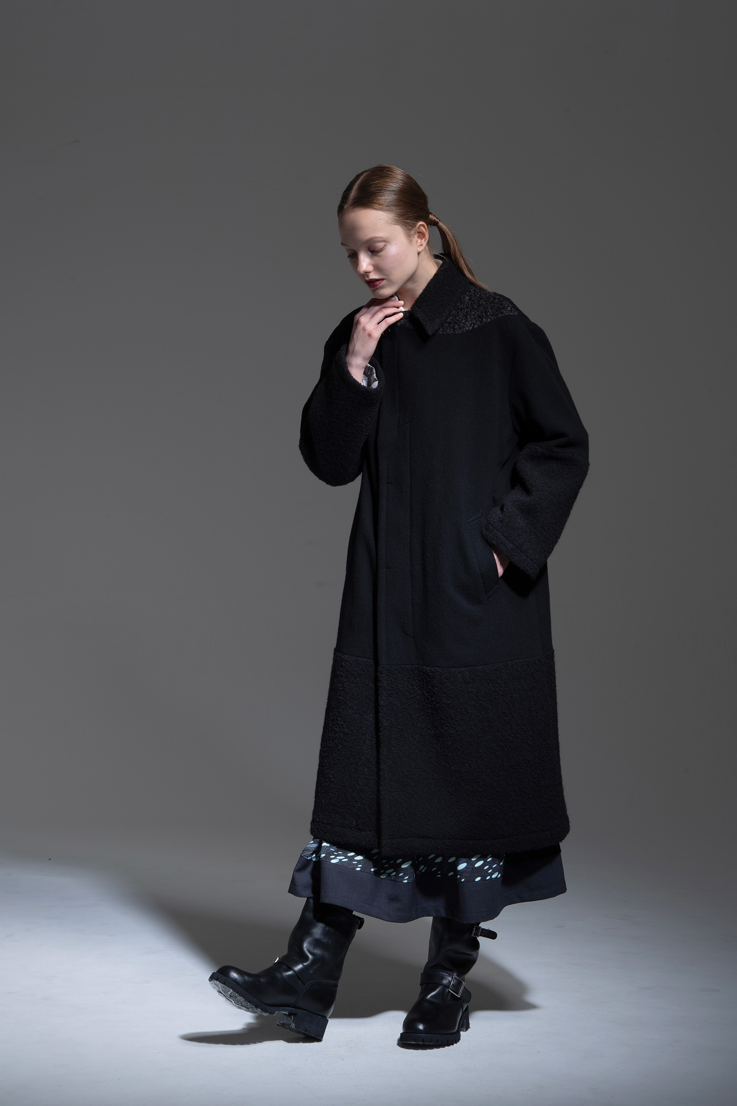表襟、袖口、裾に縮絨加工した黒色アルパカループツィード素材を、左肩にチャコール色アルパカシャギー素材とを組み合わせた、比翼開き 黒色 ウールツィードのロングコート。