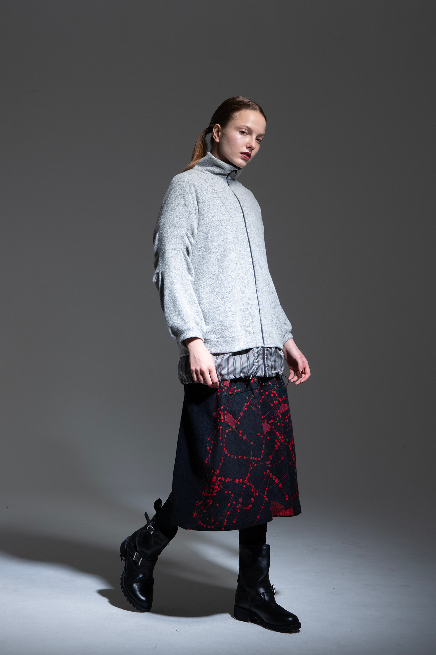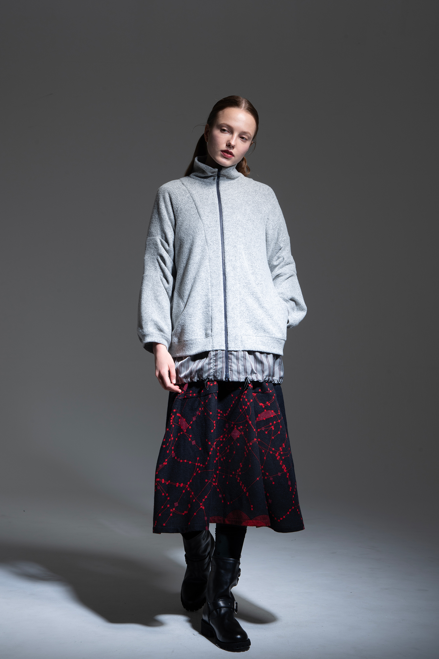 トップライトグレー色のウールブークレーアムンゼン素材を使用、袖に三段のタックを寄せ 裾にストライプ柄のキュプラ素材を組み合わせたジップアップロングブルゾン。