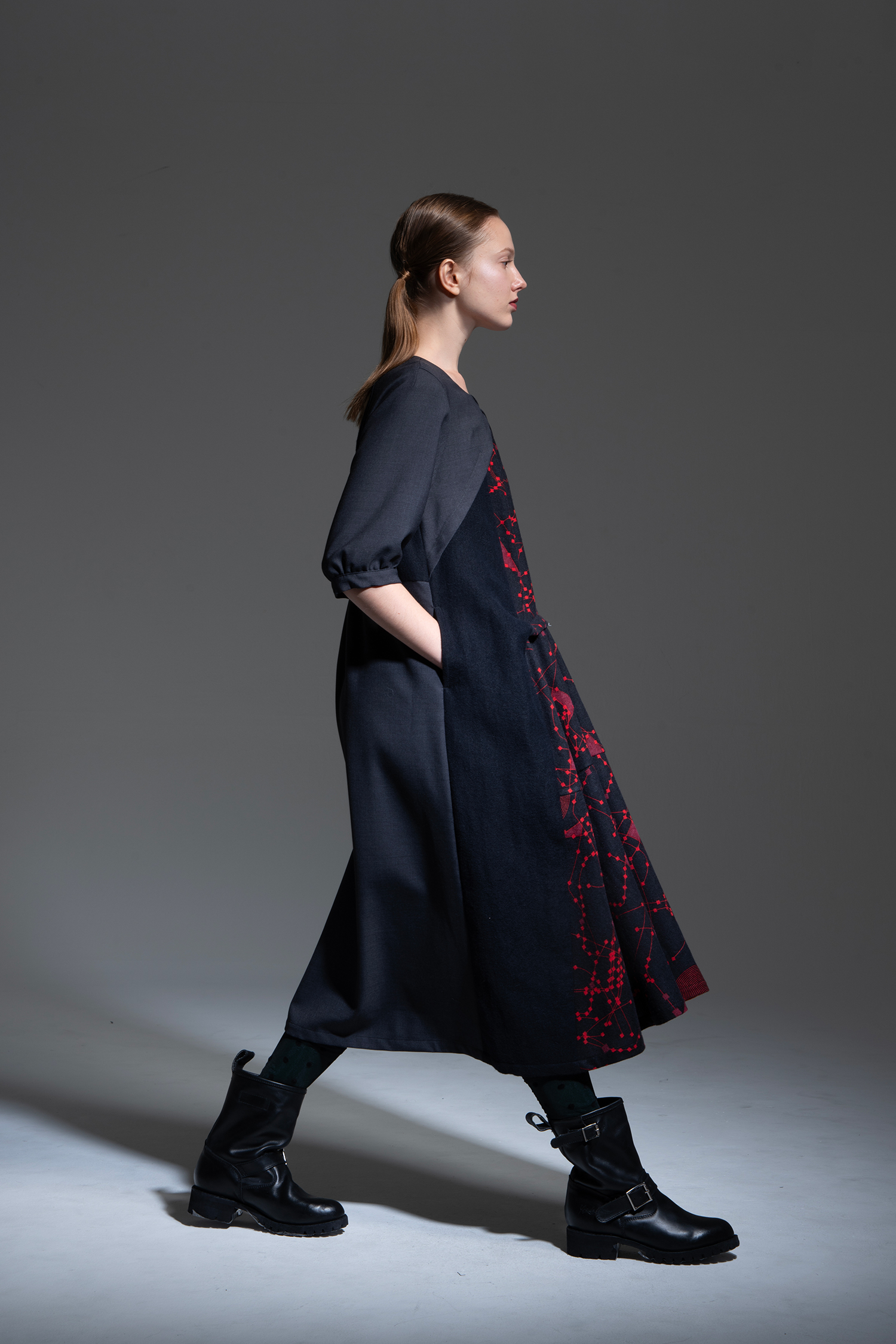 袖と後ろスカートにはチャコール色 ノンミュールジングウール/ポリエステルギャバジンを、脇と後ろ上身頃には濃紺色 ウールリネンギャバジンを、前中心身頃には 2008A/W “ SUGER & BAUMKUCHEN ” プリント ウールエターミン素材とを組み合わせた、前身頃に二段ギャザーデザインのあるロングドレス。