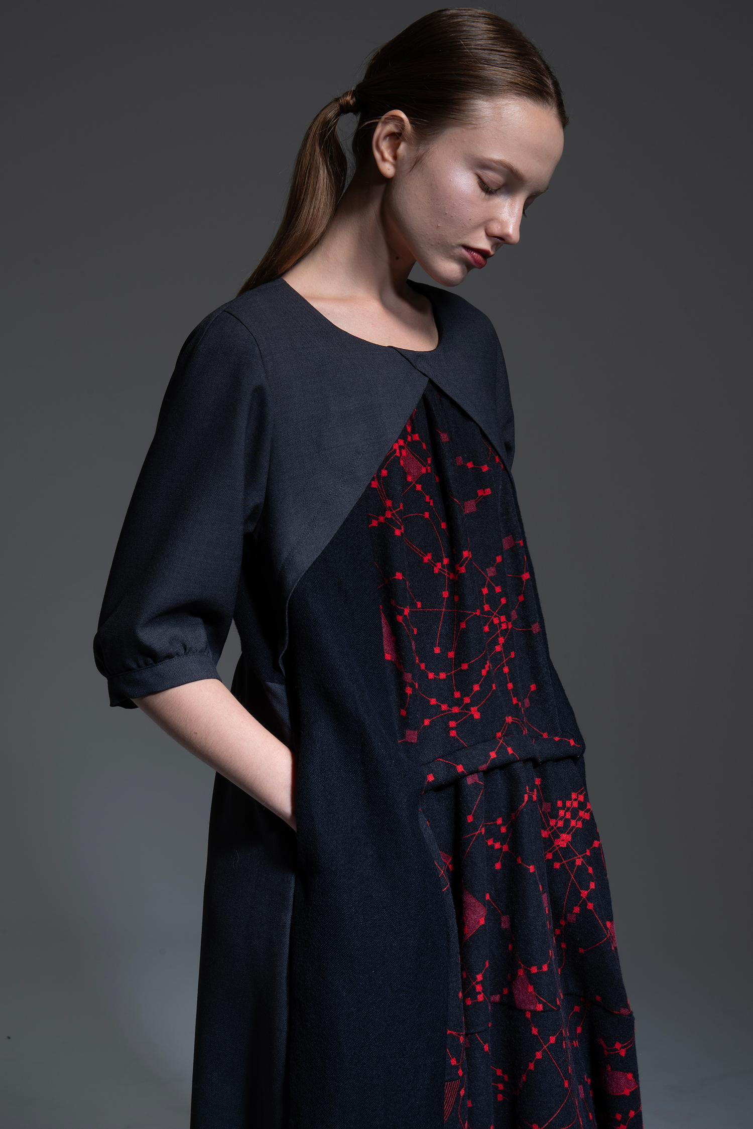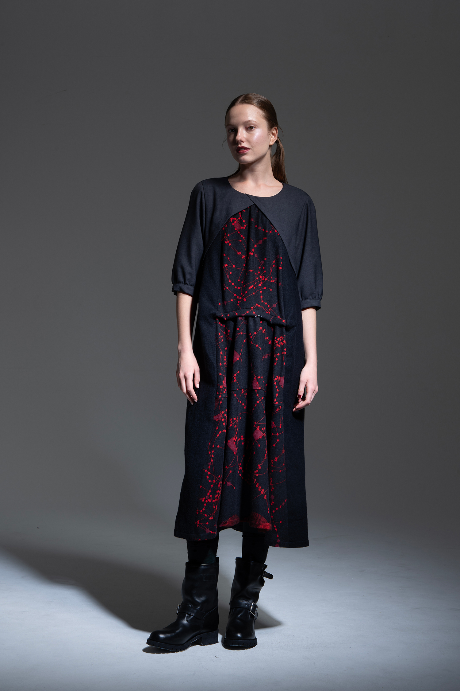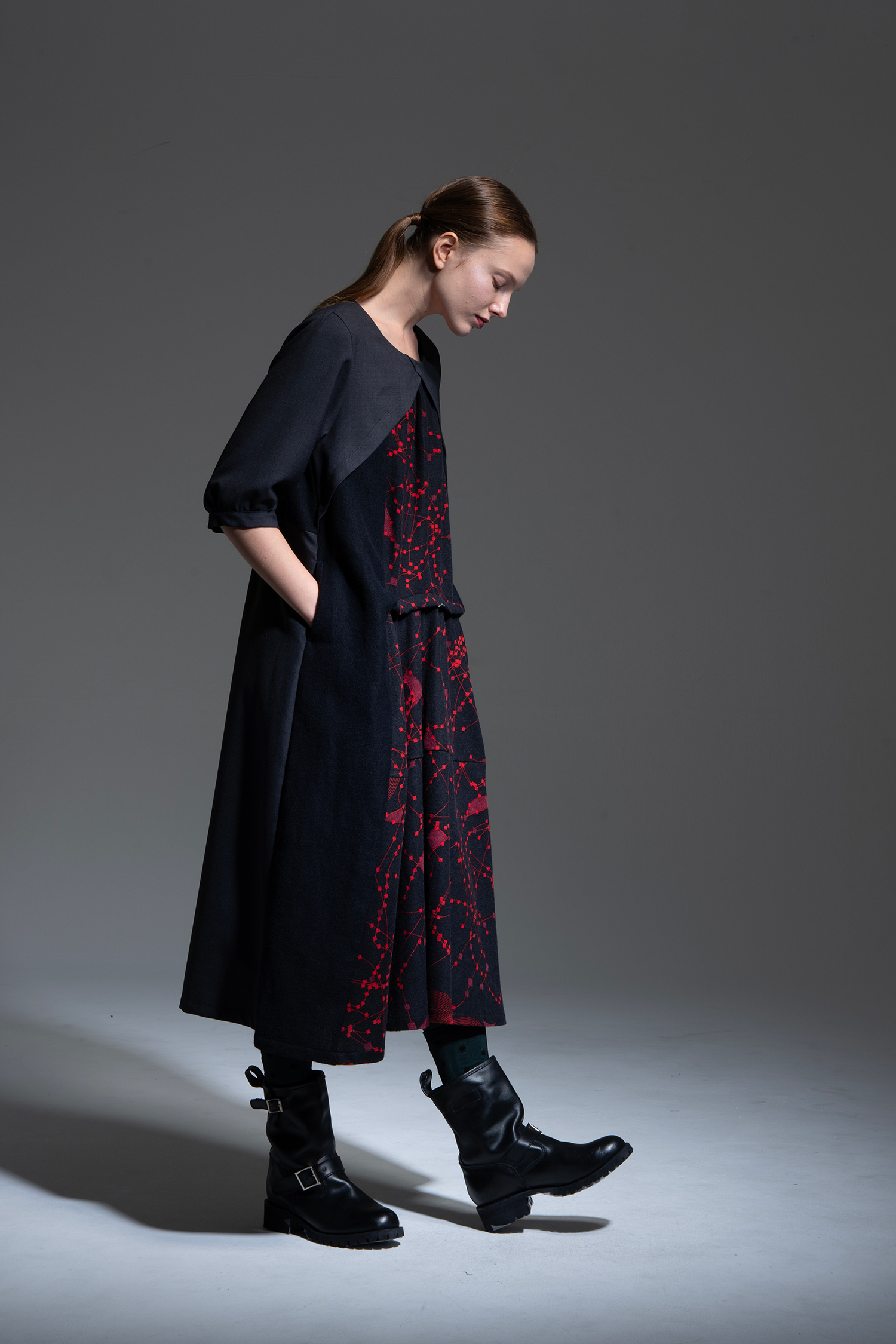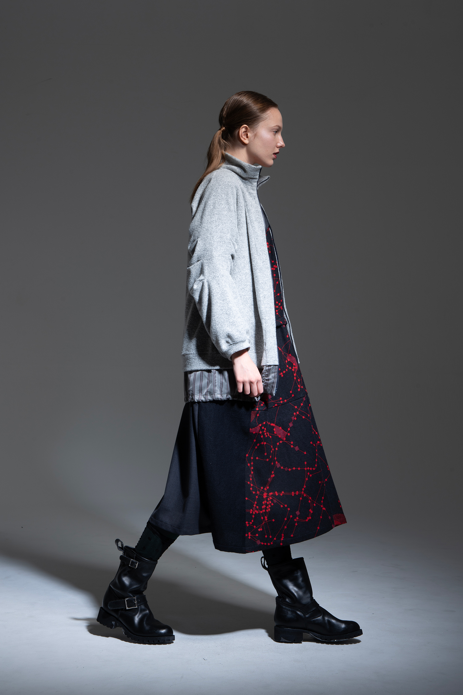 Long dress with two gathers in the front in 2008A/W " SUGER & BAUMKUCHEN" print wool on front centerline, charcoal non-mulesing wool/polyester gabardine on sleeves and back skirt, and dark blue wool/linen gabardine on sides and upper back.