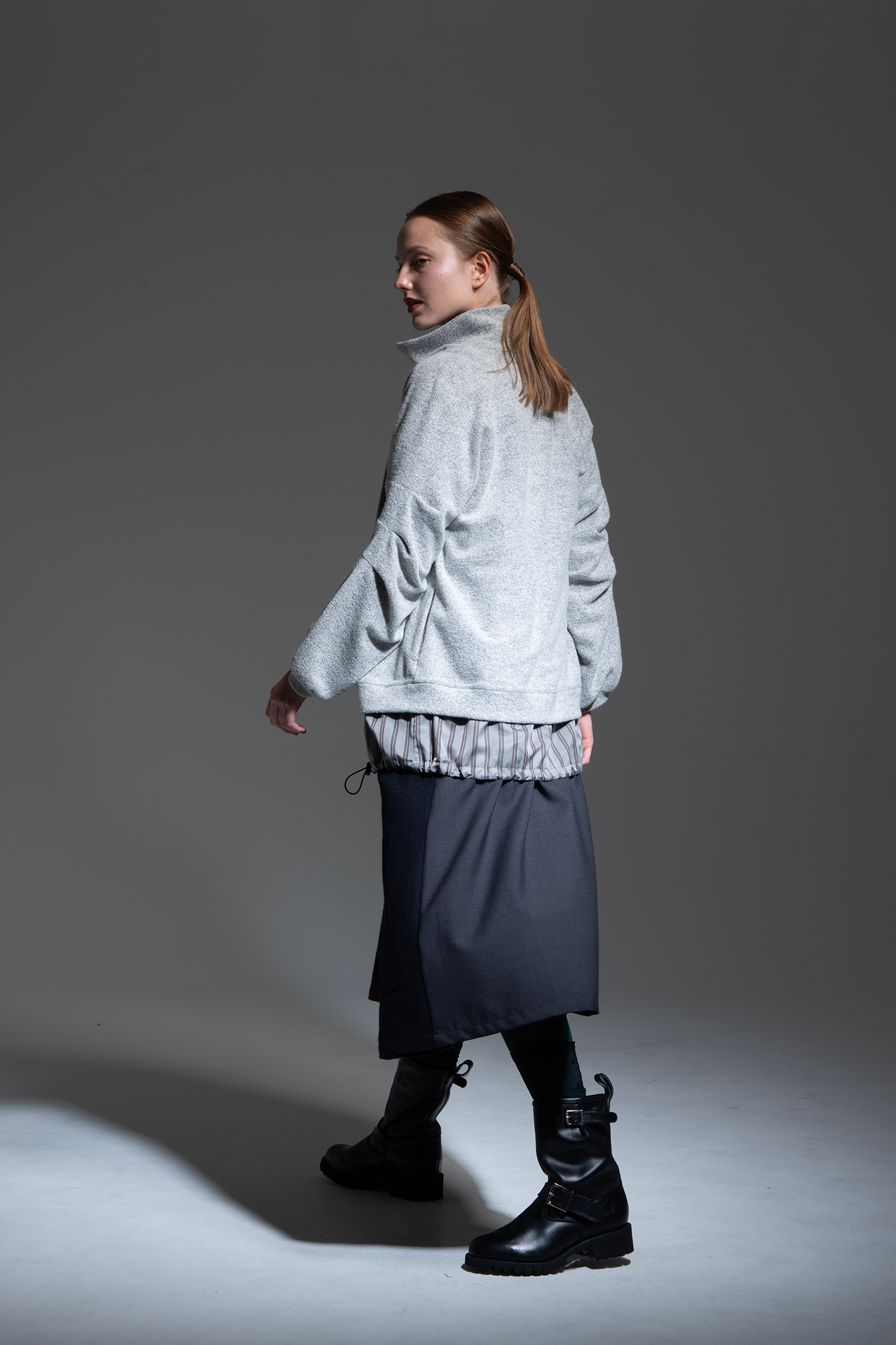 Long zip-up jumper in light gray shrunken wool jersey with three tiers of tucks at the sleeves and striped cupra at the hem.