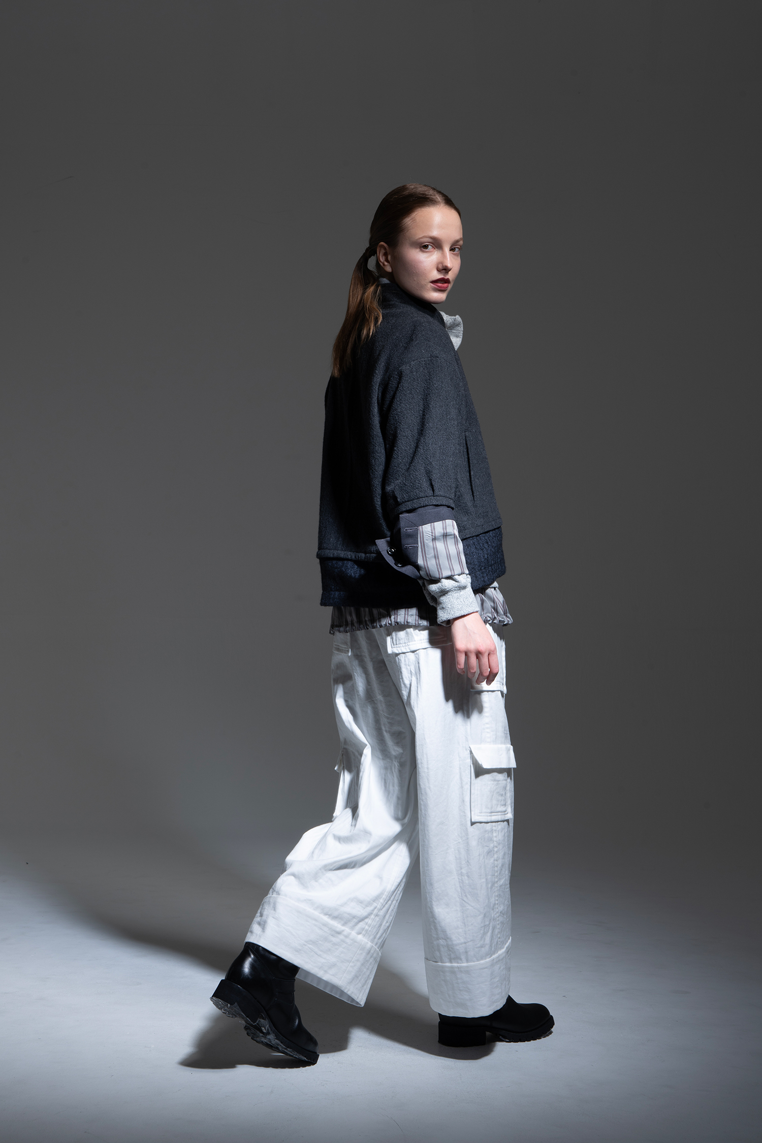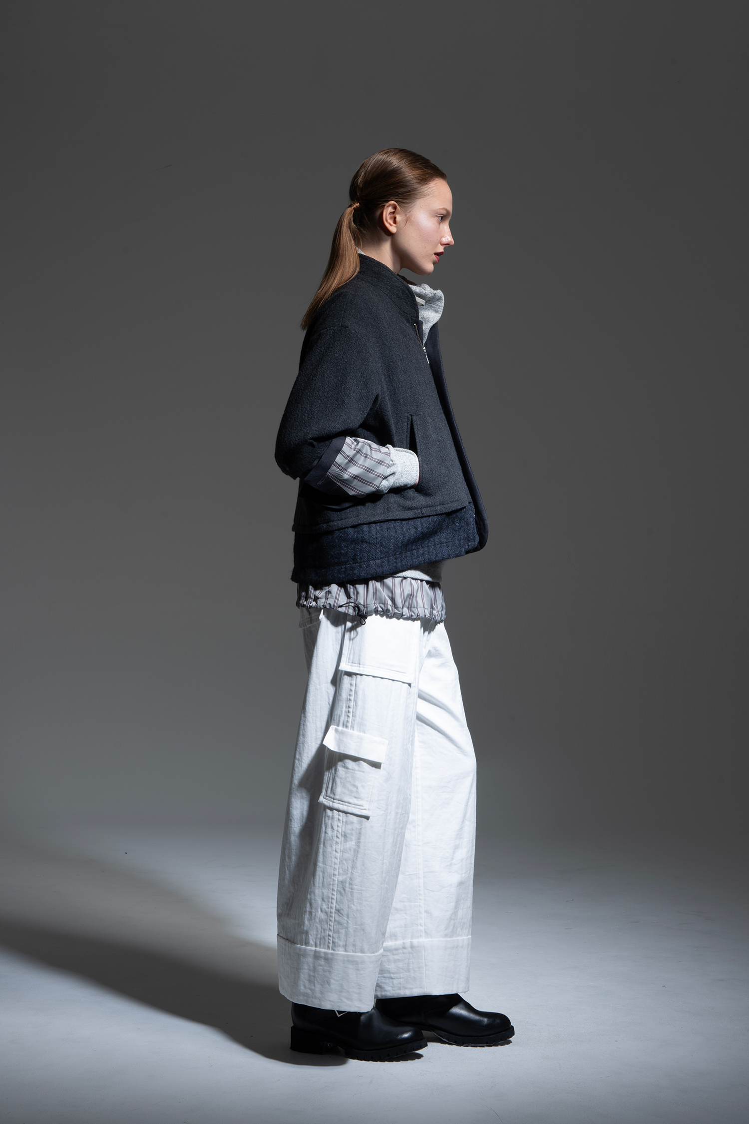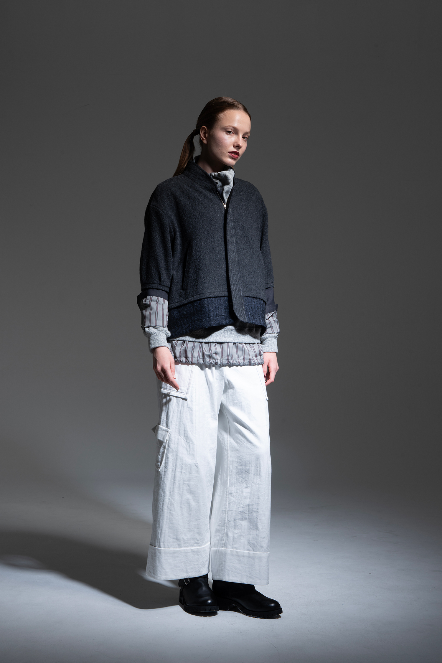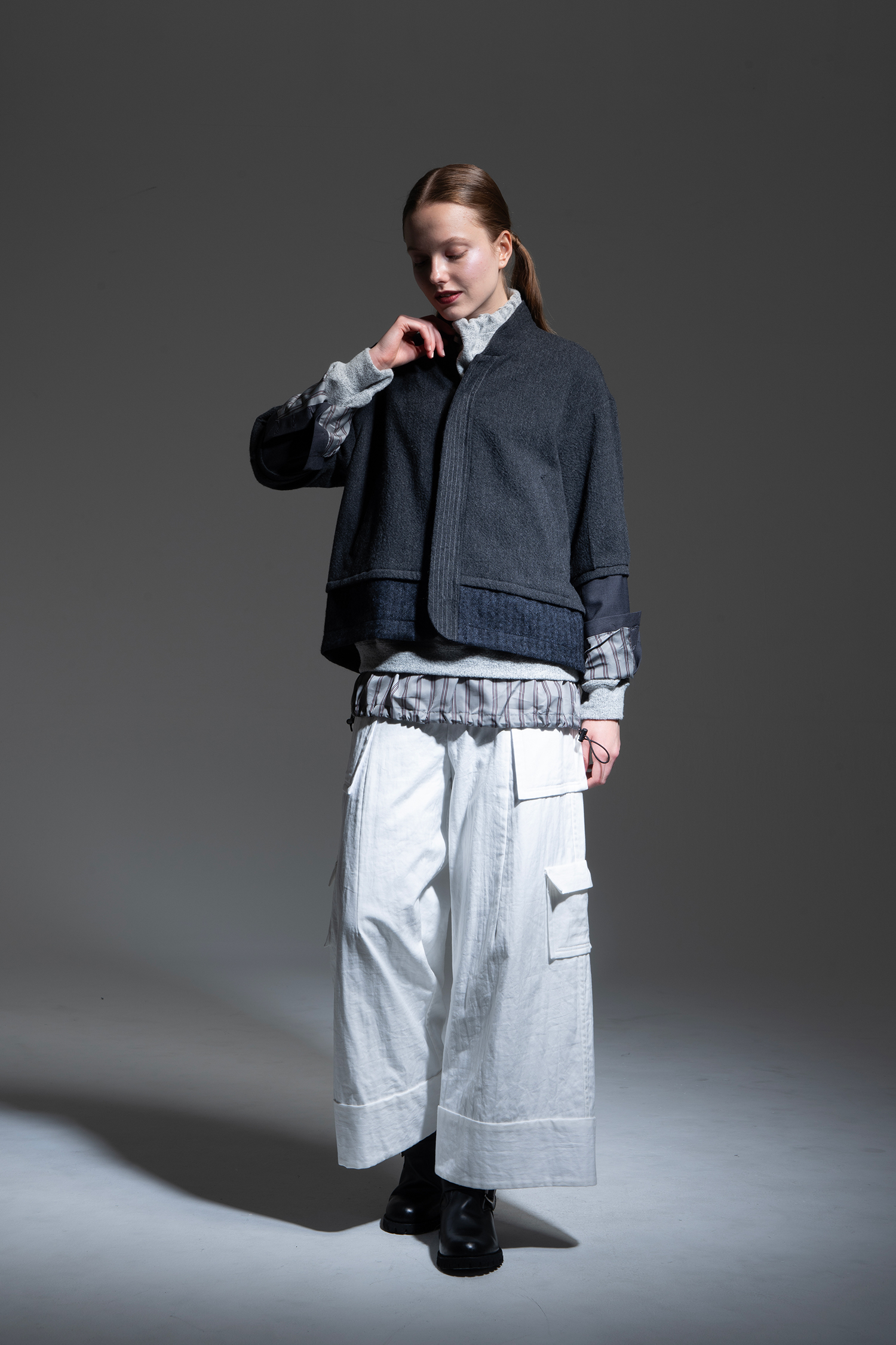チャコール色 ウールツィード素材を使用、裾には濃紺色ウールリネンヘリンボーンツィード素材を、袖口にはテーラードジャケットの袖口のような4つ釦本開きのチャコールグレー色ノンミュールジングウール/ポリエステルギャバジン素材の袖を組み合わせた、スタンドカラー ジップアップのショートブルゾン。