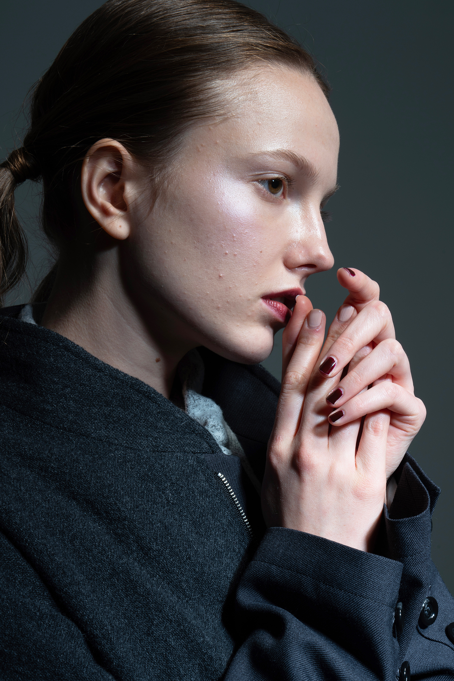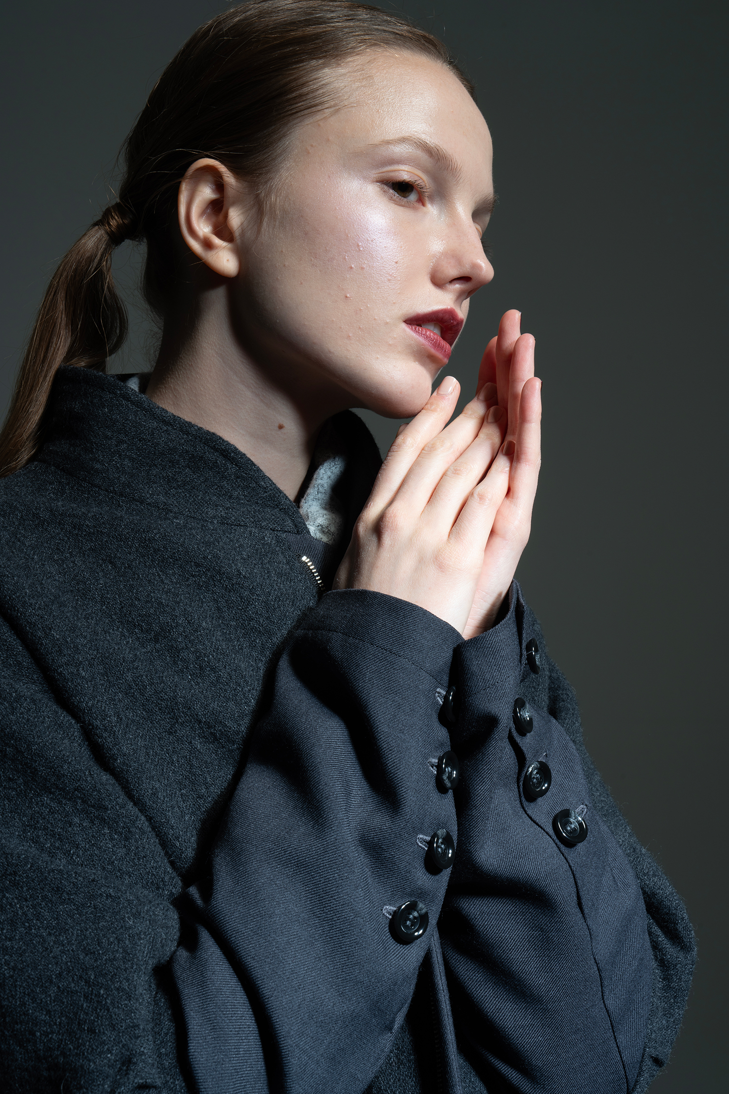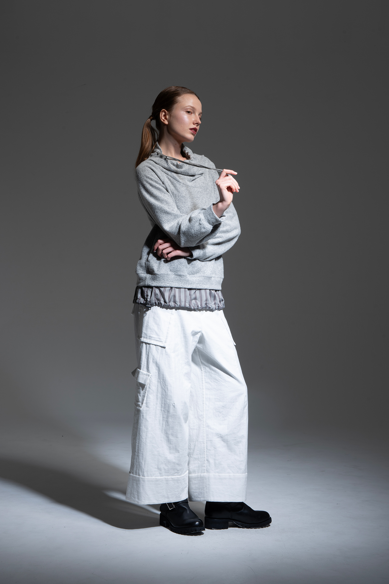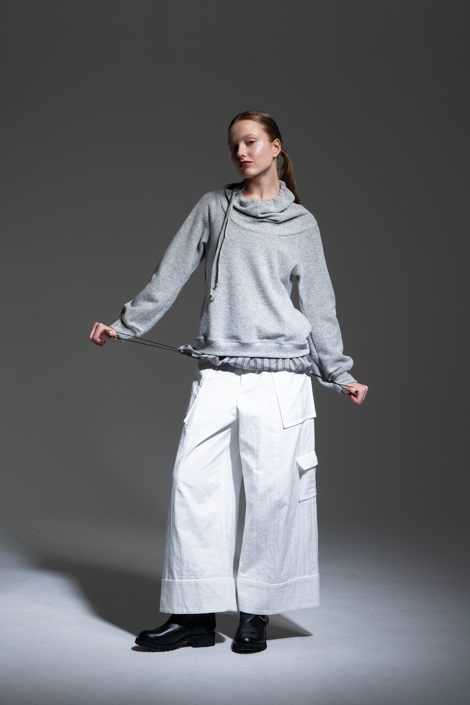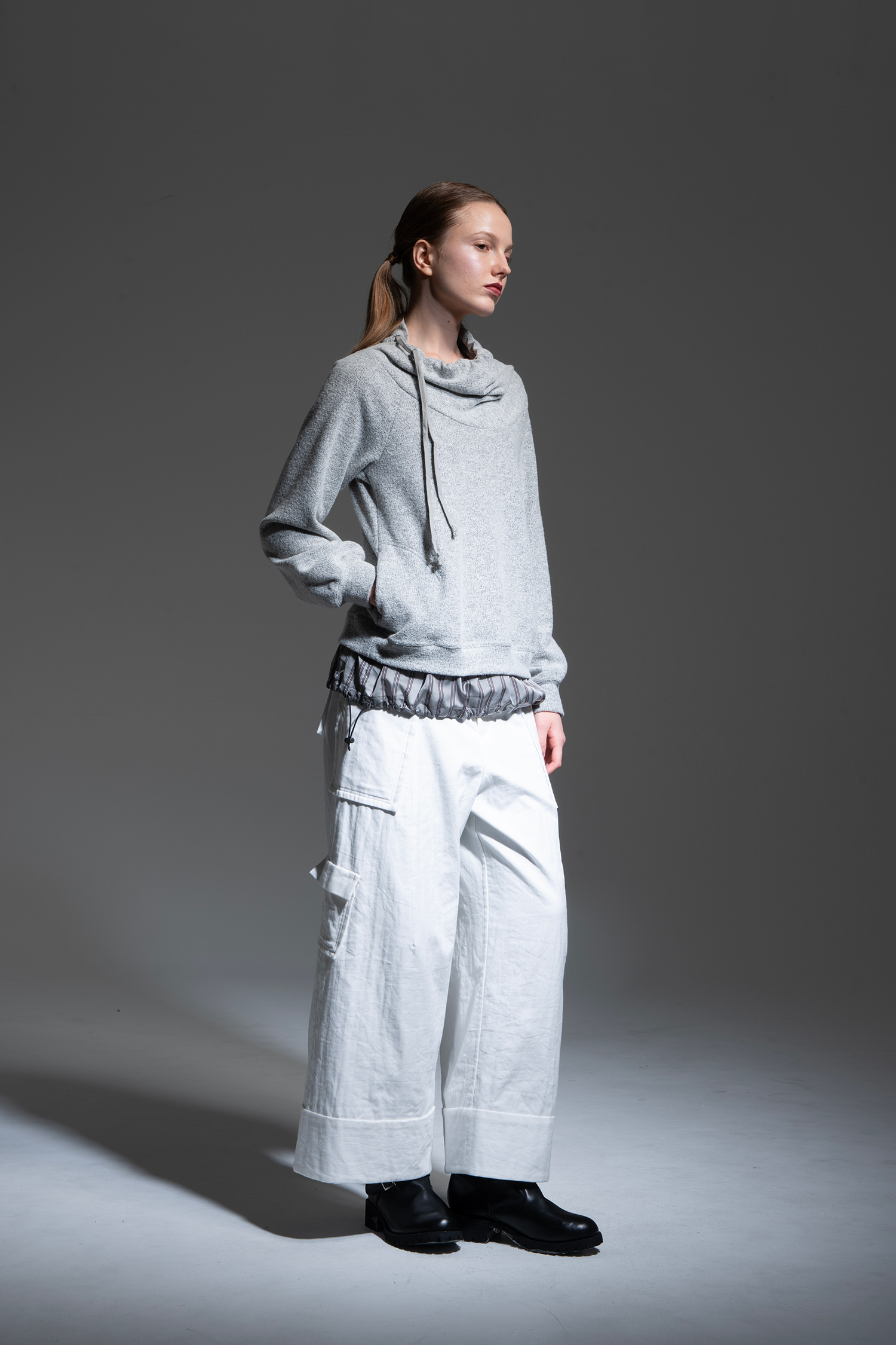 トップライトグレー色のウールブークレーアムンゼン素材を使用、裾にはストライプ柄キュプラ素材を組み合わせた、アシンメトリーハイネックデザインのパーカー。