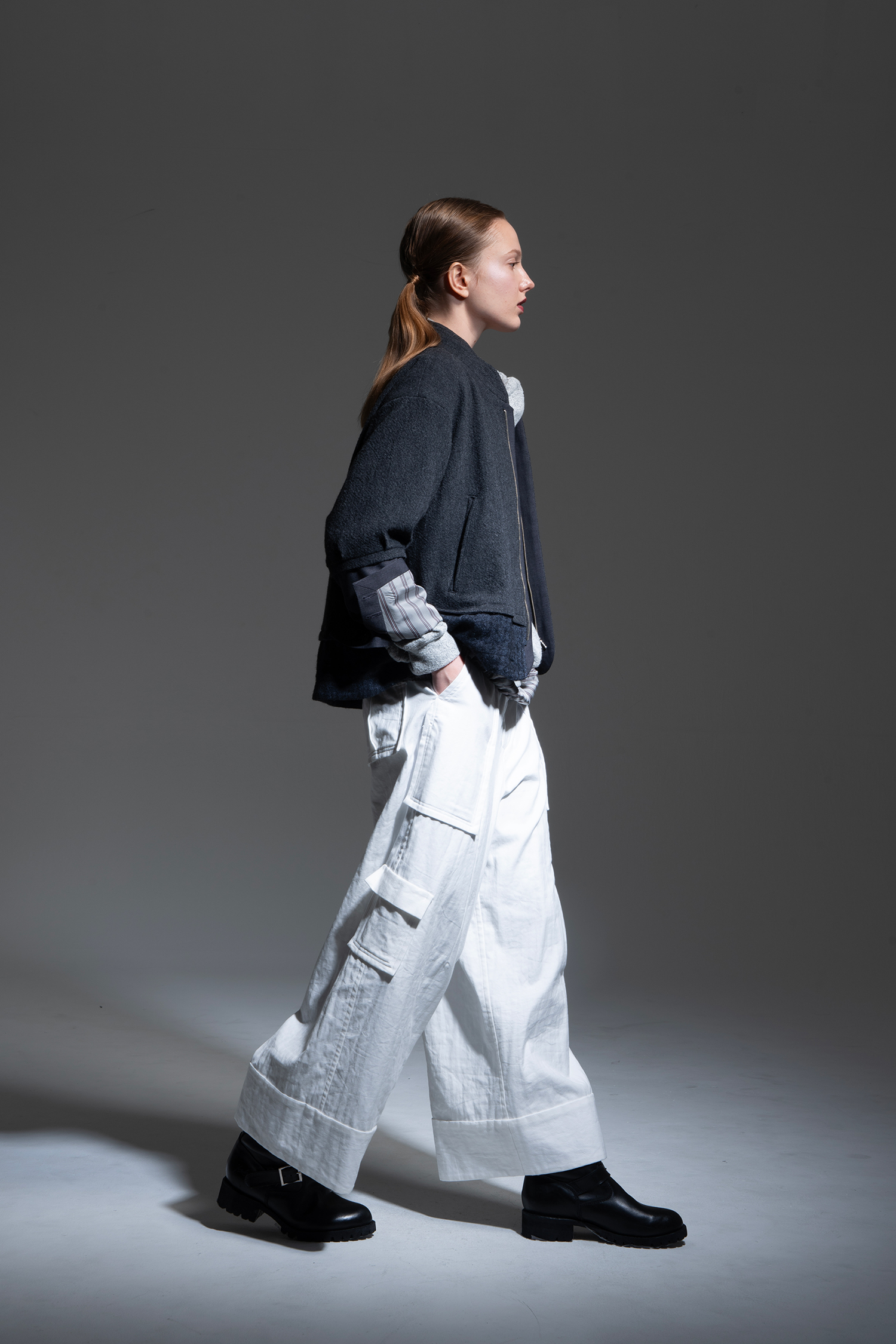 表面がフランス綾織のオフ白色 コットンダブルガーゼ素材のワークテイストのワイドパンツ。