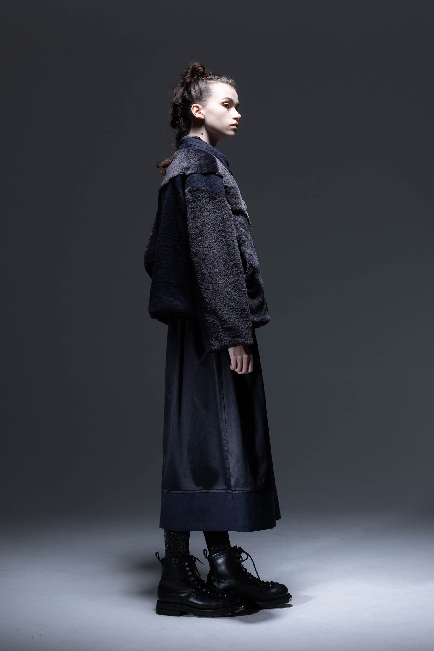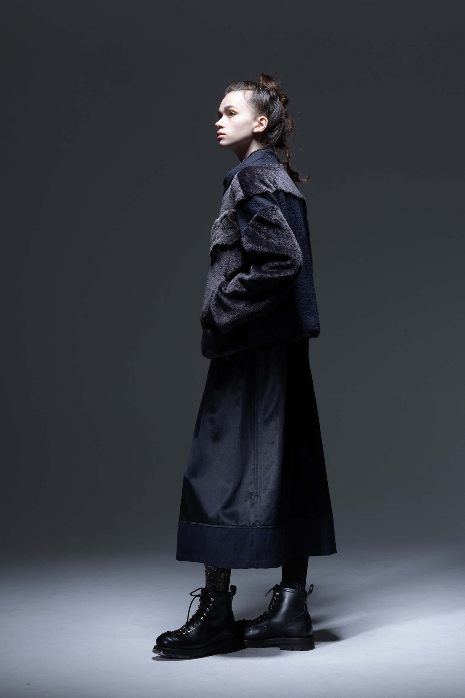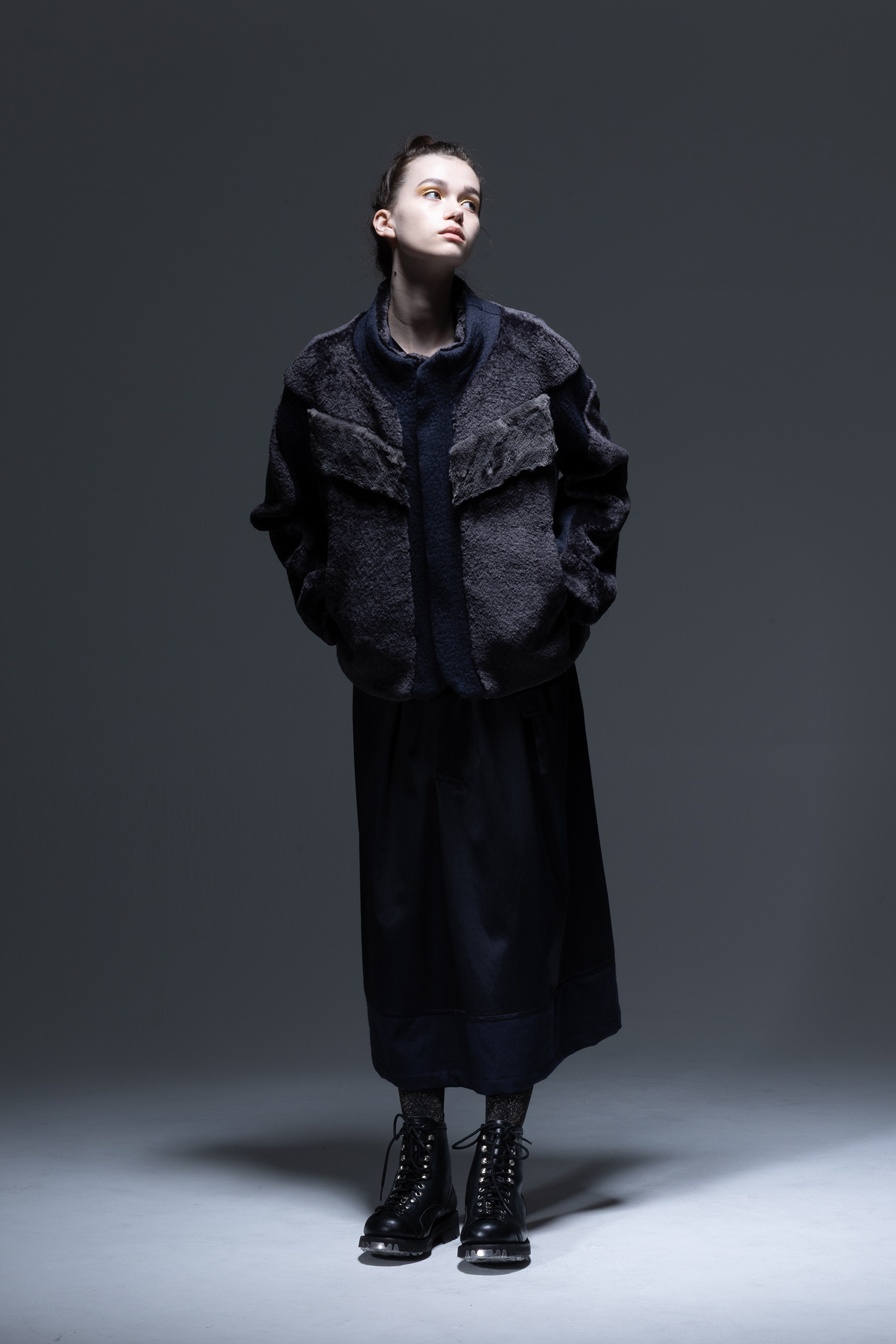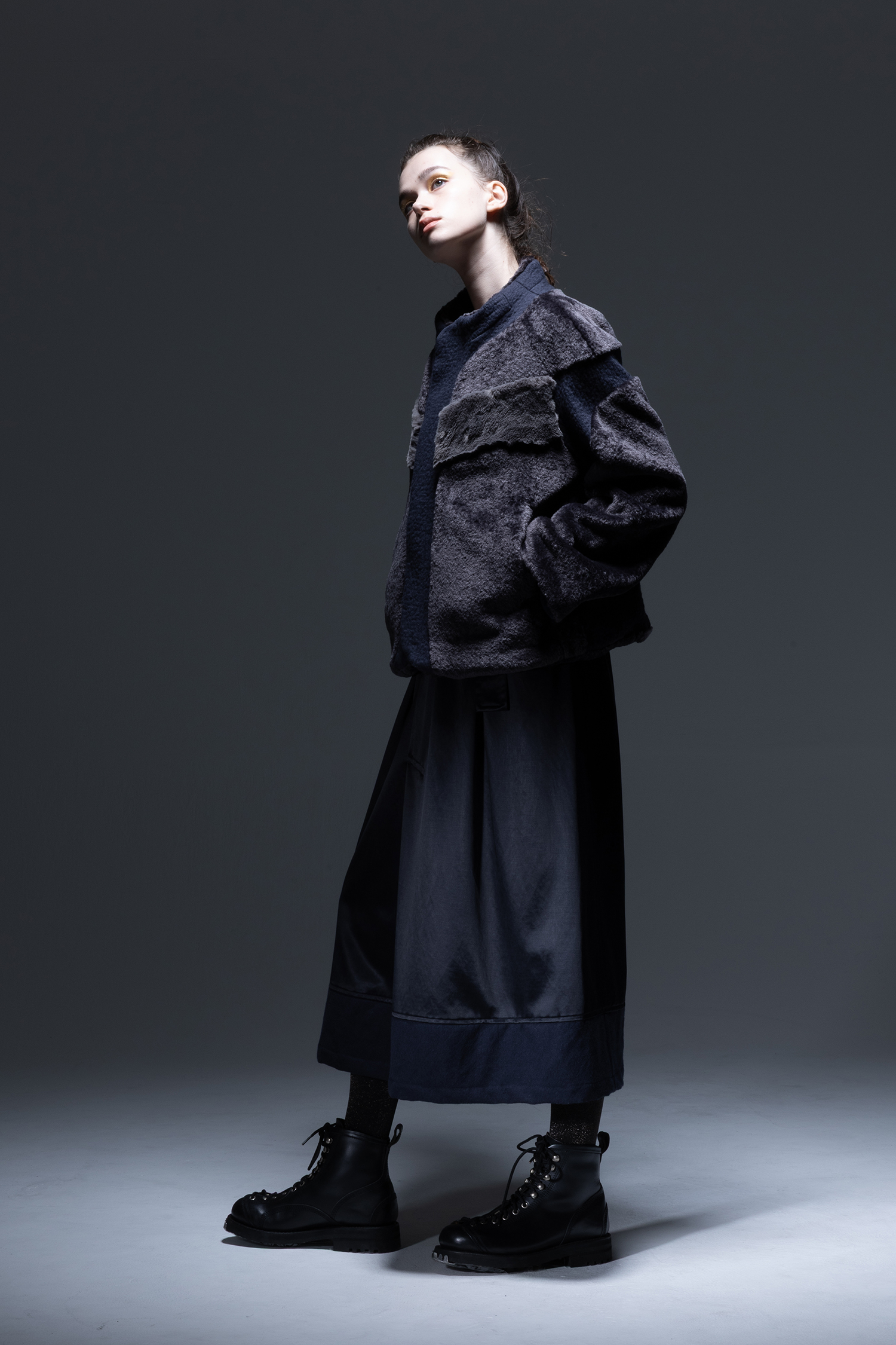 コットンとウールの縮絨差を利用して縮絨加工し凹凸感を表現した 濃紺色 裏毛素材と、リサイクルポリエステルを使用した チャコール色 フェイクファー、とをグラフィカルに組み合わせた、前ファスナー開きのショートハイネックブルゾン。