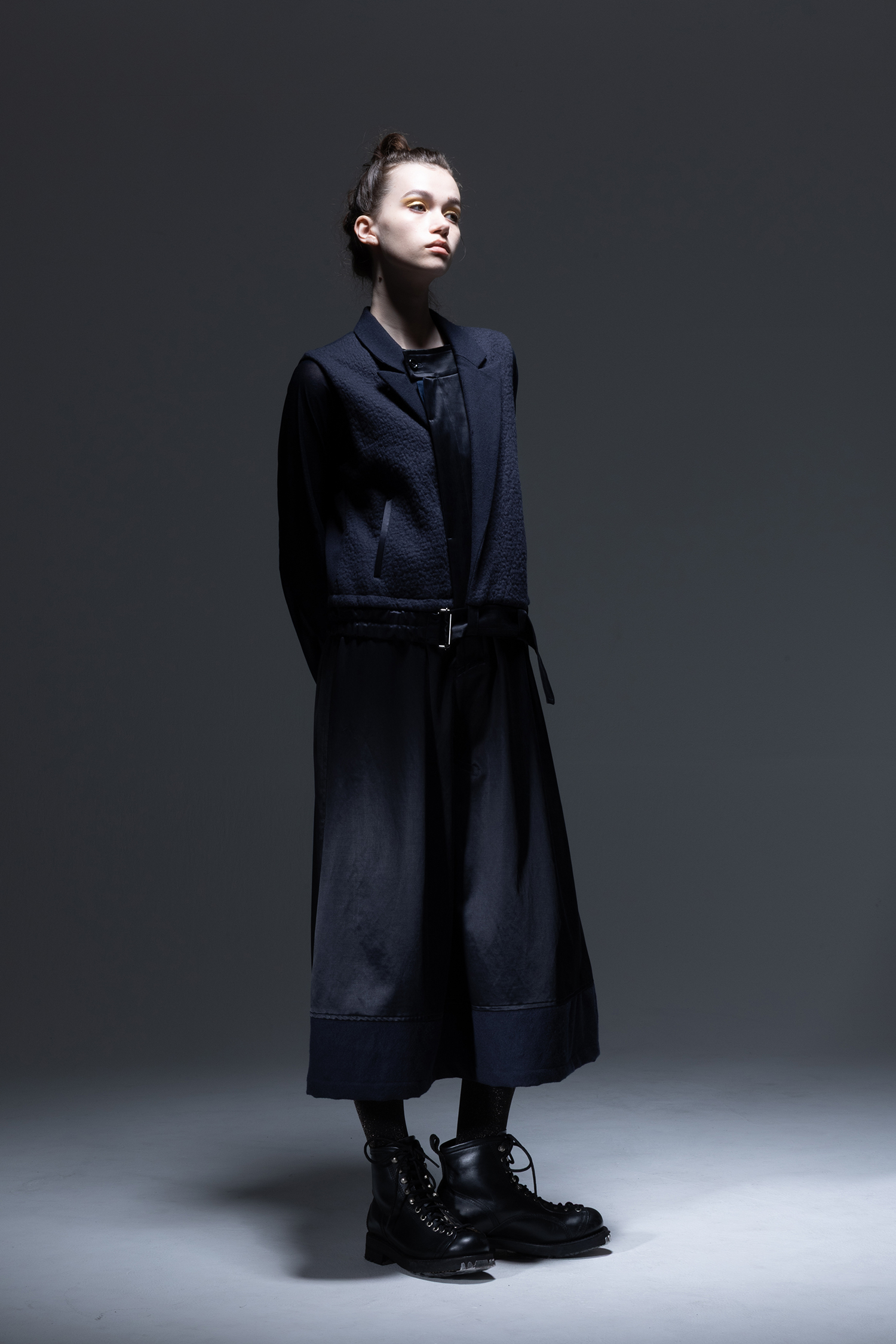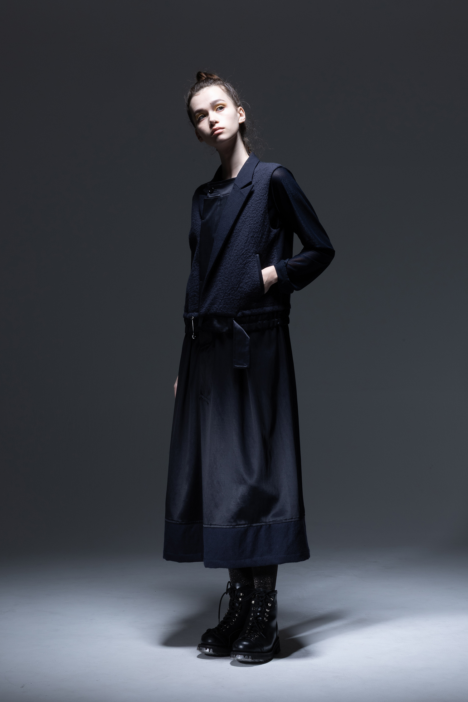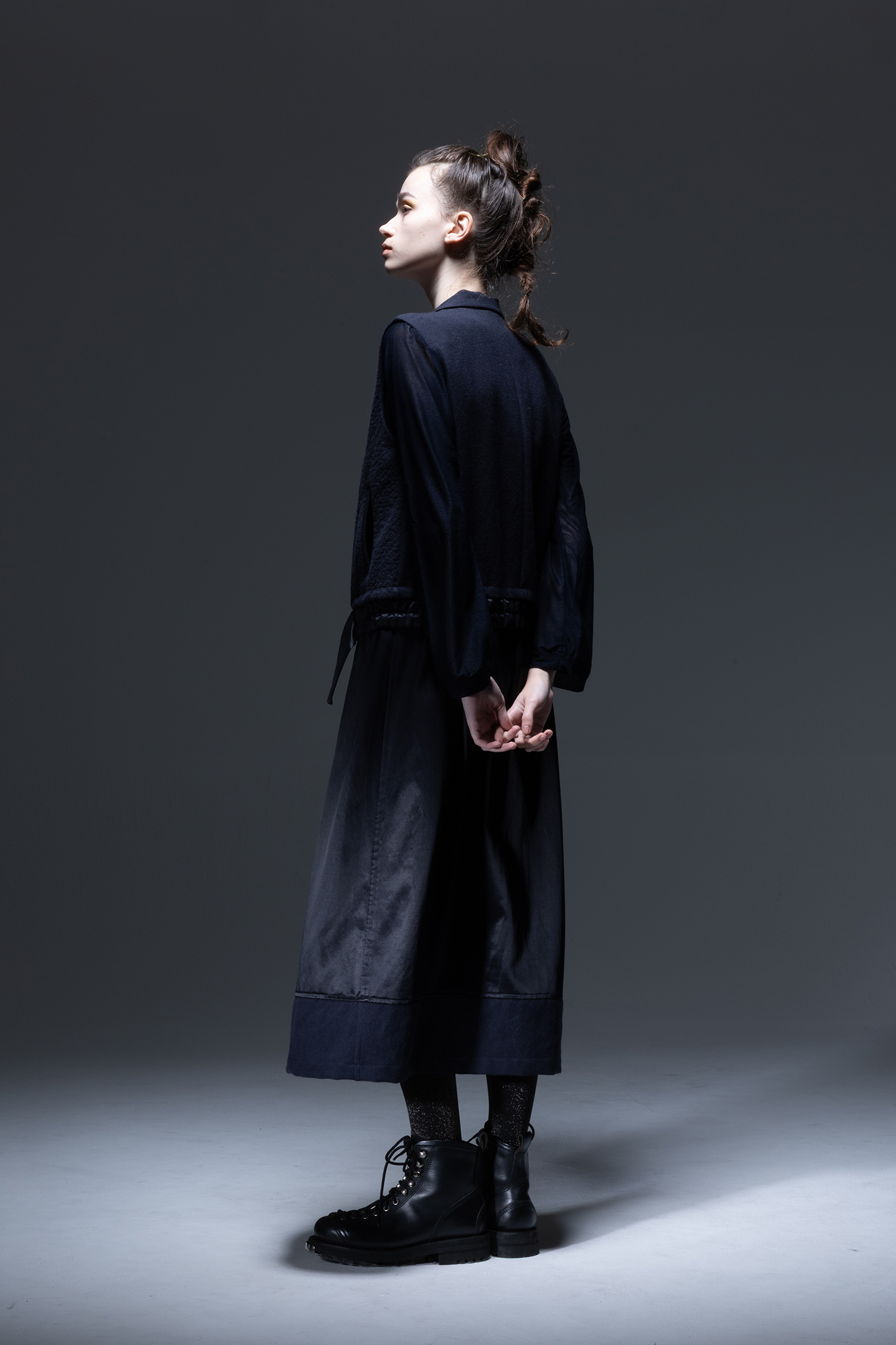 上前身頃にはコットンとウールの縮絨差を利用して縮絨加工し凹凸感を表現した 濃紺色 裏毛素材、上後身頃とラペルにはウールの持つ油分を出来るだけ落としたドライタッチの 濃紺色 ウールギャバジン素材、スカート部分には肉厚感のあるキュプラ/コットンの 濃紺色 サテン素材、とを組み合わせた、ラペルカラーの中にもう一つの台襟と身頃が挟み込まれそれが下スカート身頃にまで繋がるデザインの、ピークドカラーのノースリーブドレス。