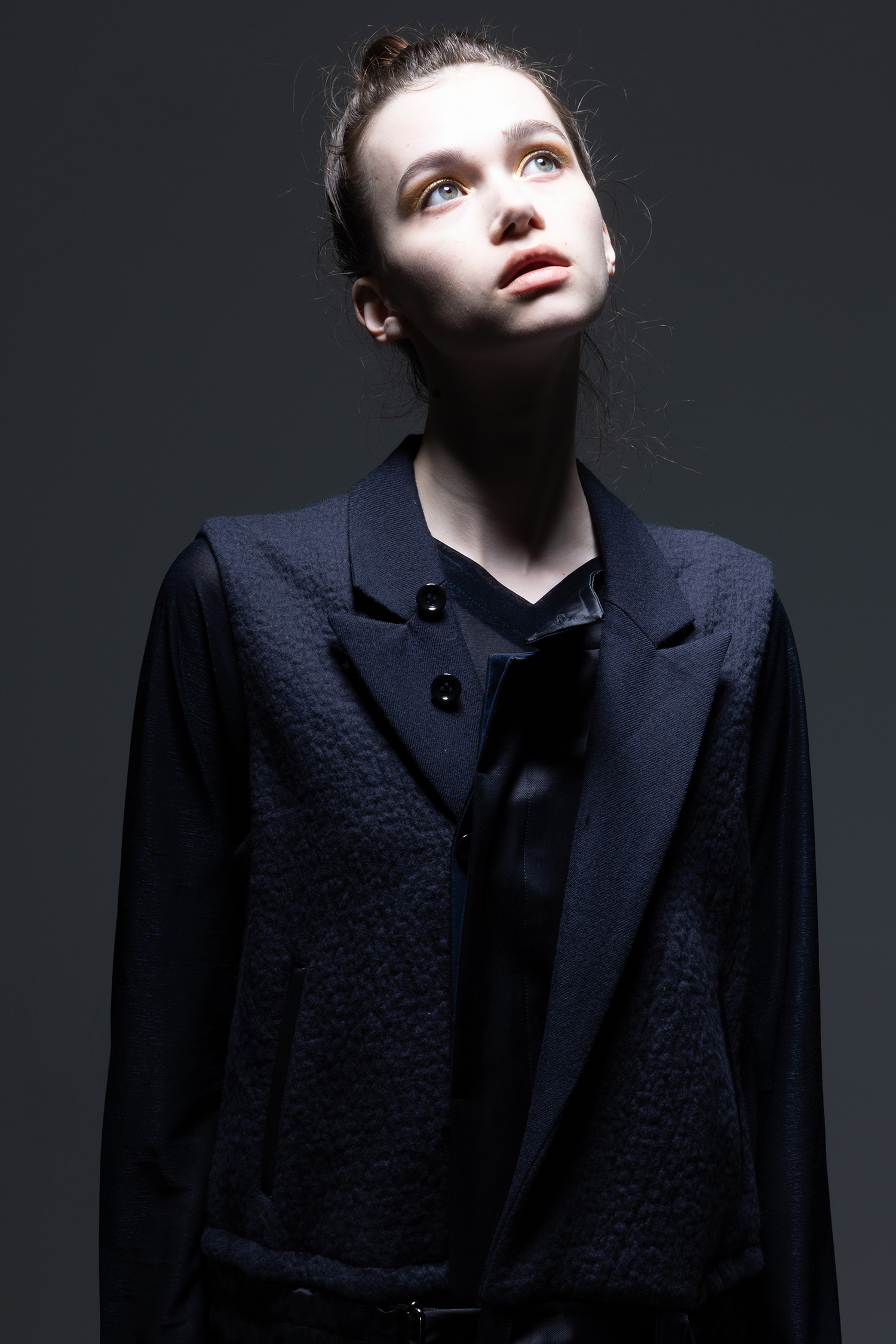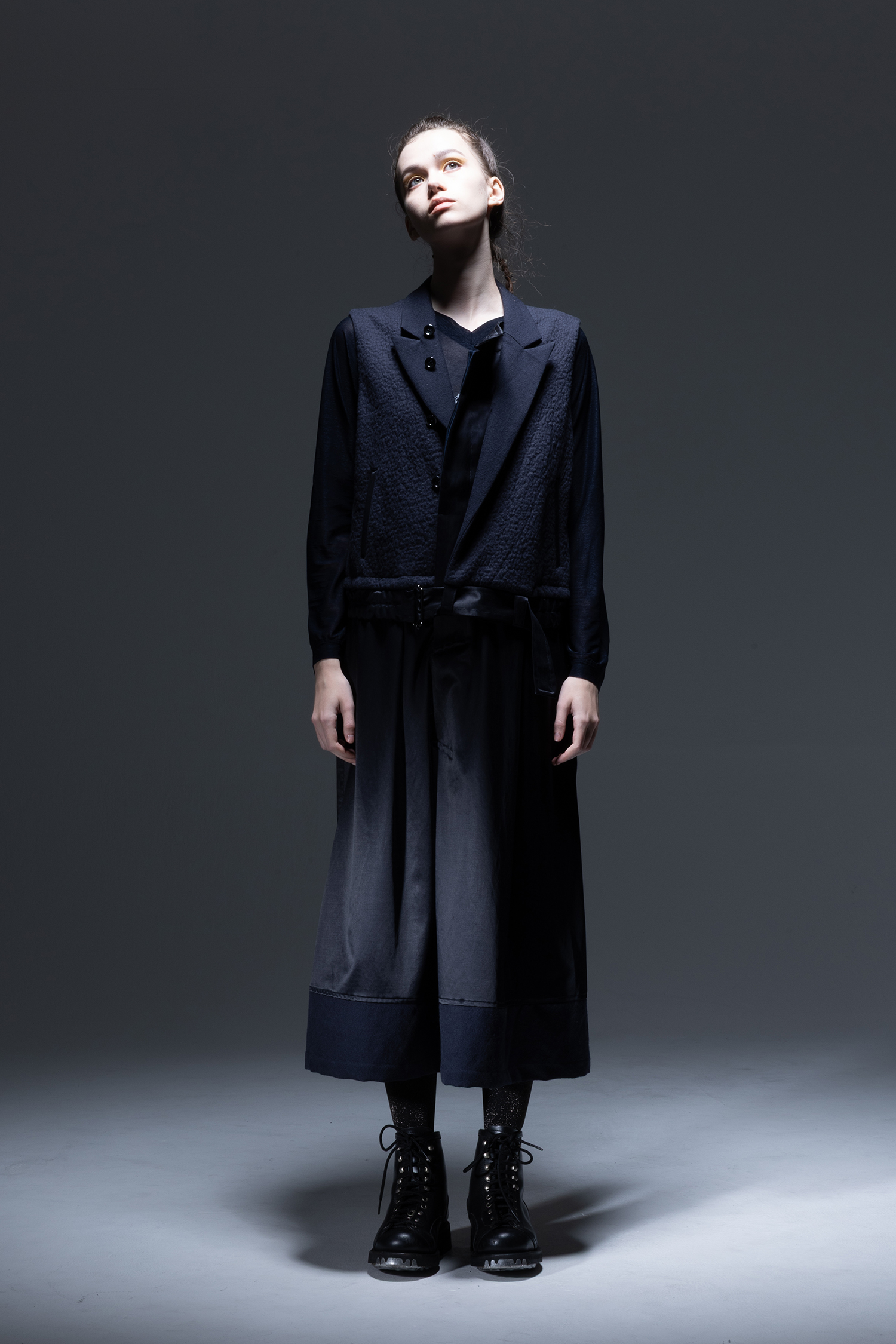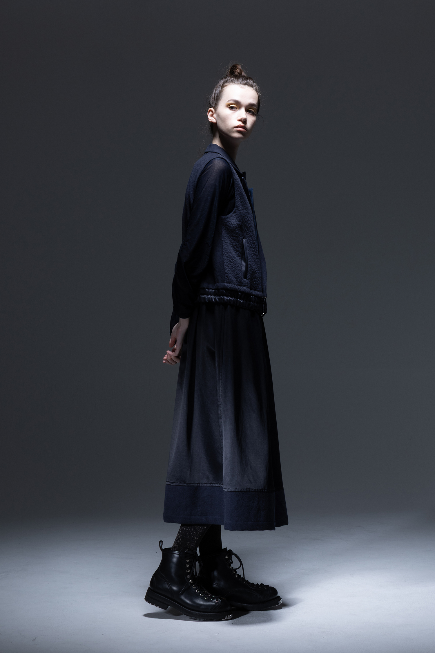 上前身頃にはコットンとウールの縮絨差を利用して縮絨加工し凹凸感を表現した 濃紺色 裏毛素材、上後身頃とラペルにはウールの持つ油分を出来るだけ落としたドライタッチの 濃紺色 ウールギャバジン素材、スカート部分には肉厚感のあるキュプラ/コットンの 濃紺色 サテン素材、とを組み合わせた、ラペルカラーの中にもう一つの台襟と身頃が挟み込まれそれが下スカート身頃にまで繋がるデザインの、ピークドカラーのノースリーブドレス。