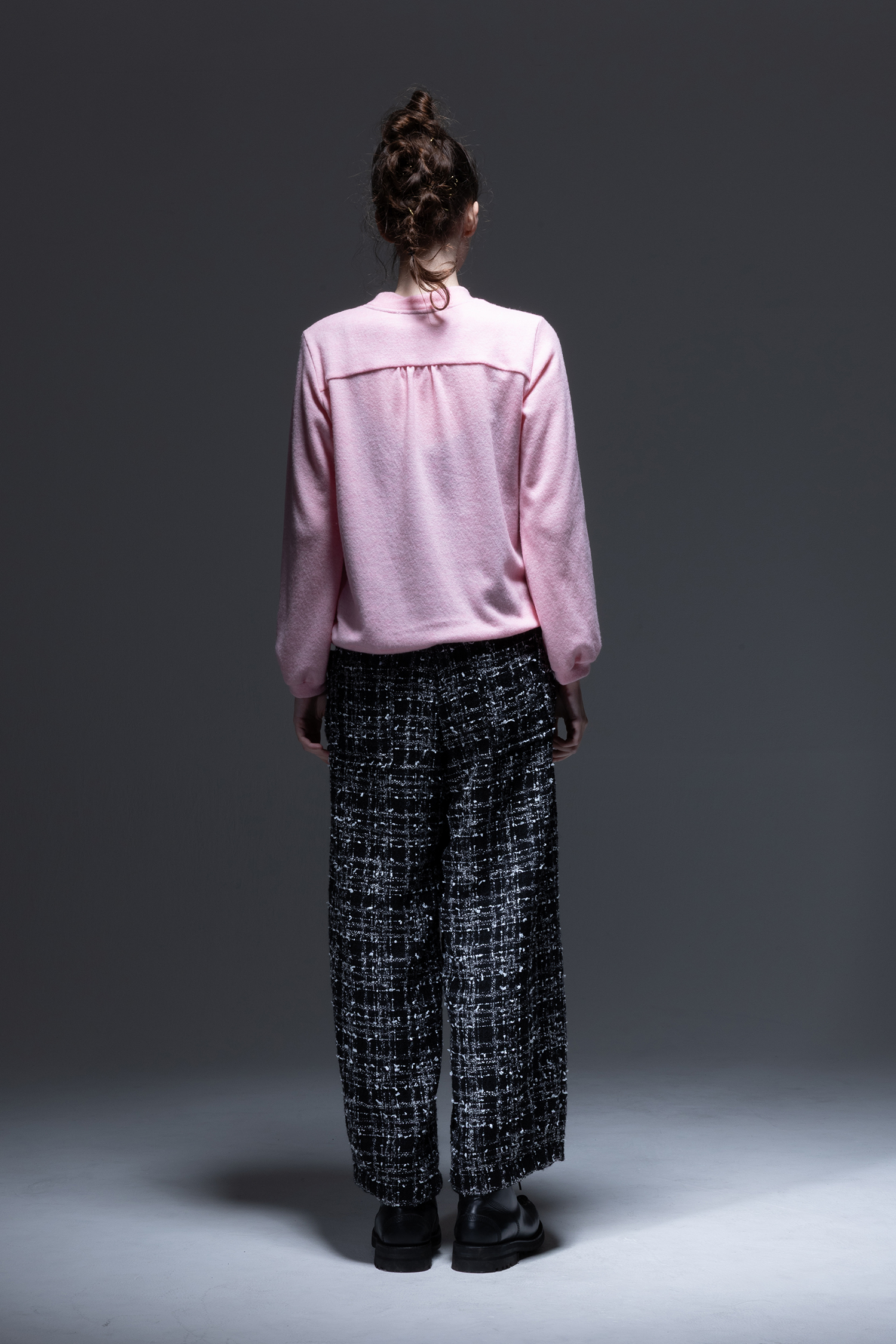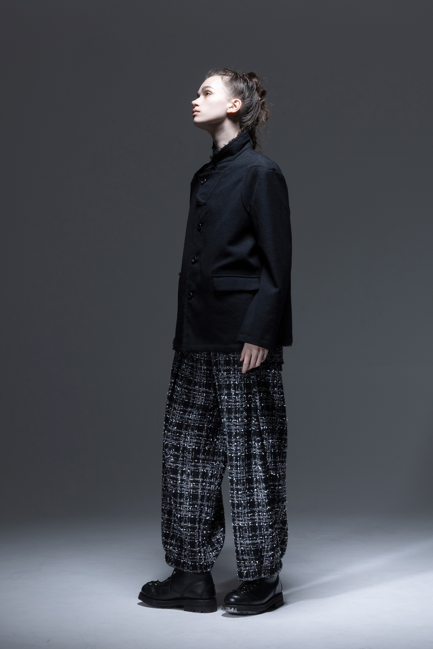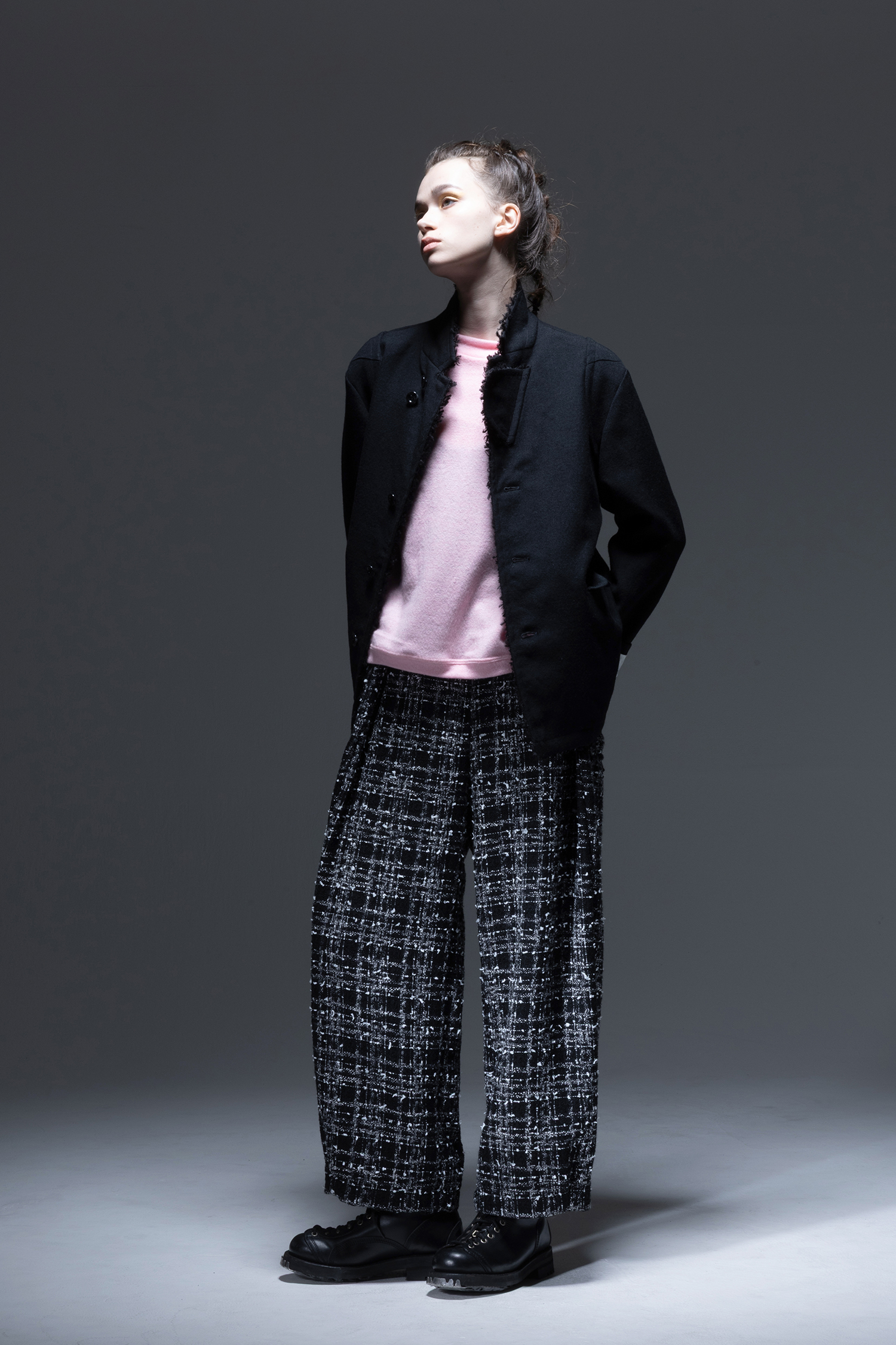 杢色スラブ糸やリボンヤーンなどの意匠糸を織り込んだ 黒色 ファンシーツィード素材を使用した、ウエストには深いタック、裾には小さなタックの入った、ワイドロングパンツ。