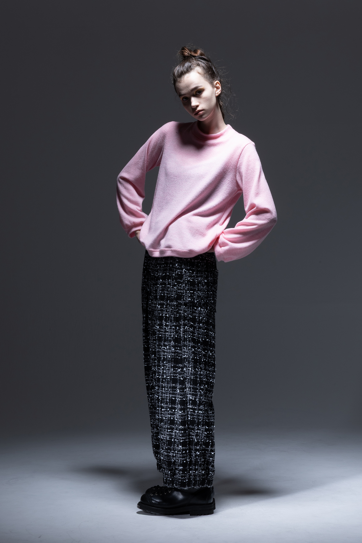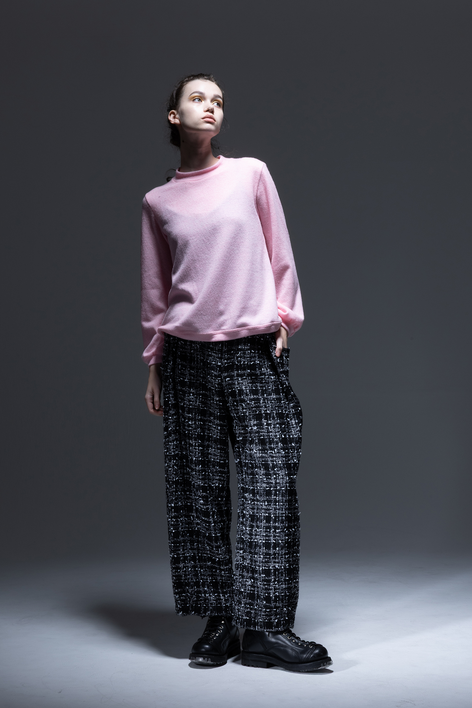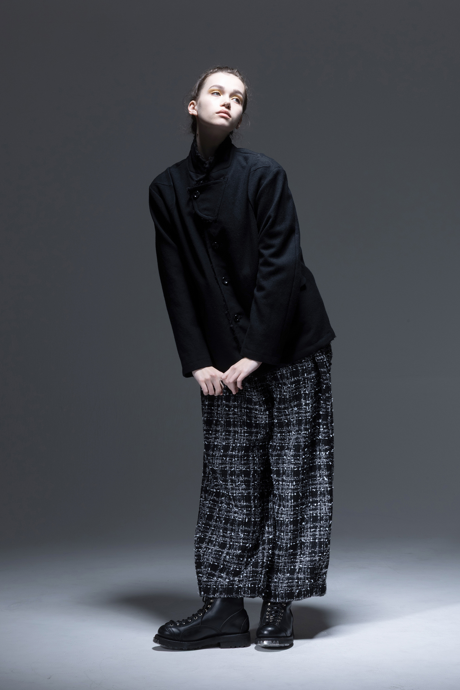 杢色スラブ糸やリボンヤーンなどの意匠糸を織り込んだ 黒色 ファンシーツィード素材を使用した、ウエストには深いタック、裾には小さなタックの入った、ワイドロングパンツ。