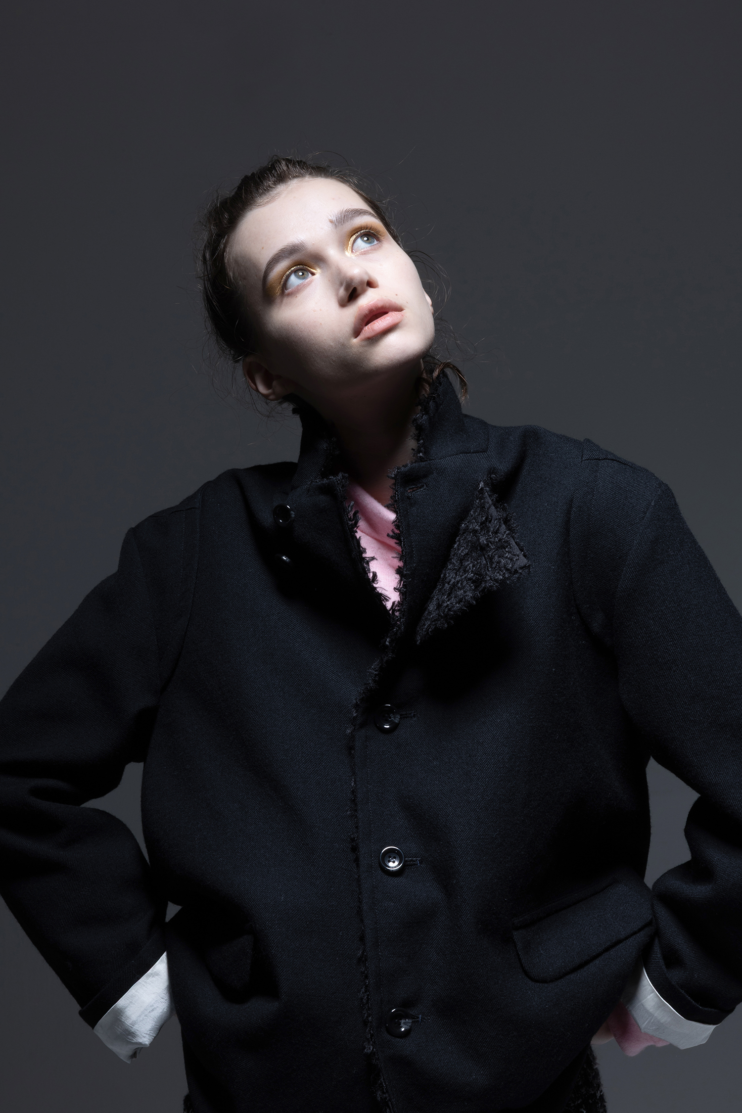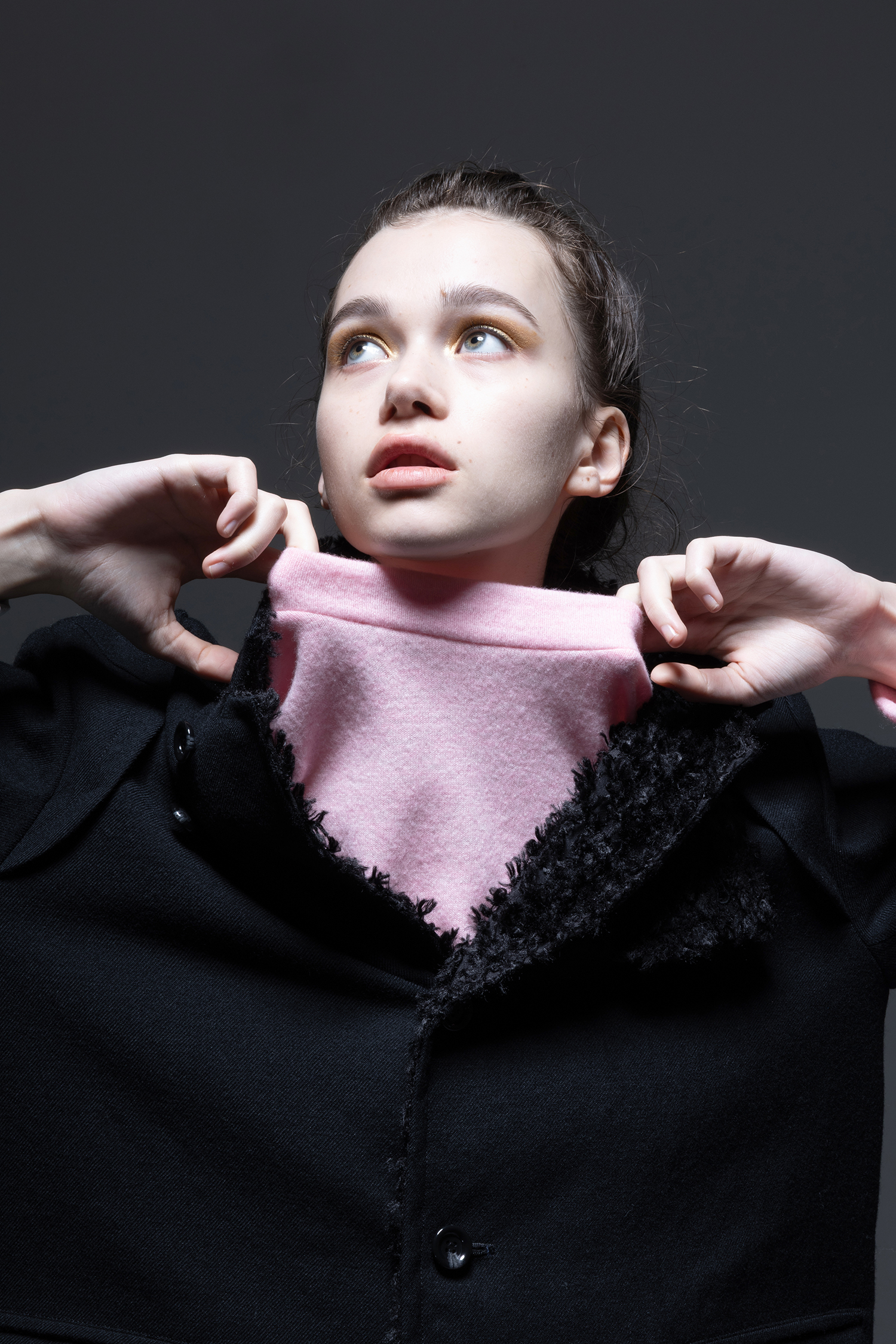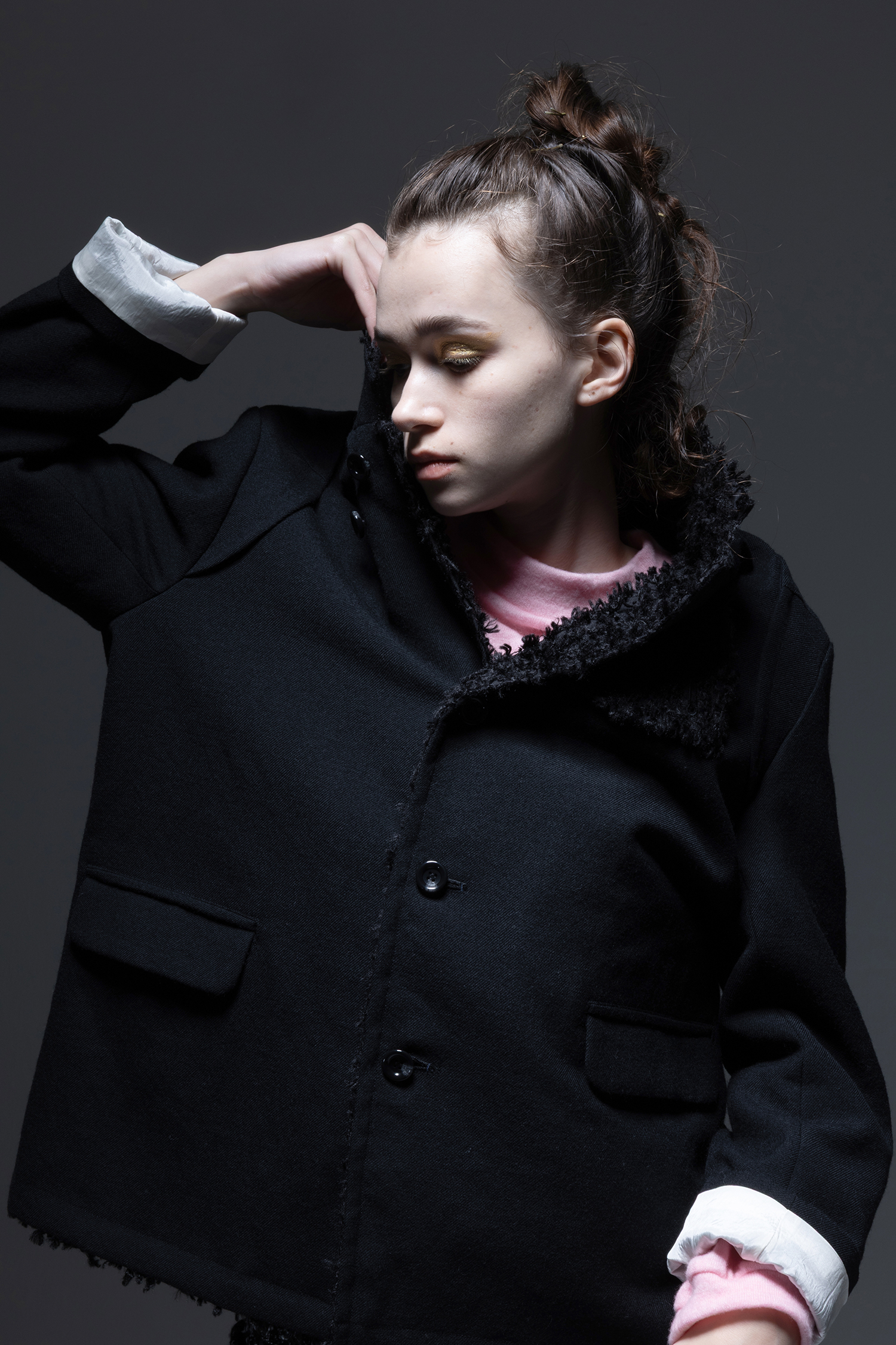 裏身頃と表襟とラペルにはプードルのような毛足が特徴の 黒色 カットジャカード素材を使用した、ウールの持つ油分を出来るだけ落としたドライタッチの 黒色 ウールギャバジン素材の、スタンドカラーとしても着用出来る、ラペルカラージャケット。