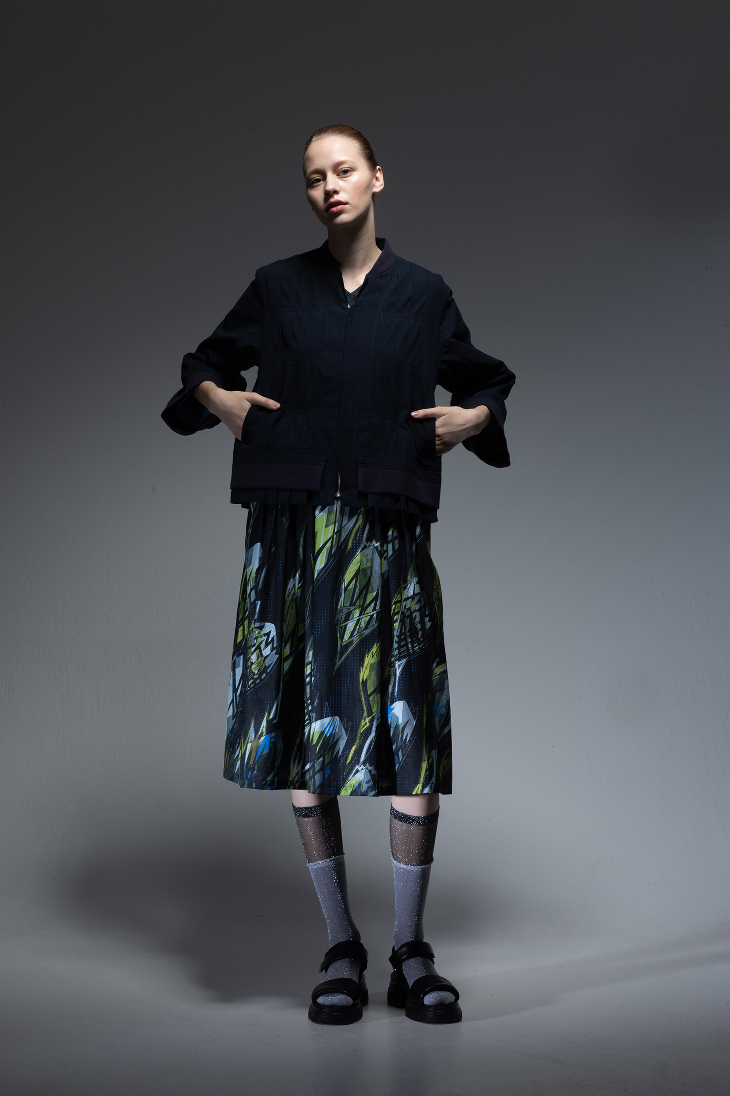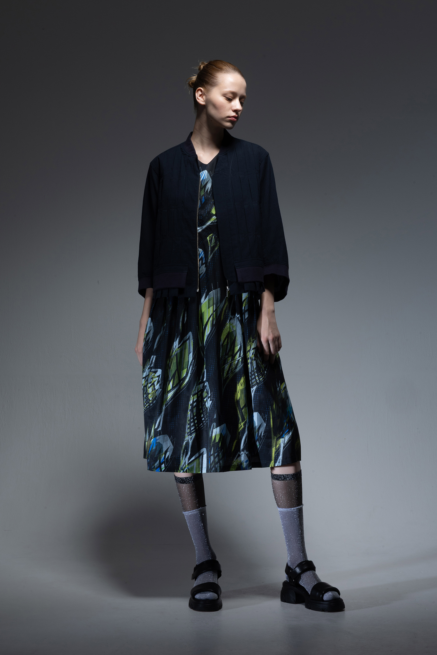 濃紺色のウォッシュド コットン コードレーン素材を使用、前後身頃にはプリーツを入れ、通常裾に付けるリブニットを身頃中間部に縫い合わせたデザインの、ジップアップブルゾン。