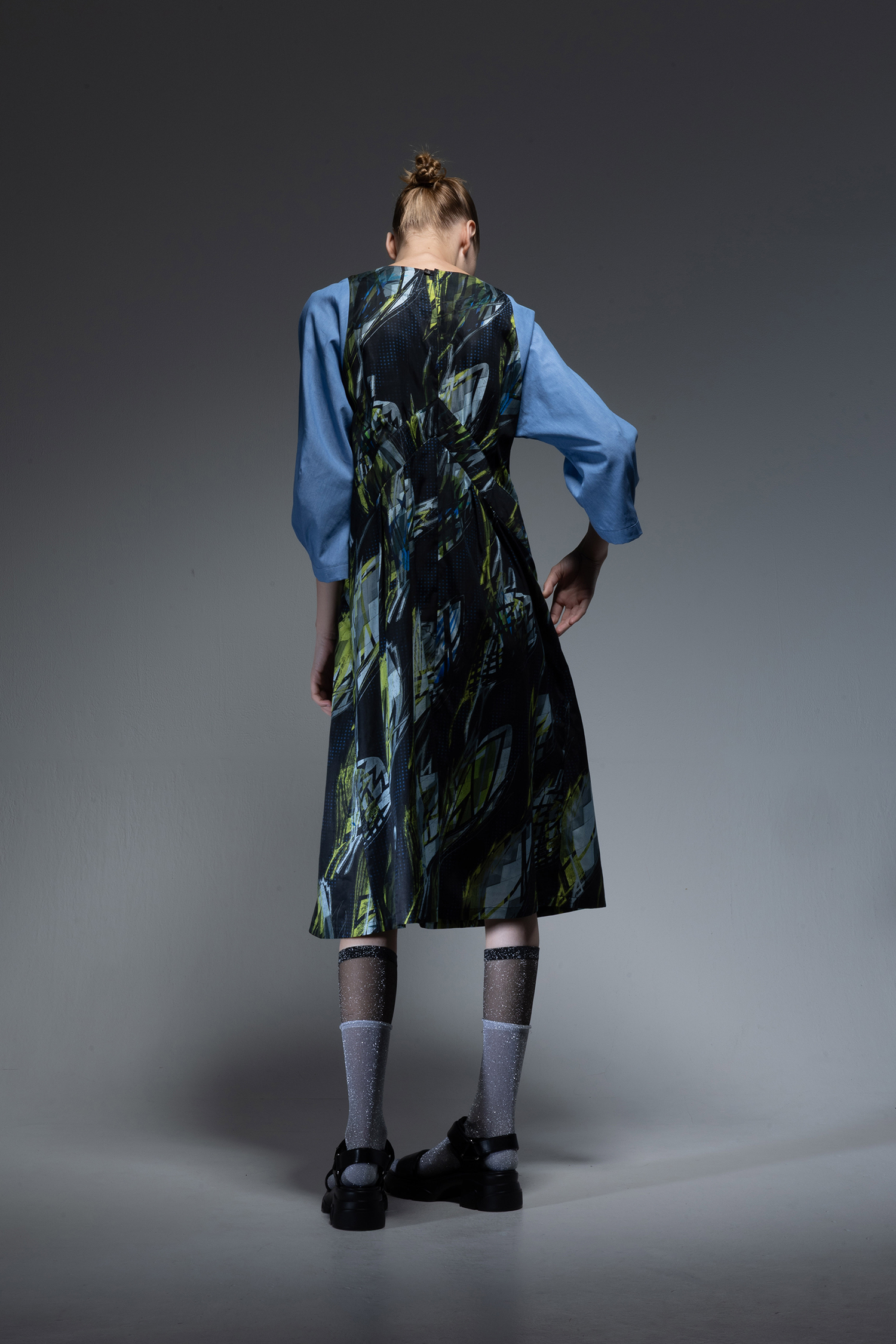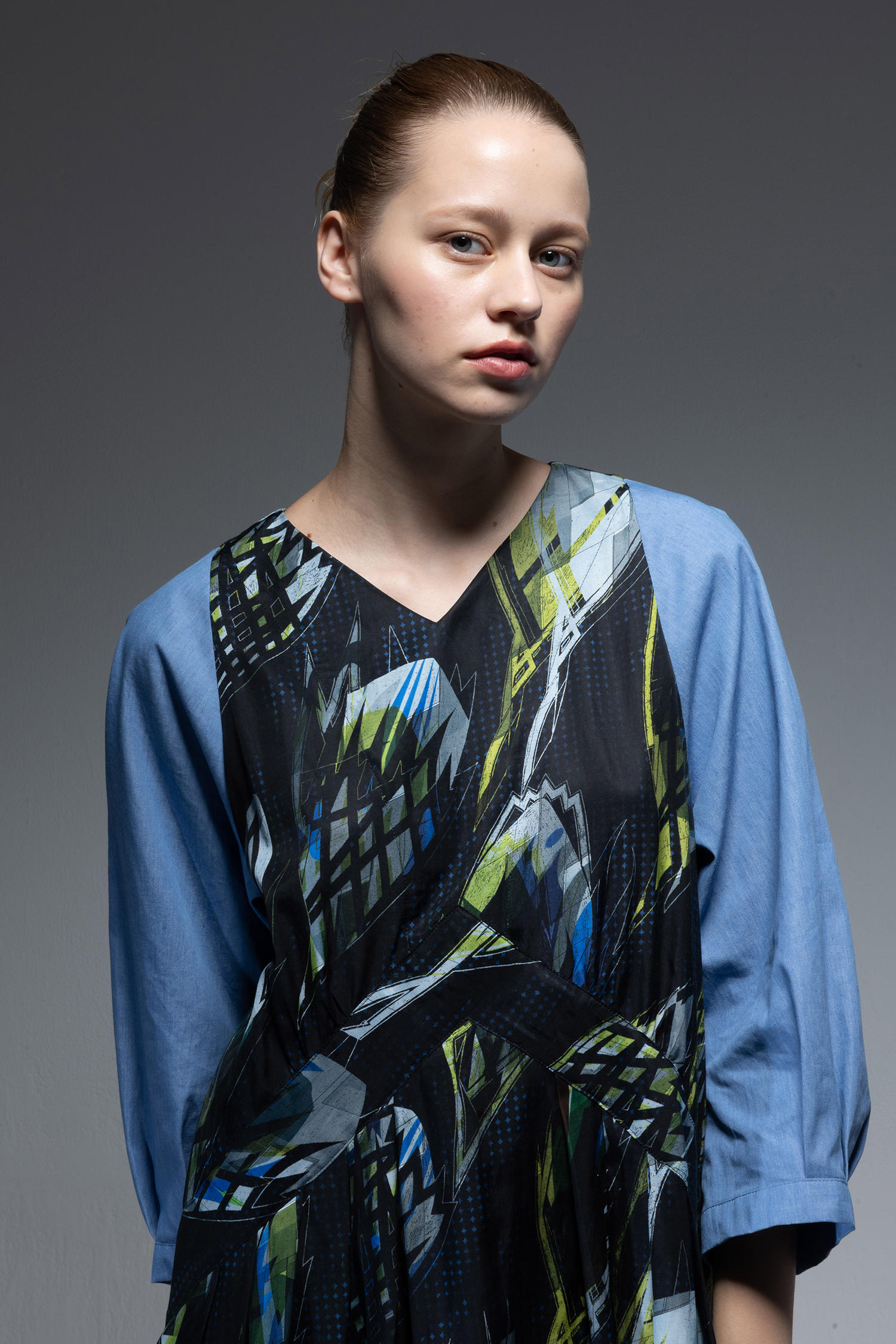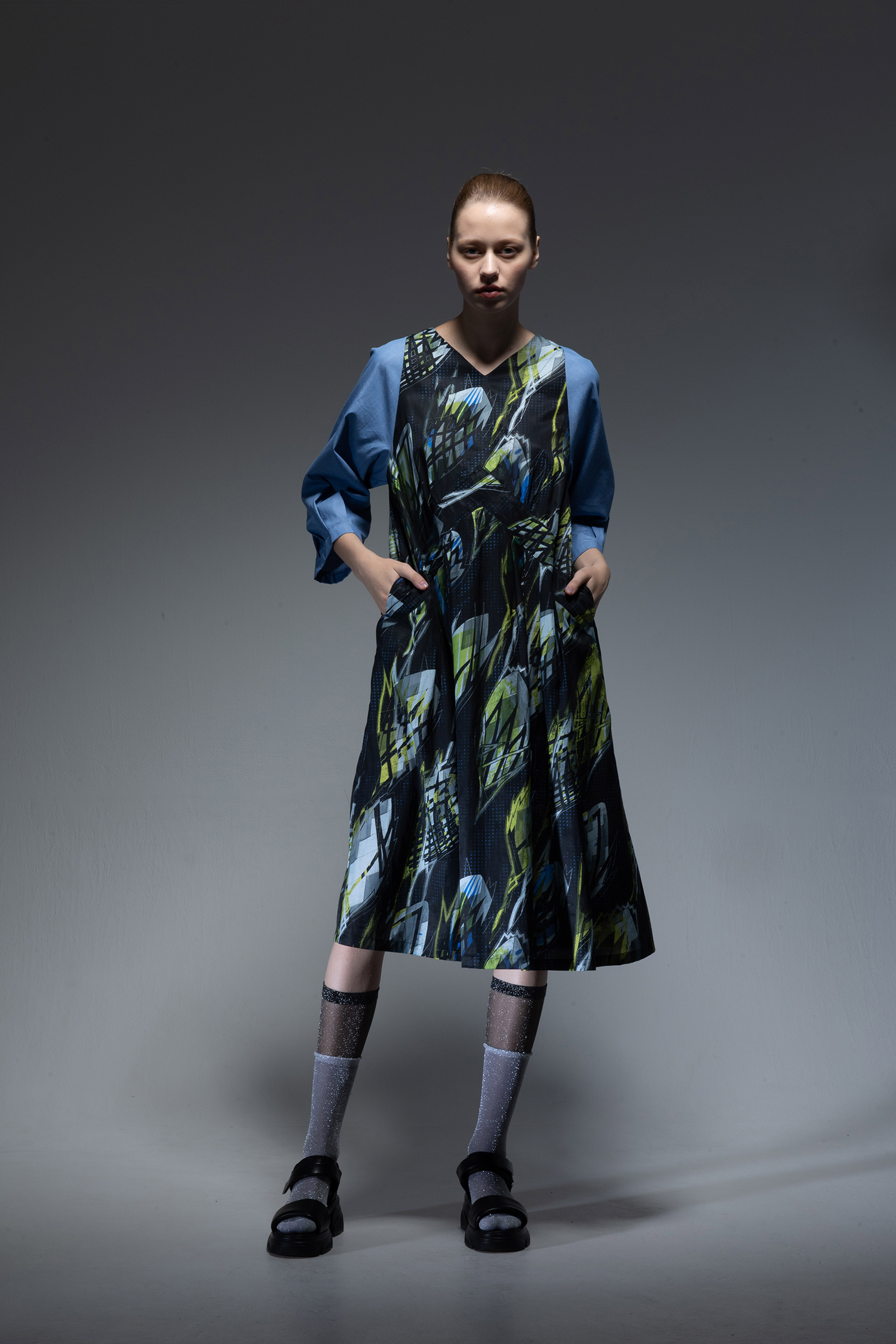 身頃部分には ”メタファー バッズ ” プリント キュプラ/コットンツイル素材を使用し、袖にはサックス色のインディゴ染めのライトオンスデニム素材を使用した、Vネック開きの膝下丈ドレス。