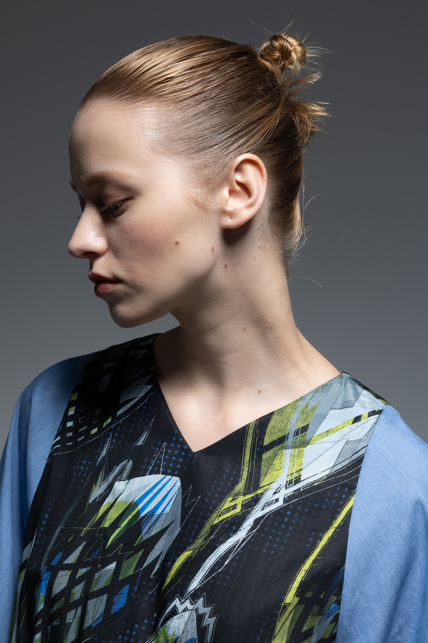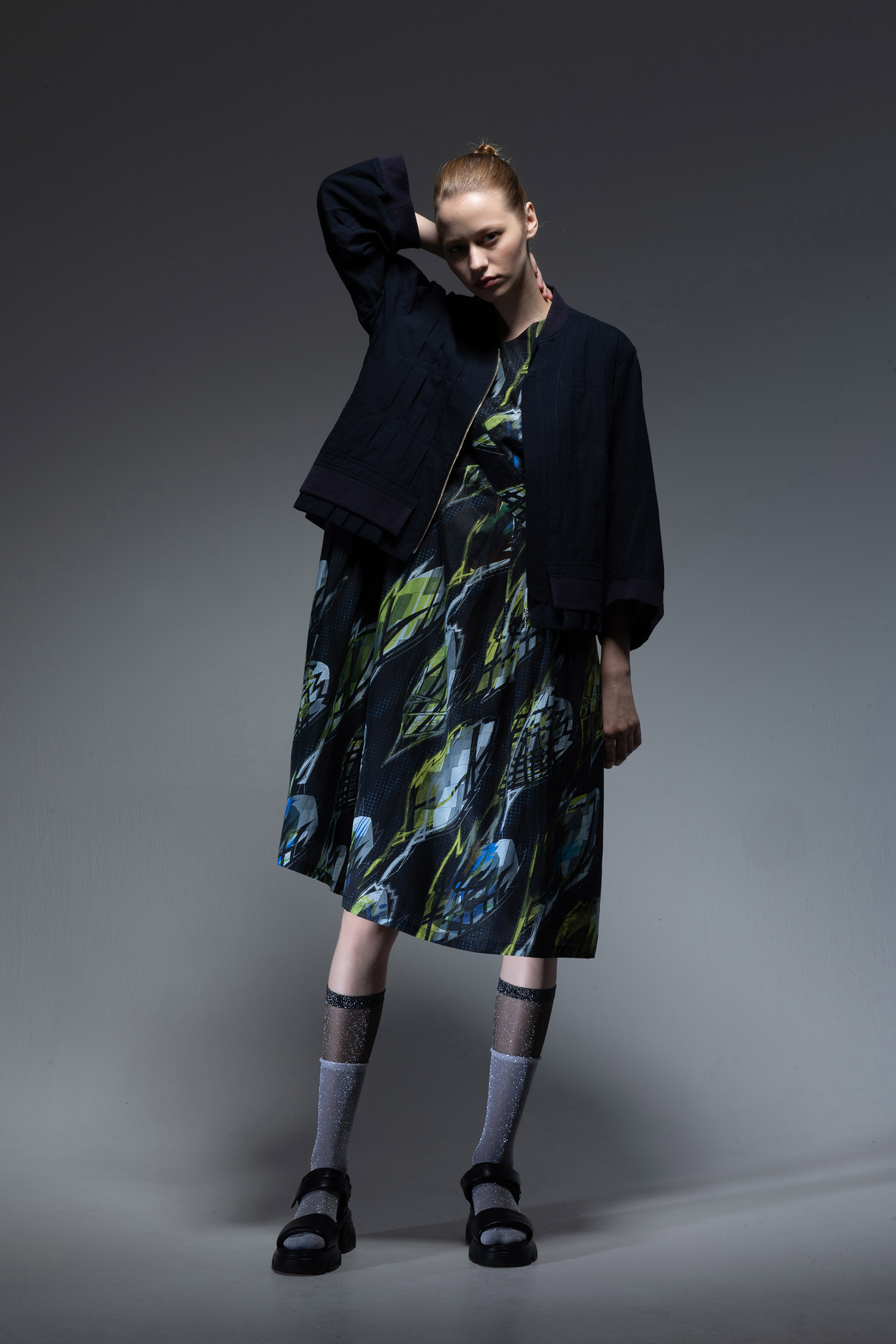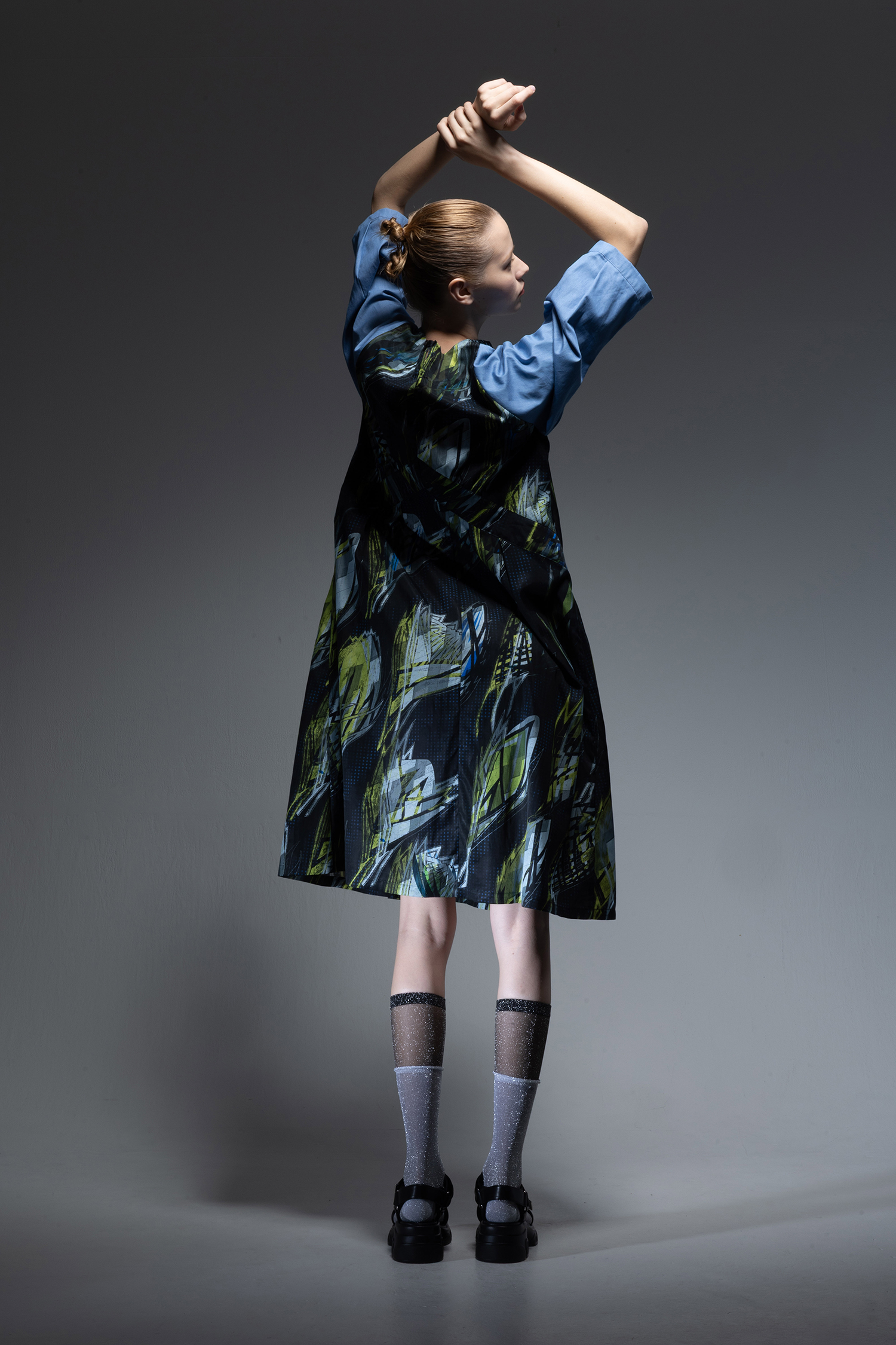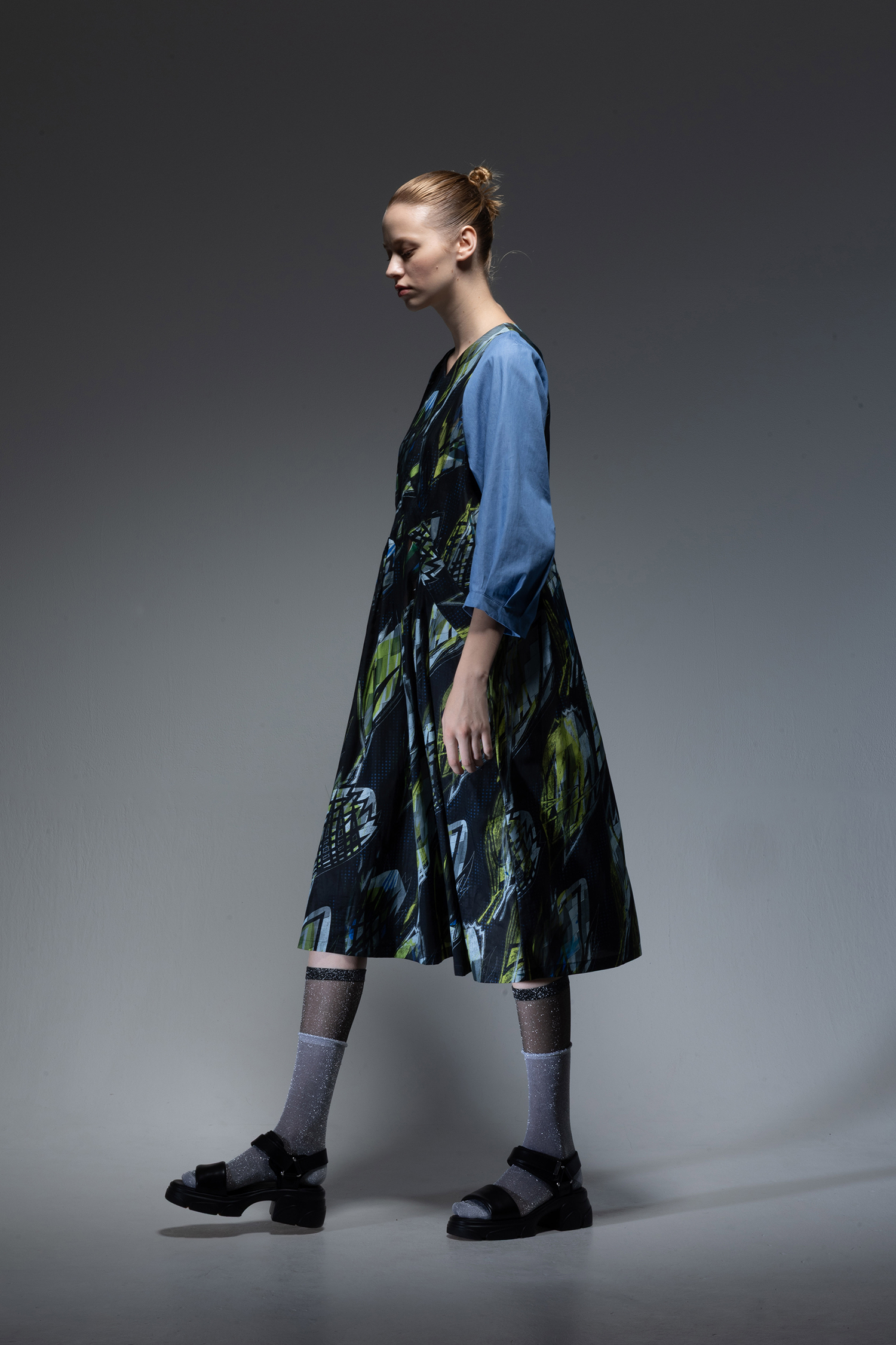 身頃部分には ”メタファー バッズ ” プリント キュプラ/コットンツイル素材を使用し、袖にはサックス色のインディゴ染めのライトオンスデニム素材を使用した、Vネック開きの膝下丈ドレス。
