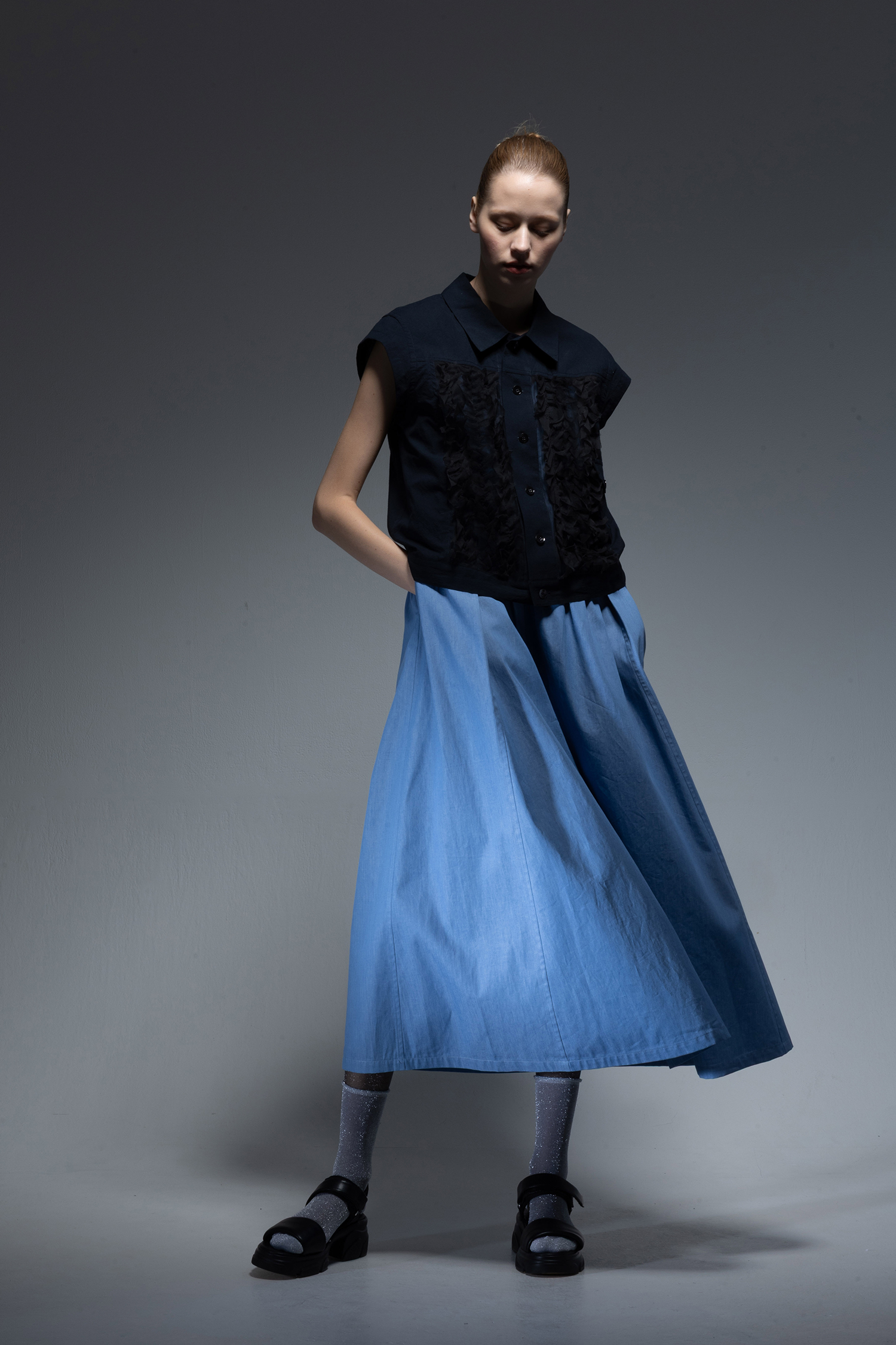 サックス色のインディゴ染めのライトオンスデニム素材を使用した、縦に二段のギャザーが走るデザインのクルーネックロングドレス。