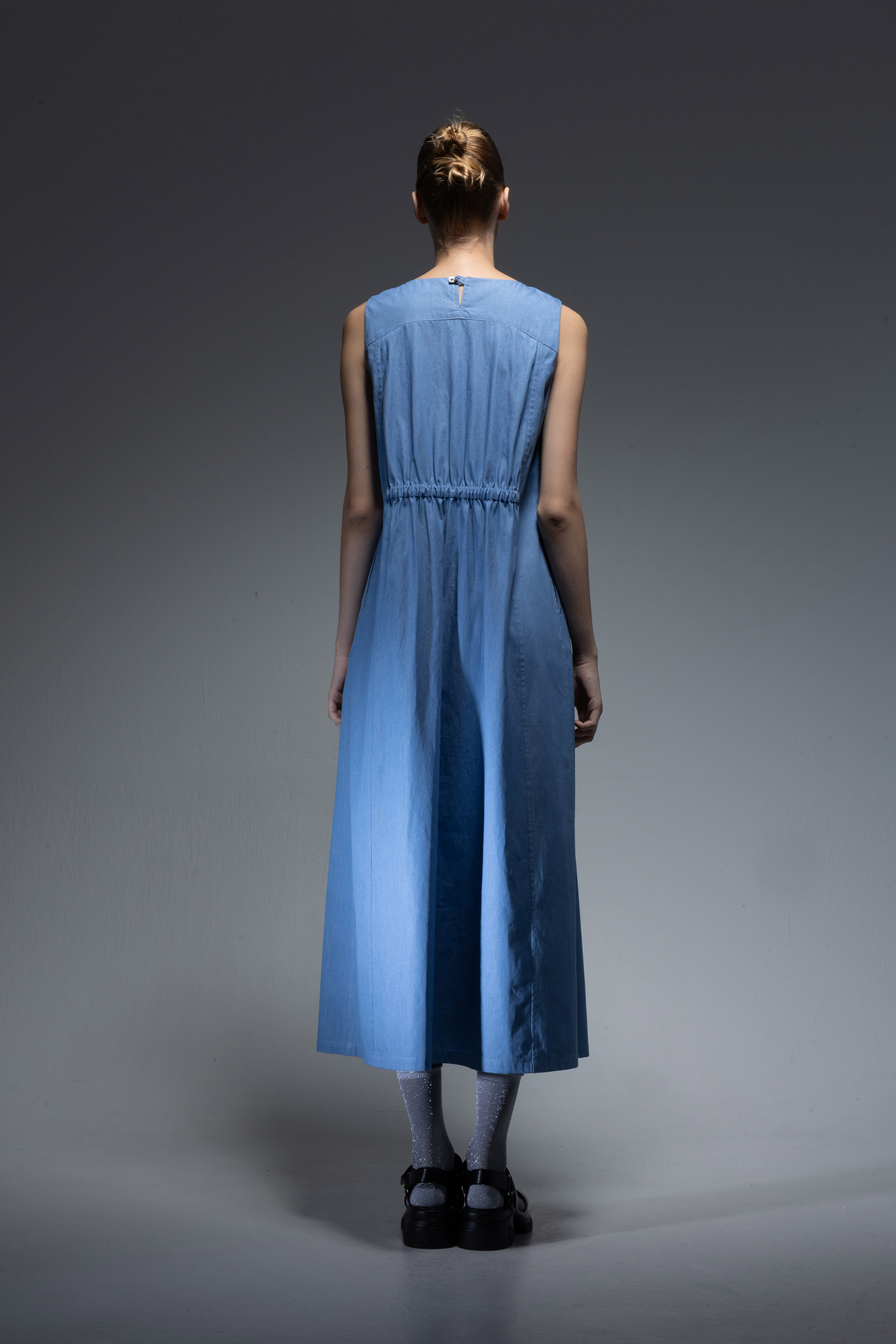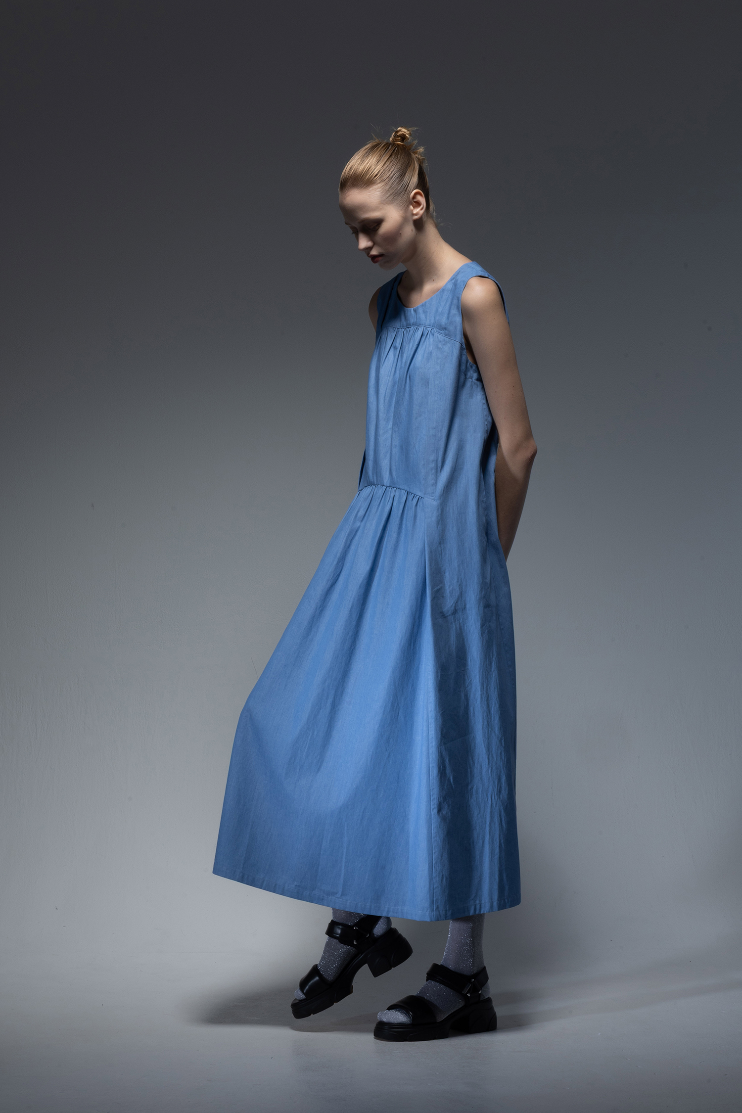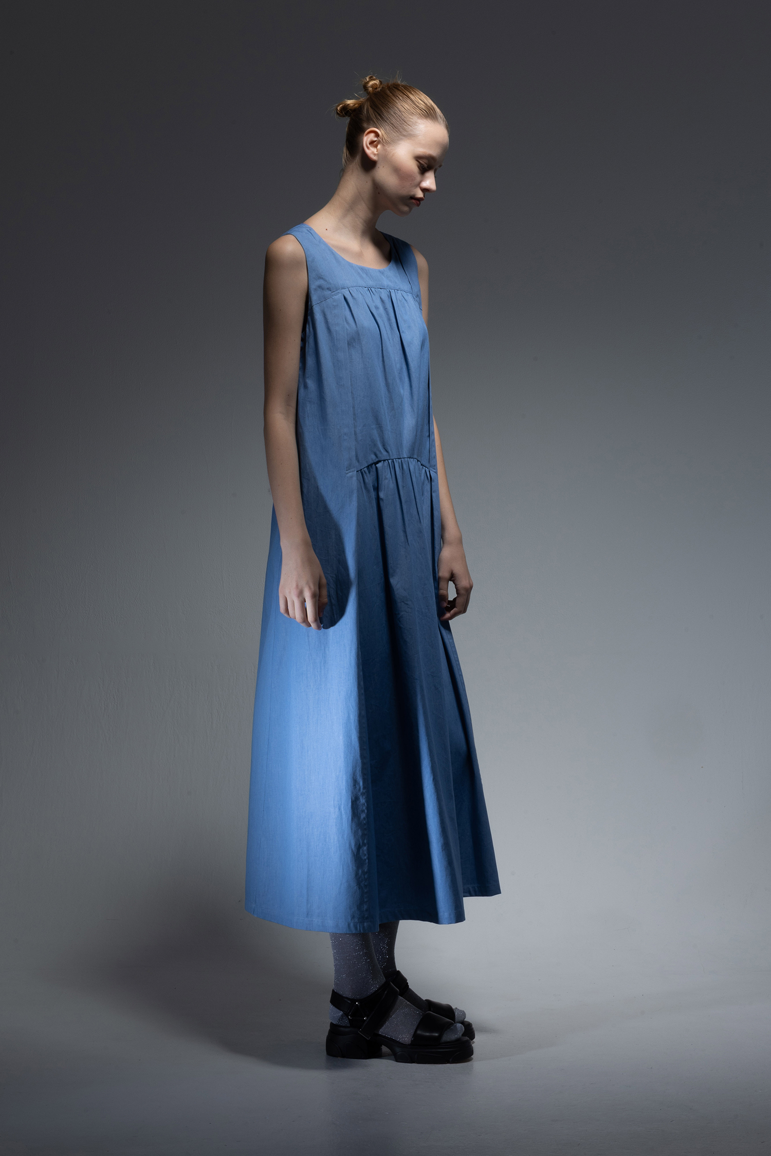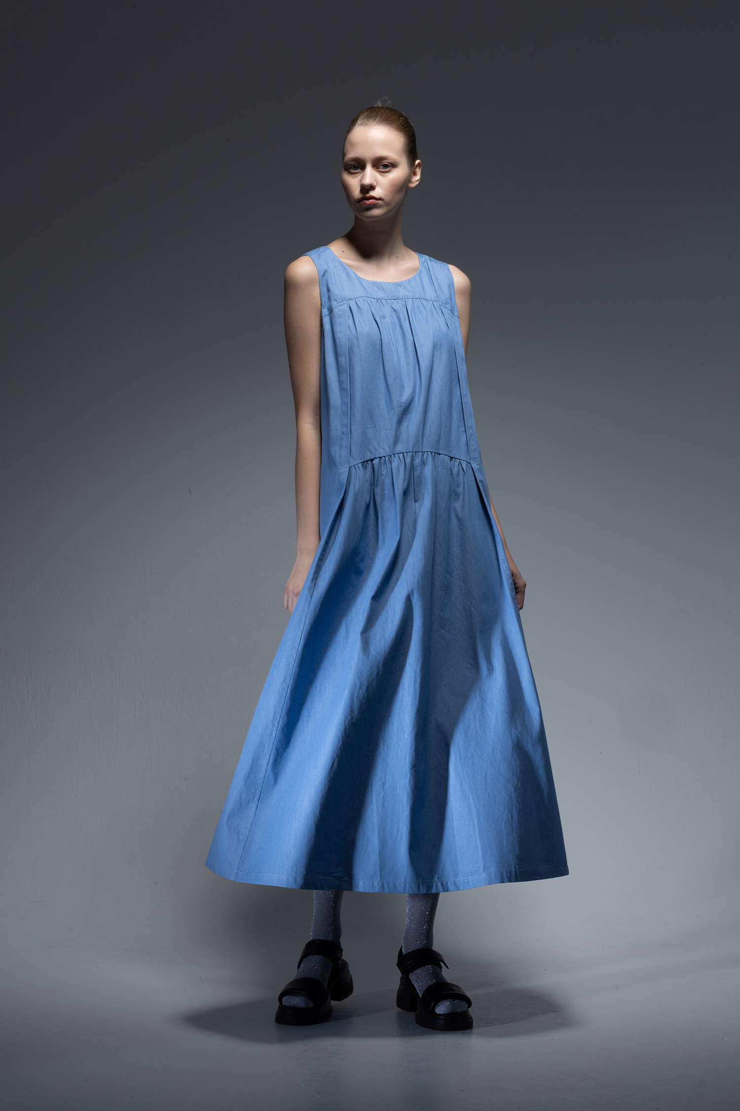 Crewneck long dress with two vertical tiers of gathers in saxe light-weight indigo-dyed denim.