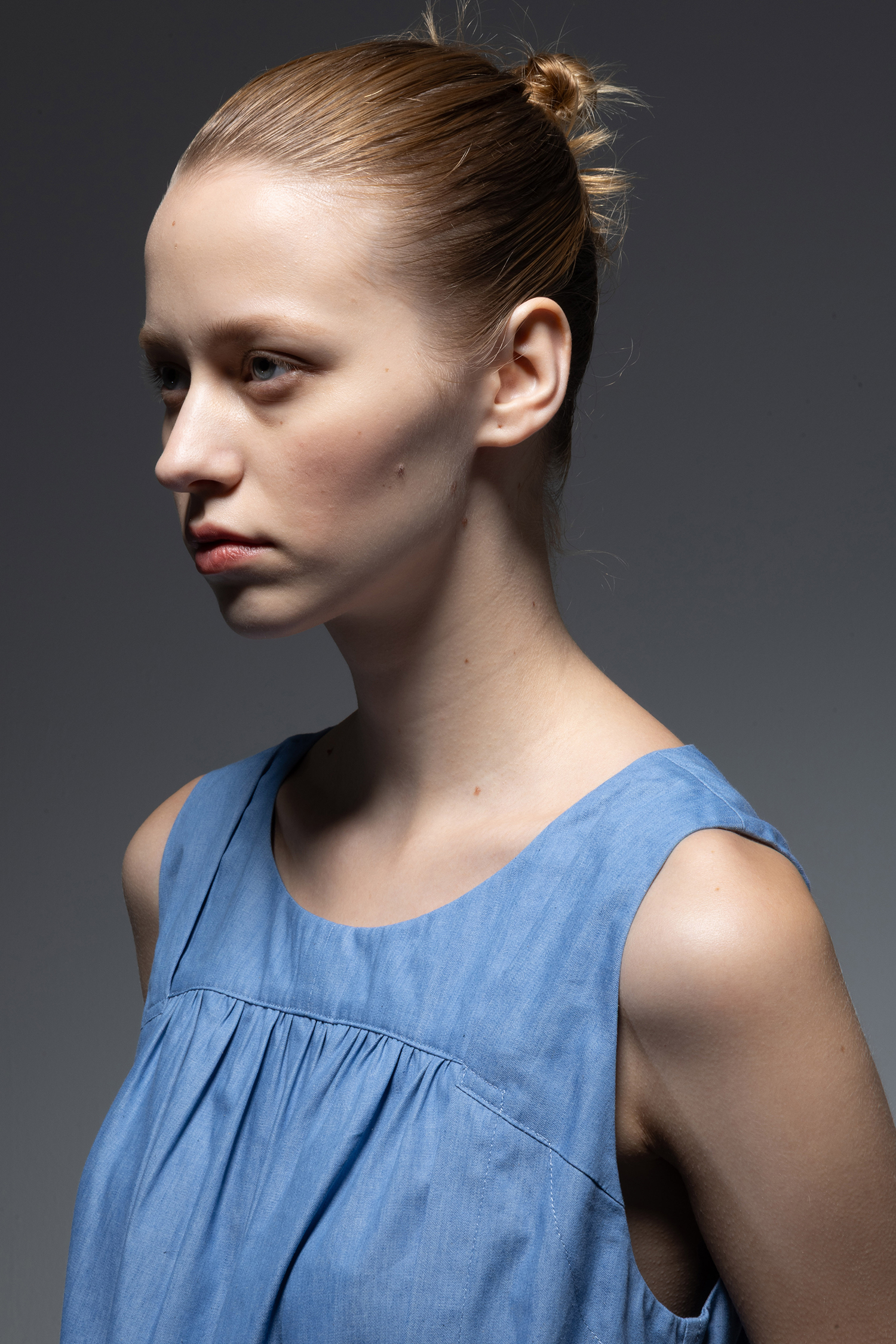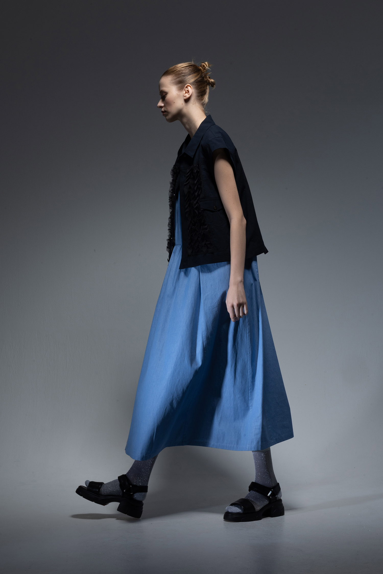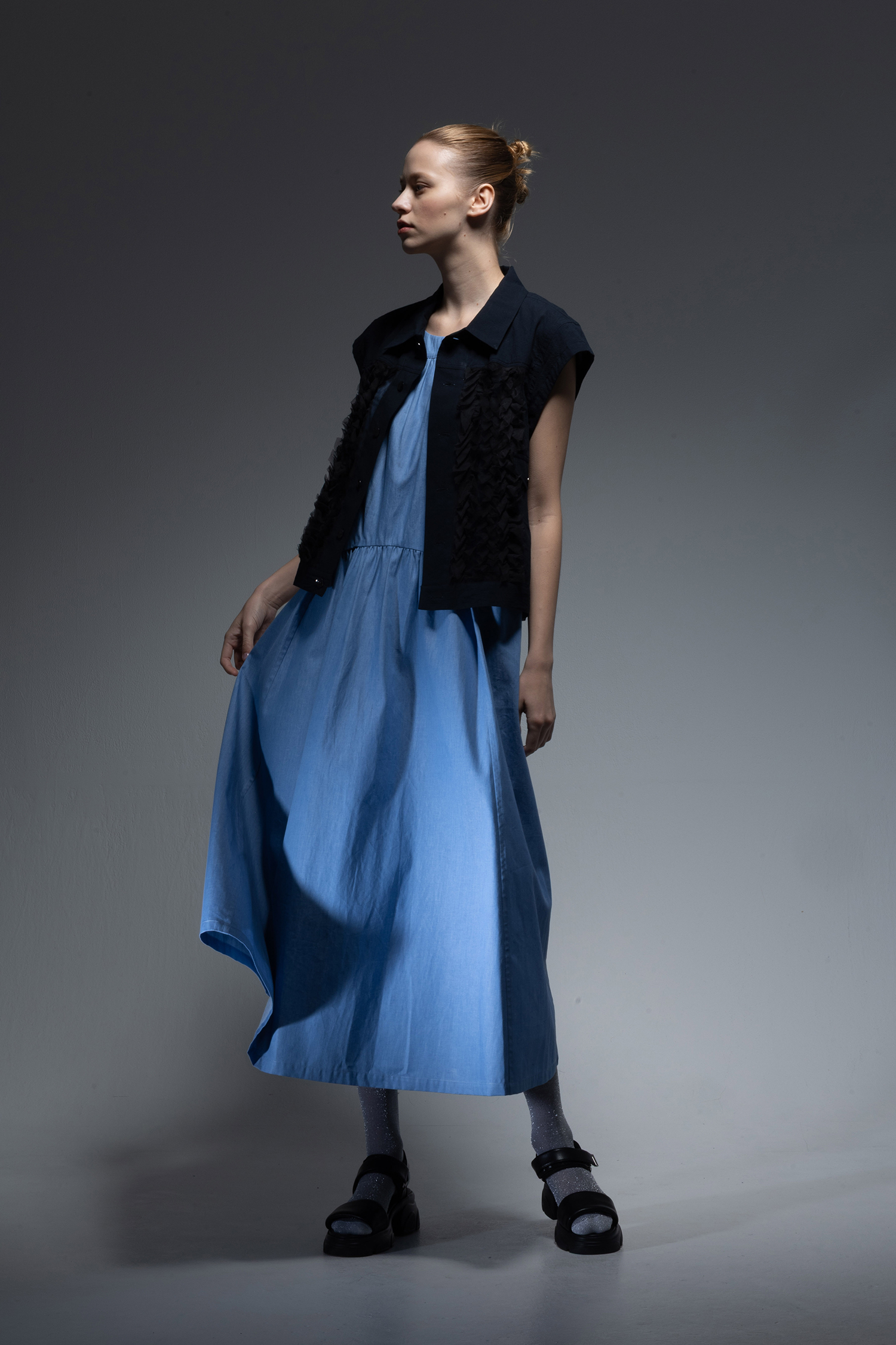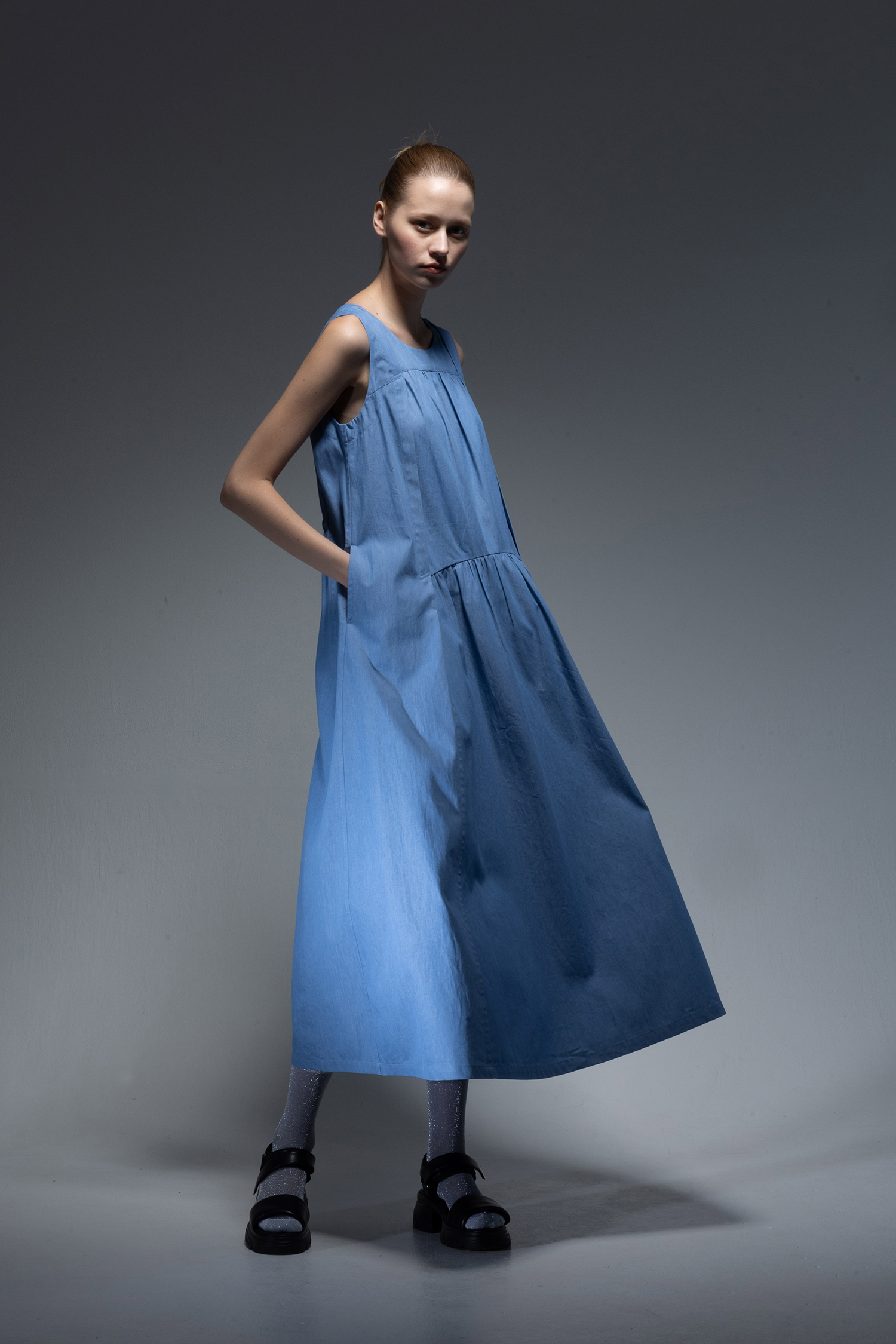 Crewneck long dress with two vertical tiers of gathers in saxe light-weight indigo-dyed denim.