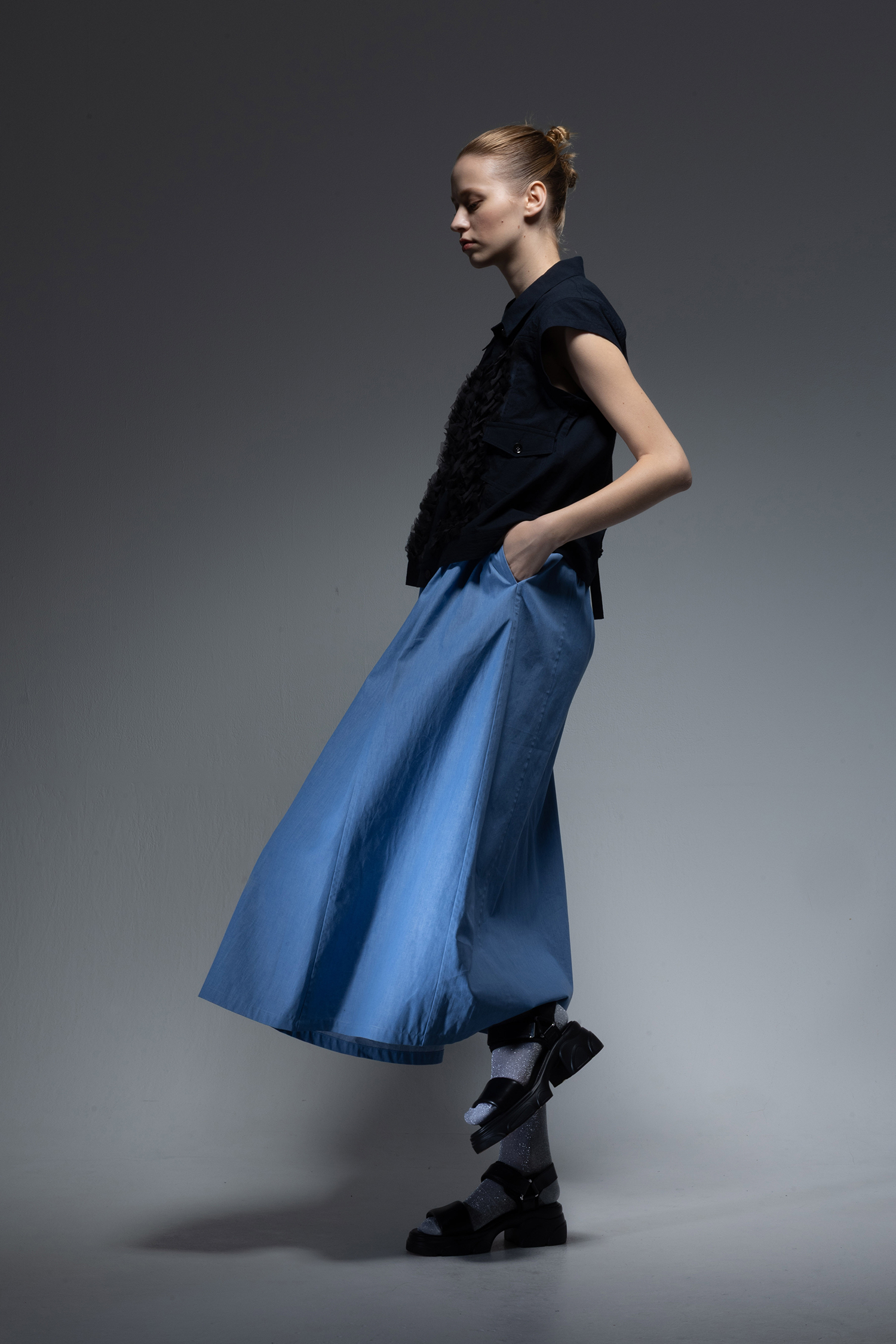 Short sleeves top with a denim jacket design with metal buttons and black frill fabric on the both chest in navy washed cotton cordlane.