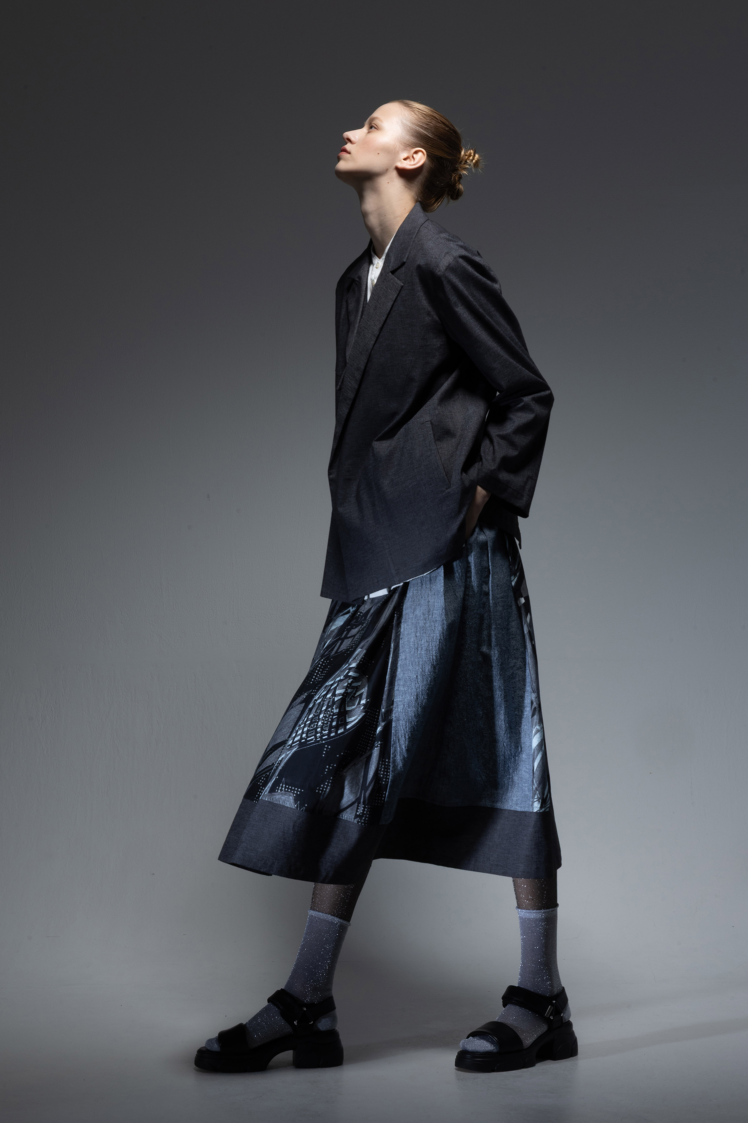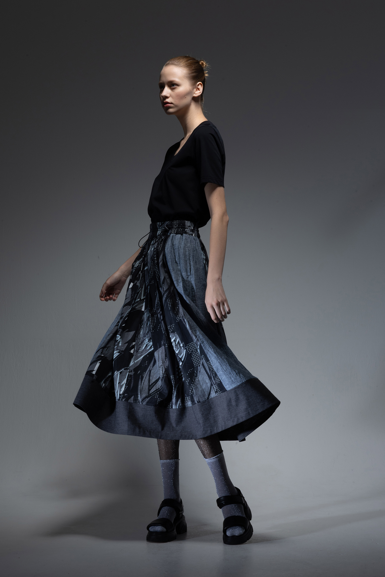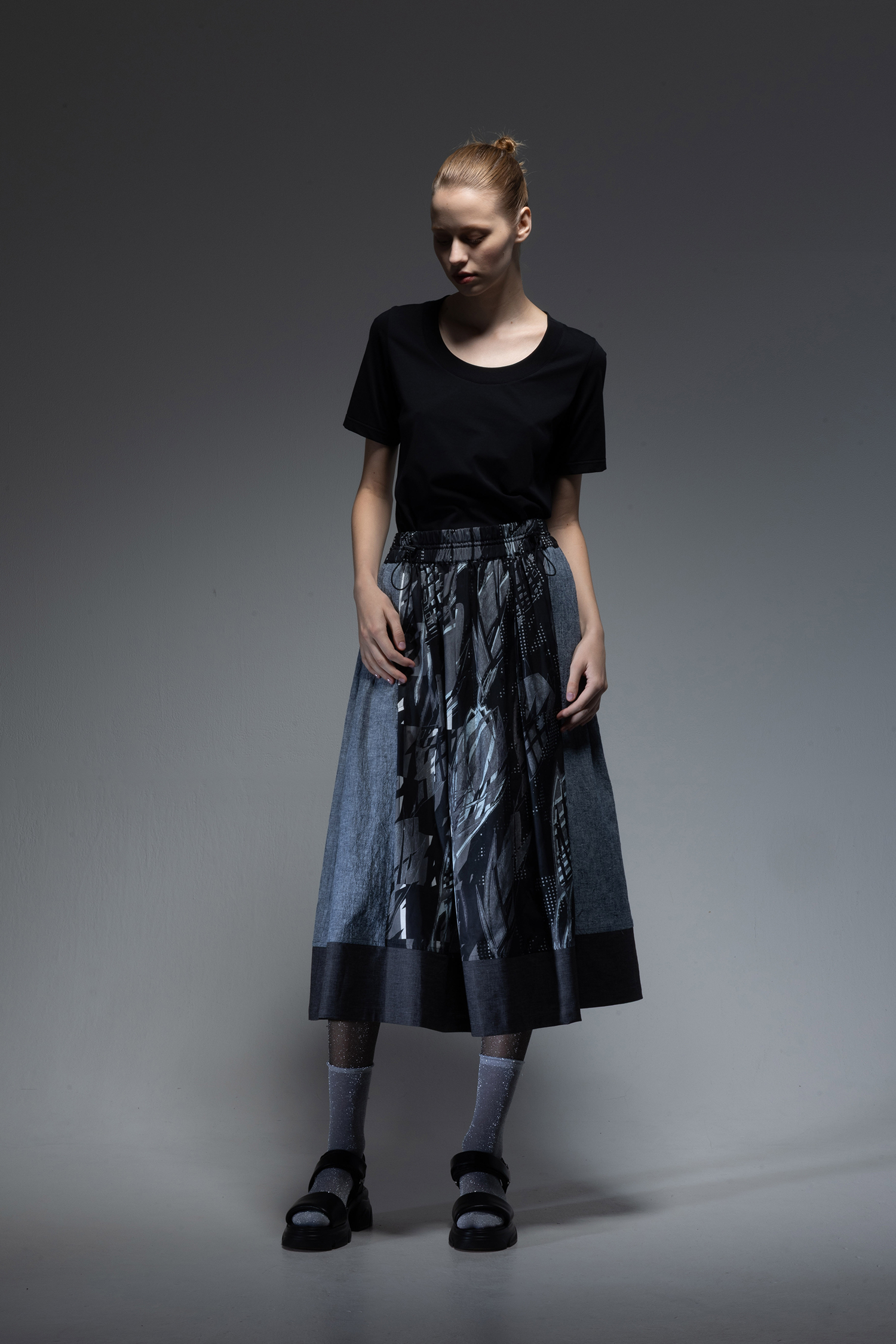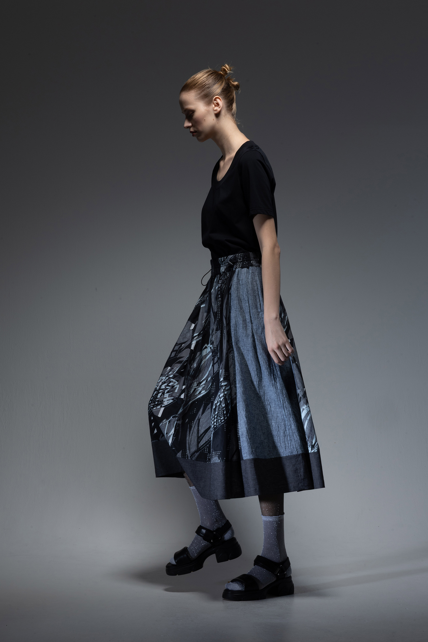 身頃中央には ”メタファー サンダー ” プリント キュプラ/コットン ツイル素材、脇にはムラ染めしたインディゴ糸で織られたウォッシュド コットン/ヘンプ シーチング素材、裾にはシャンブレー チャコール色 オーガニックヘンプ/リサイクルポリエステル タイプライター素材を組み合わせた、膝下丈ギャザースカート。