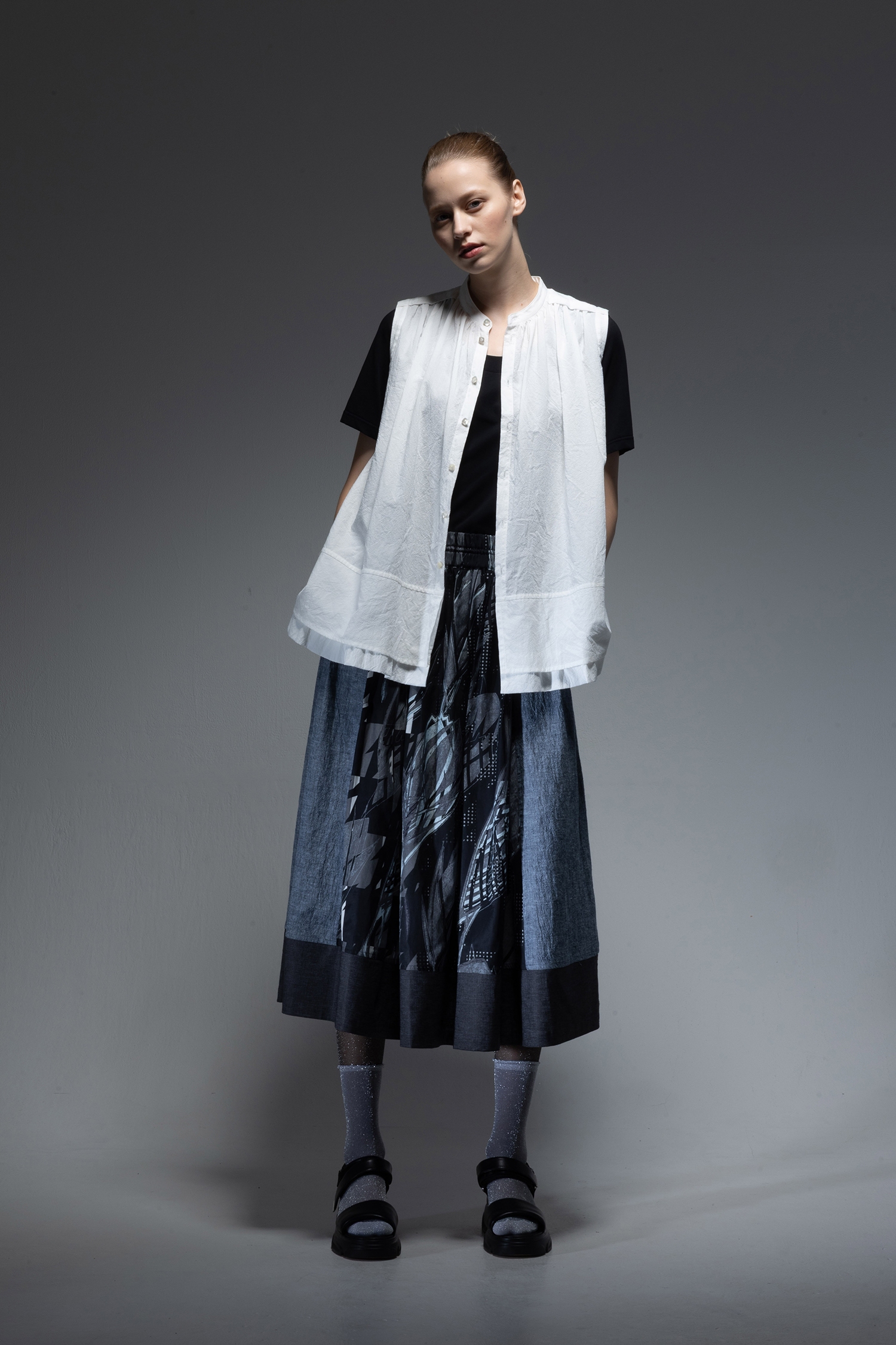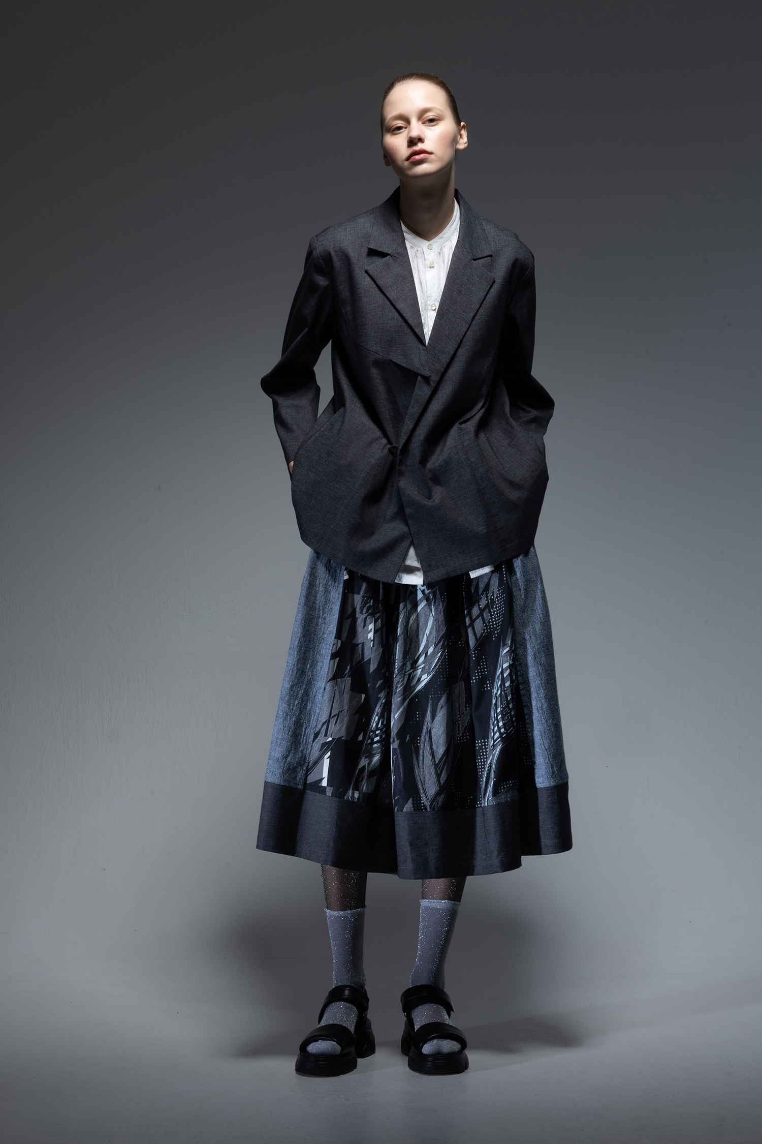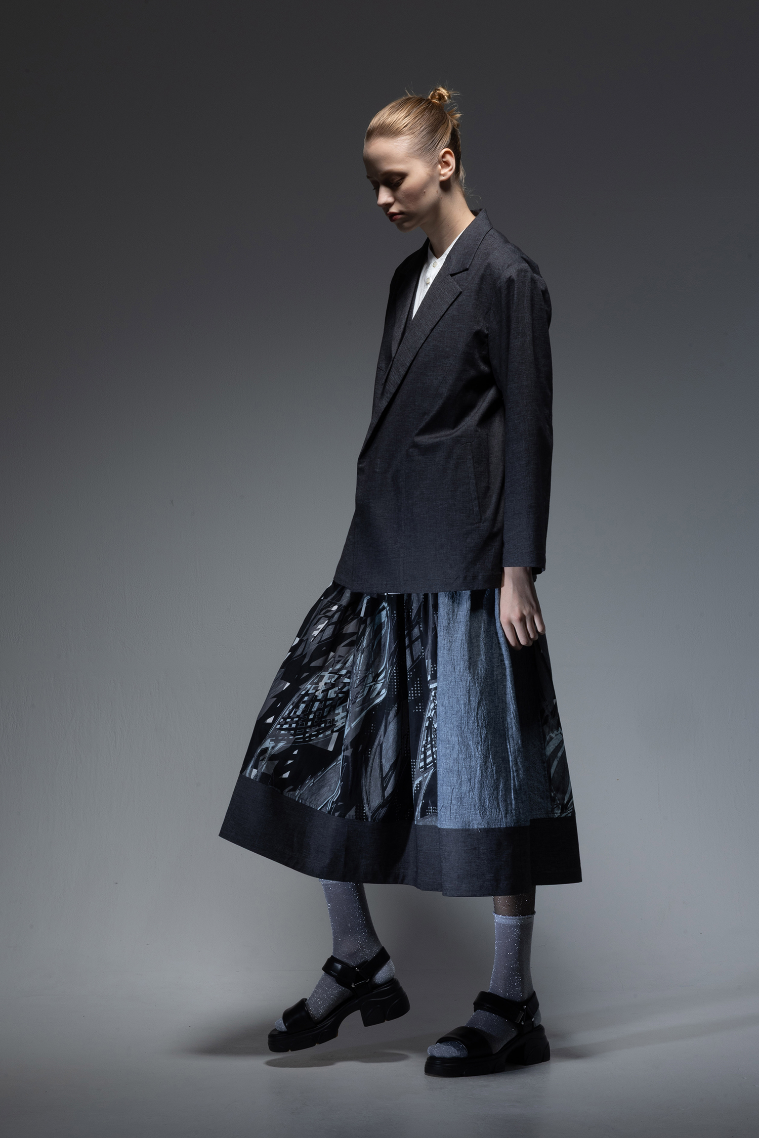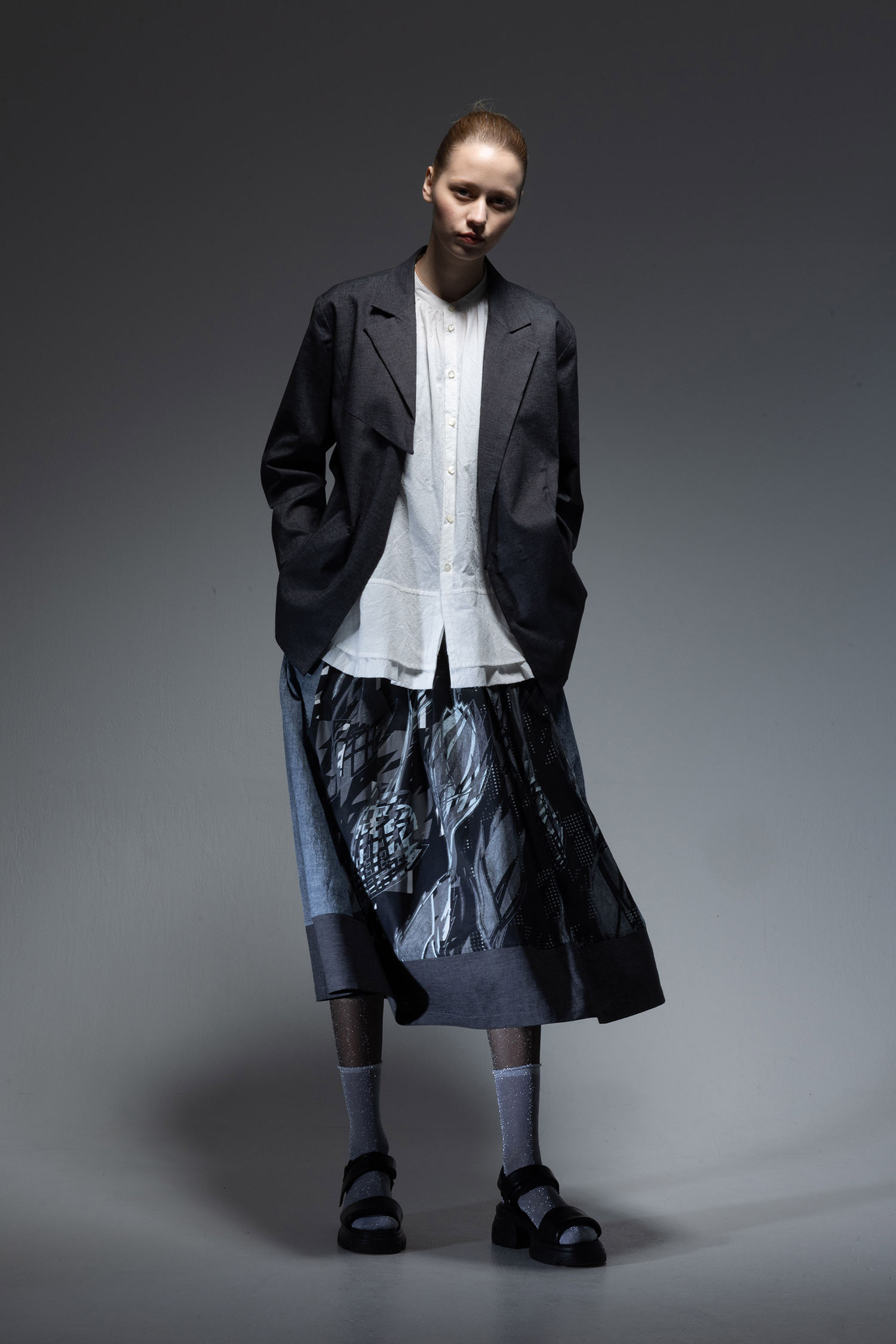 身頃中央には ”メタファー サンダー ” プリント キュプラ/コットン ツイル素材、脇にはムラ染めしたインディゴ糸で織られたウォッシュド コットン/ヘンプ シーチング素材、裾にはシャンブレー チャコール色 オーガニックヘンプ/リサイクルポリエステル タイプライター素材を組み合わせた、膝下丈ギャザースカート。