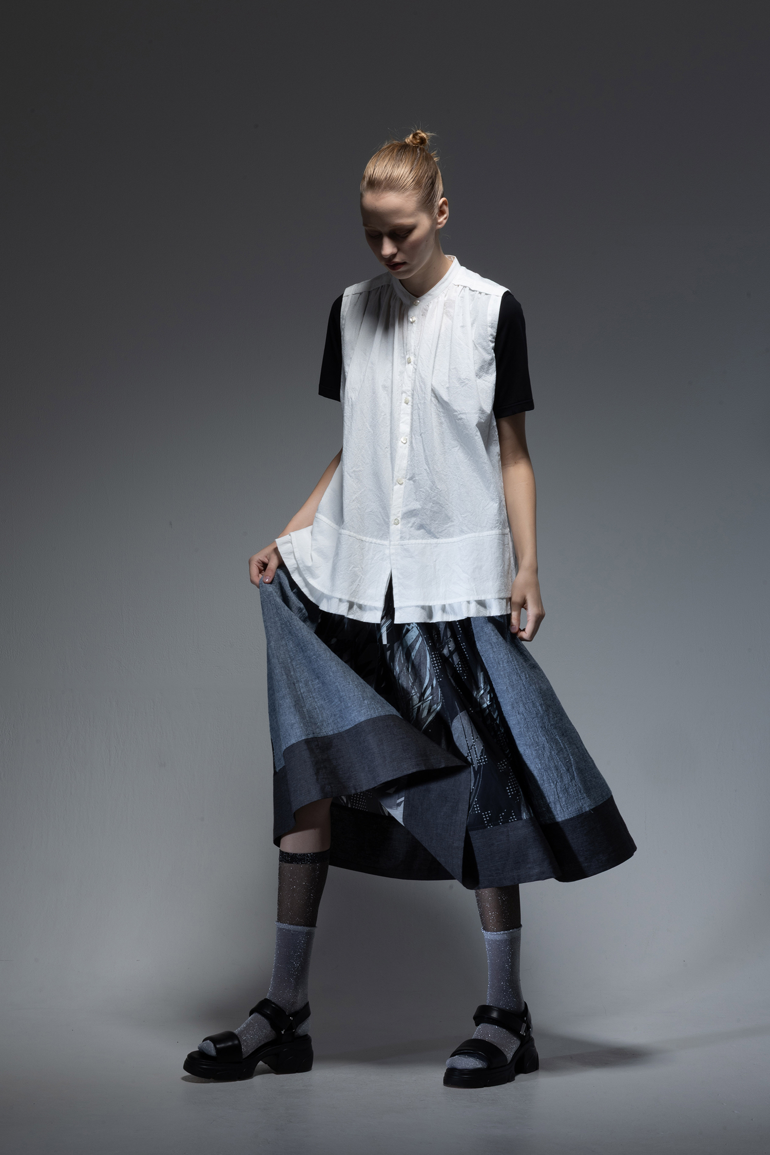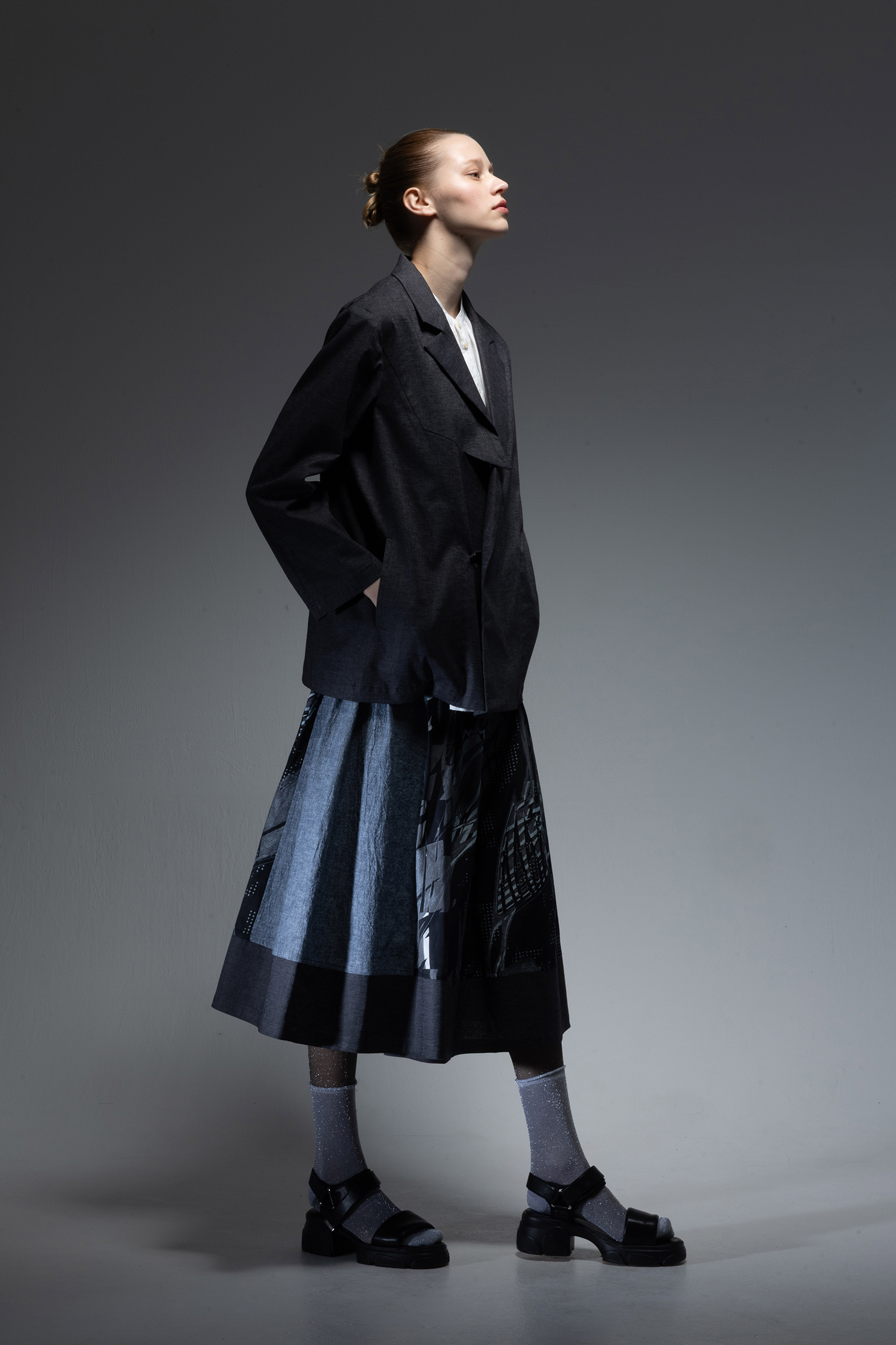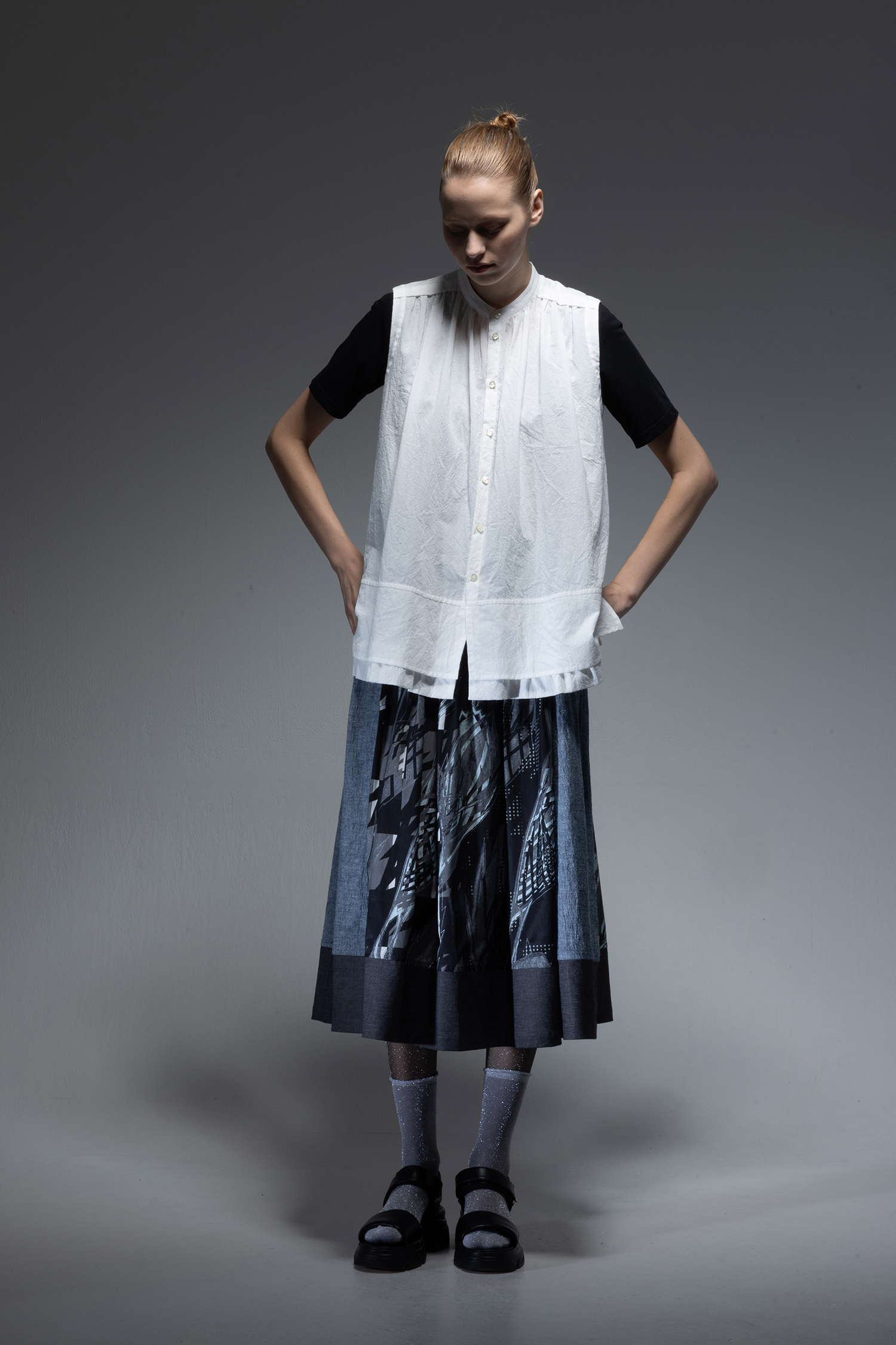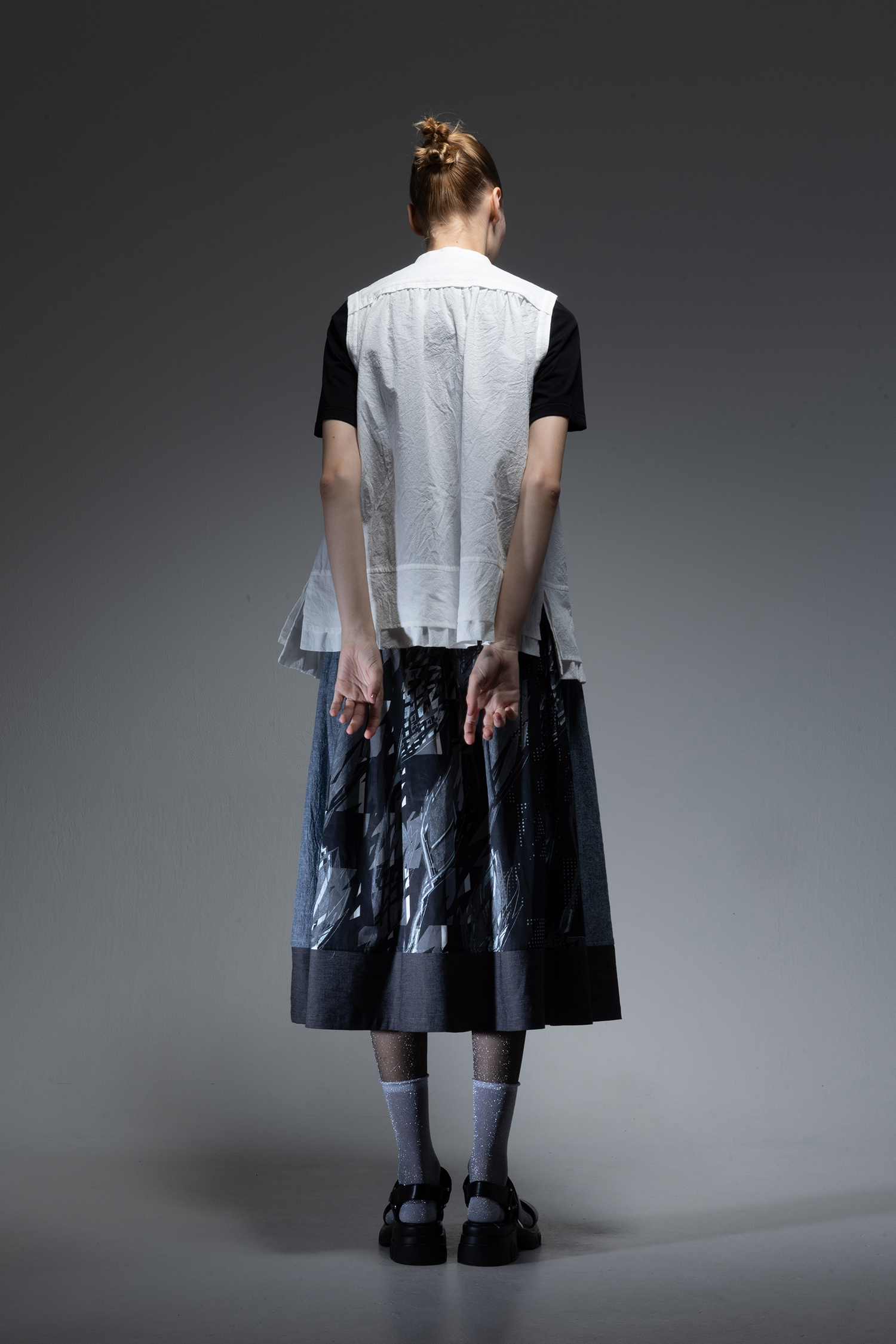 身頃中央には ”メタファー サンダー ” プリント キュプラ/コットン ツイル素材、脇にはムラ染めしたインディゴ糸で織られたウォッシュド コットン/ヘンプ シーチング素材、裾にはシャンブレー チャコール色 オーガニックヘンプ/リサイクルポリエステル タイプライター素材を組み合わせた、膝下丈ギャザースカート。