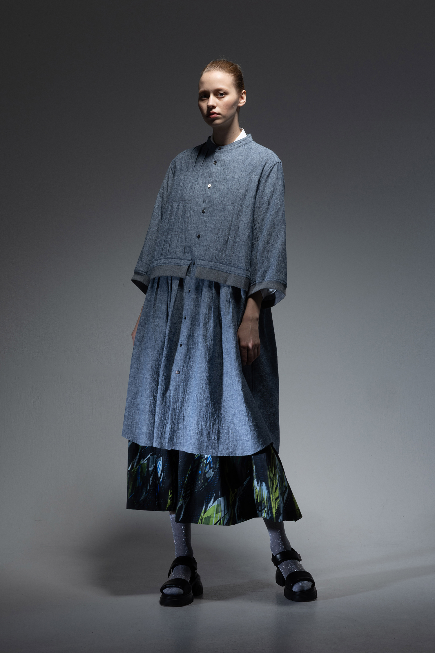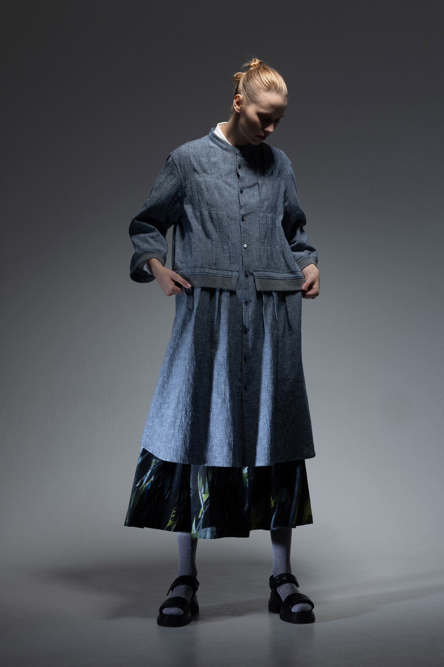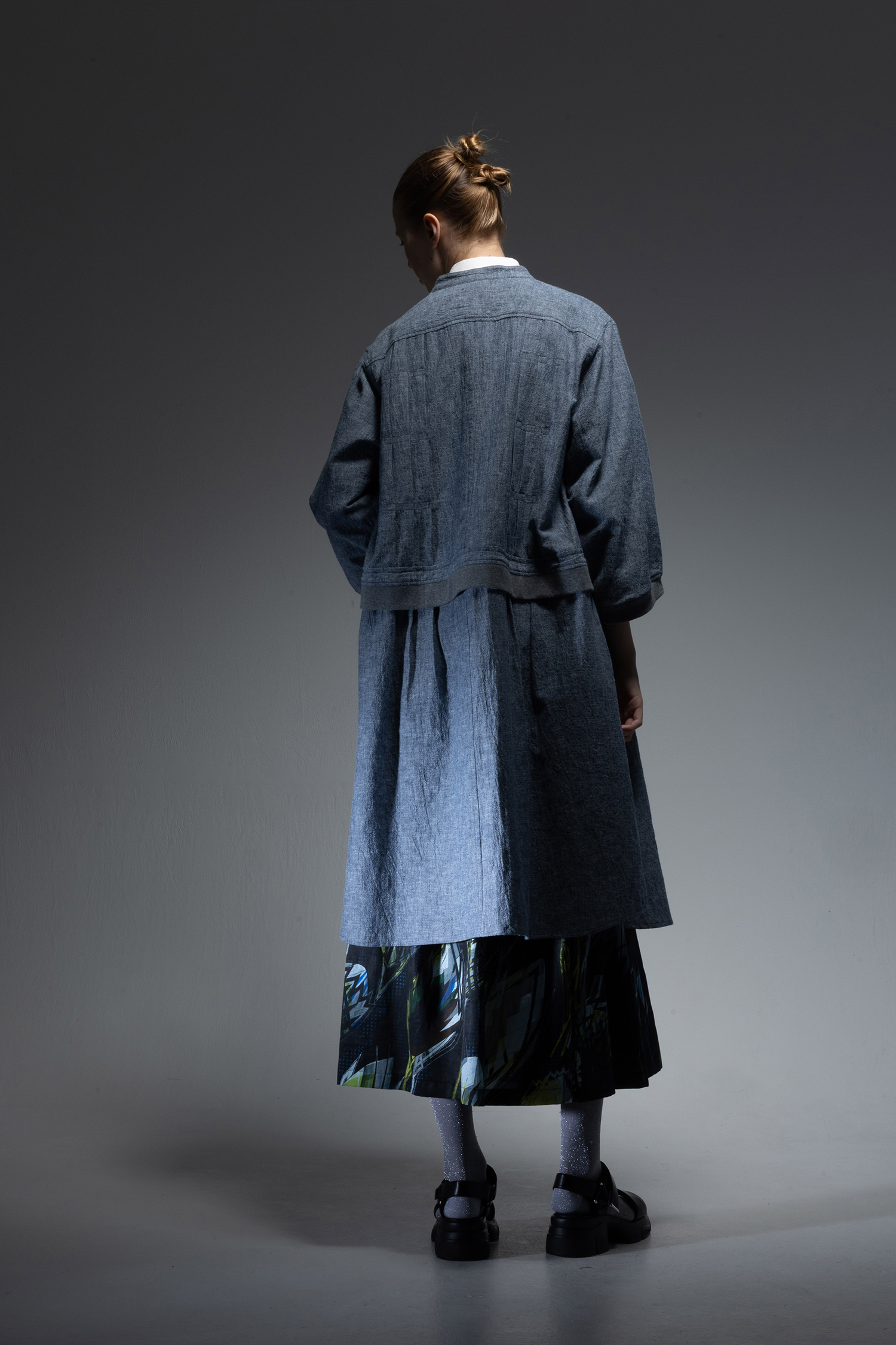 ムラ染めしたインディゴ 糸で織られたウォッシュド コットン/ヘンプ シーチング素材を使用、前後身頃にはプリーツを入れ、通常裾に付けるリブニットを身頃中間部に縫い合わせたデザインの、台襟カラーのシャツコート。