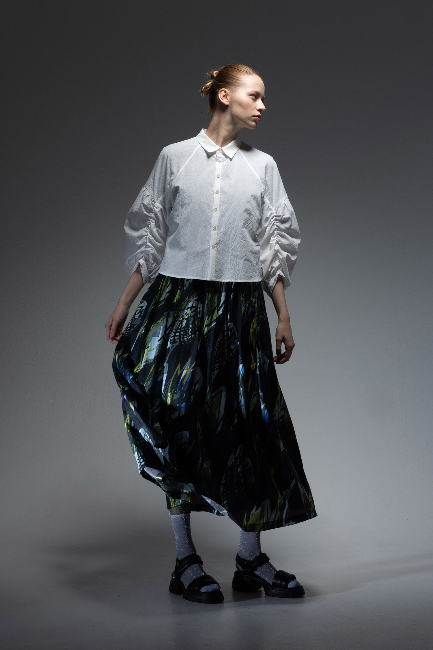White washed cotton cordlane shirt collar with voluminous sleeves.