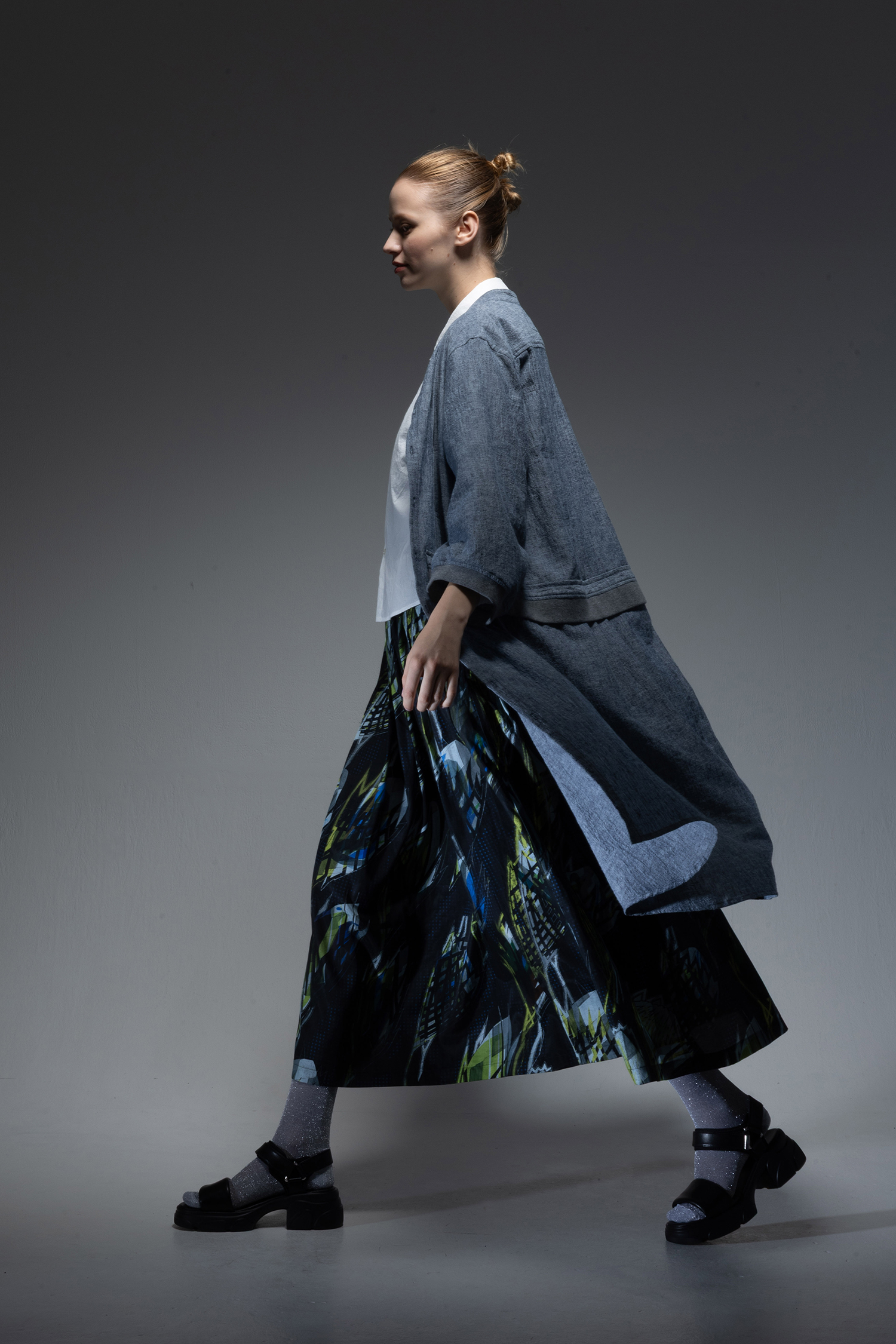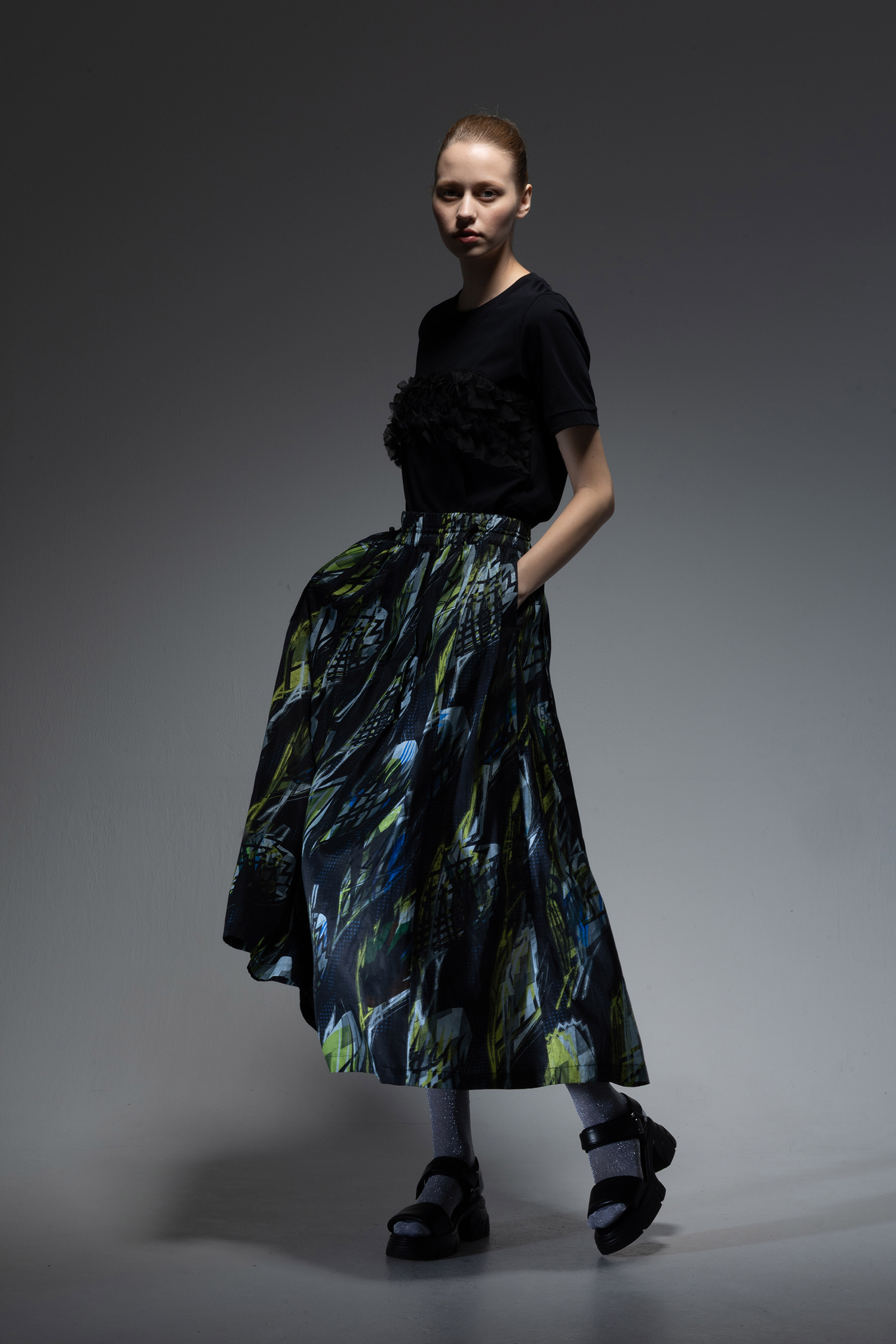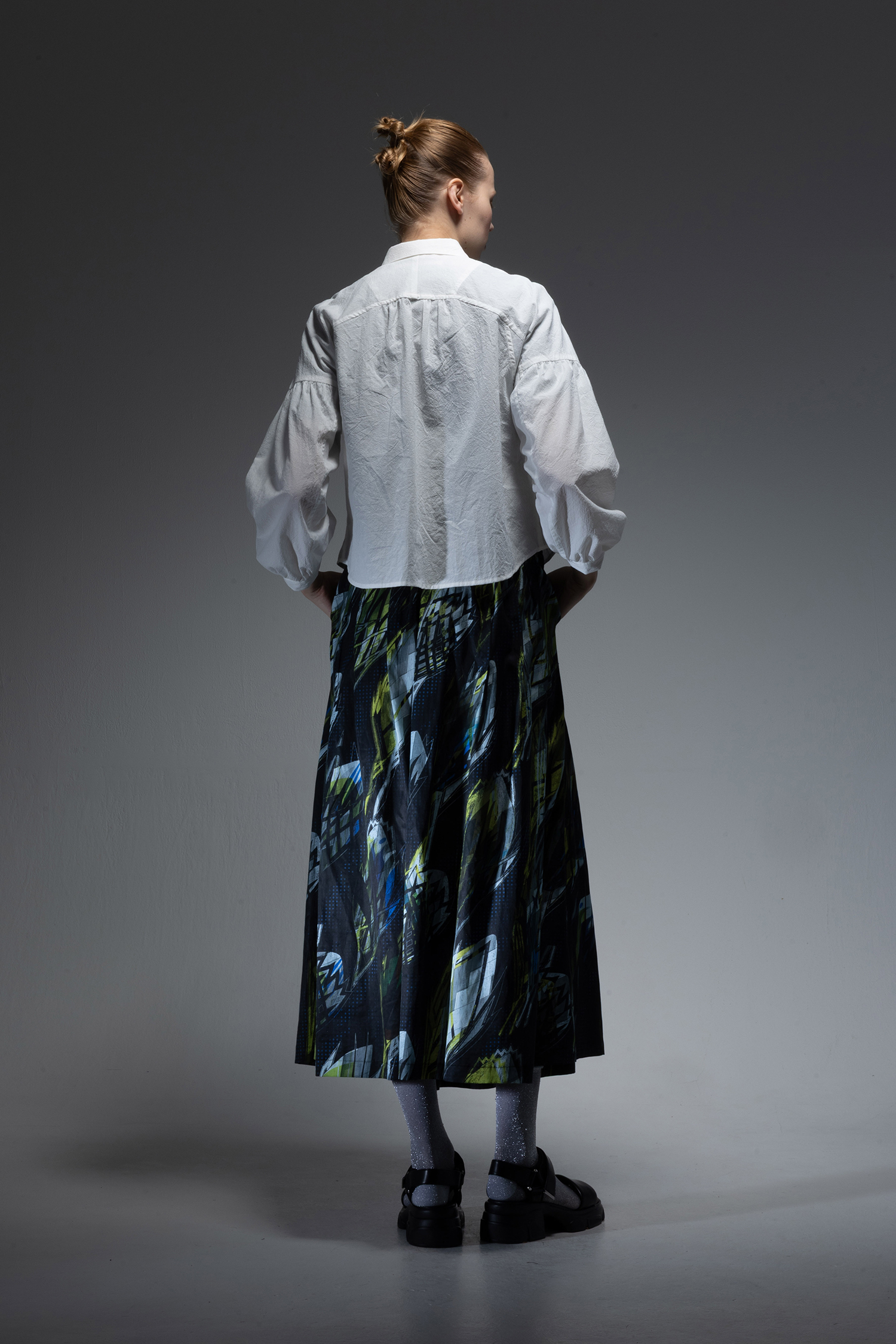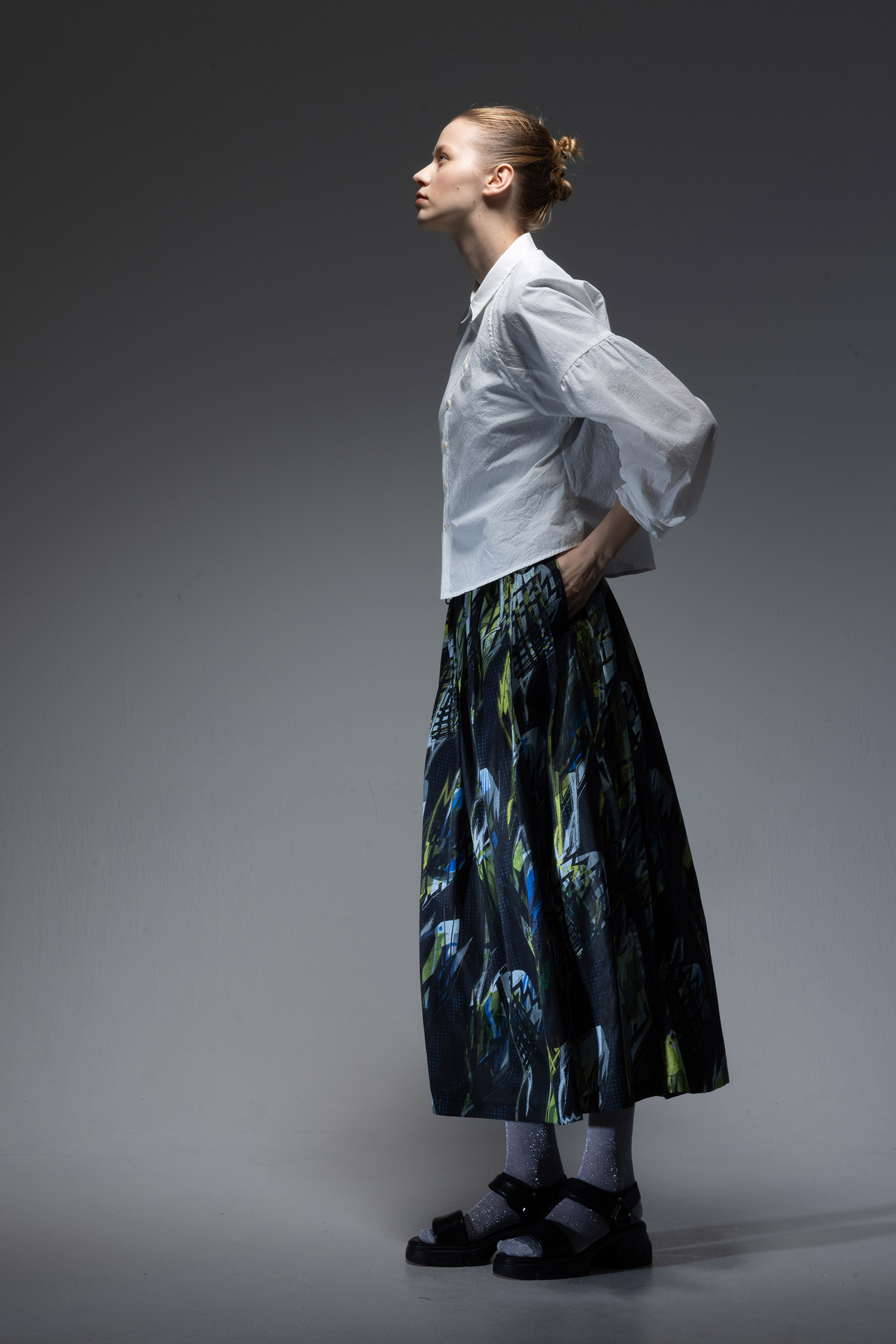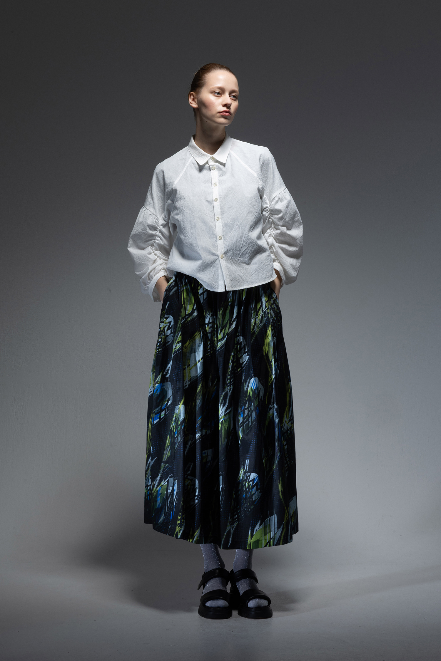 ”メタファー バッズ ” プリント キュプラ/コットンツイル素材を使用したギャザーロングスカート。