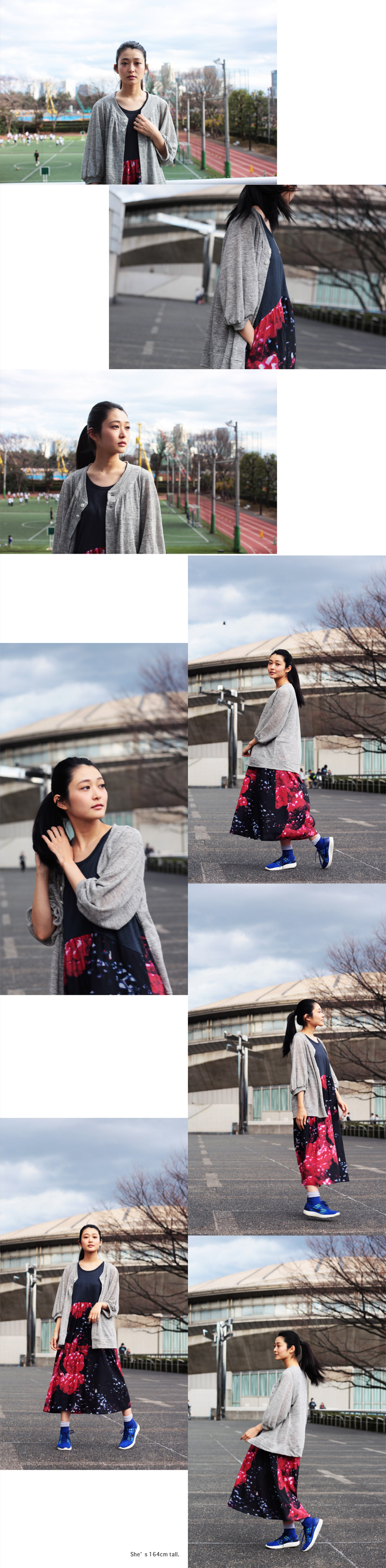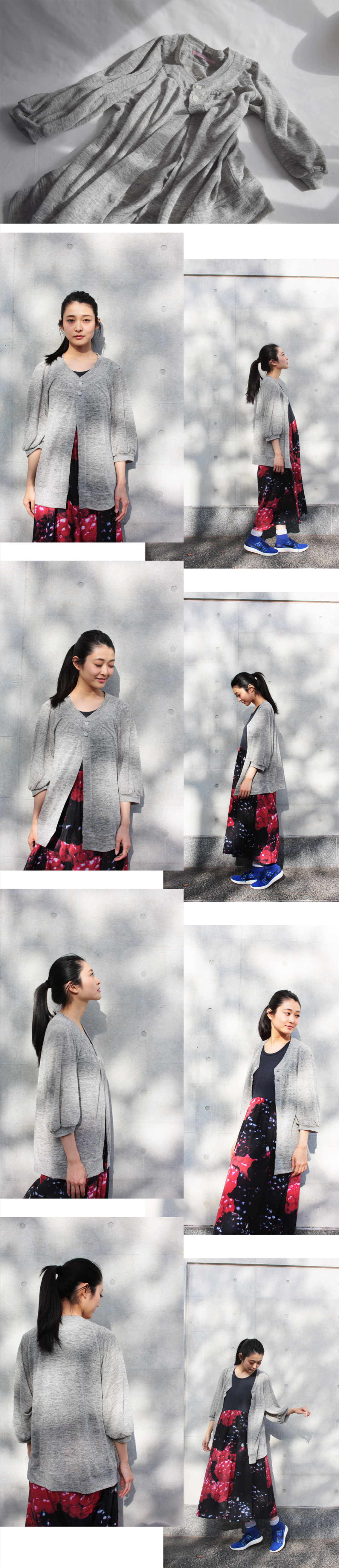 身頃はストーンとしたシルエットに対し、袖はヴォリュームあるパターンにさらに肘に向けて内袖線にタックを入れて膨らみを出したベルスリーブ、その組み合わせが特徴。前衿ぐり周りには、ラウンド状に切り替えを入れ、その切り替えを利用して下に走るアクセントのギャザー、前端に長く伸びる前立てには、ネック部分にのみ2個だけ厚みのある透明マーブルのボタンが付けられています。ラウンドネックに付けられたブルゾンのようなリブ衿、それとリンクしたデザインのベルスリーブを窄ませる袖口リブ、そして裾もリブ付けに。シンプルながらも、要所云々に FFらしさ満載です。