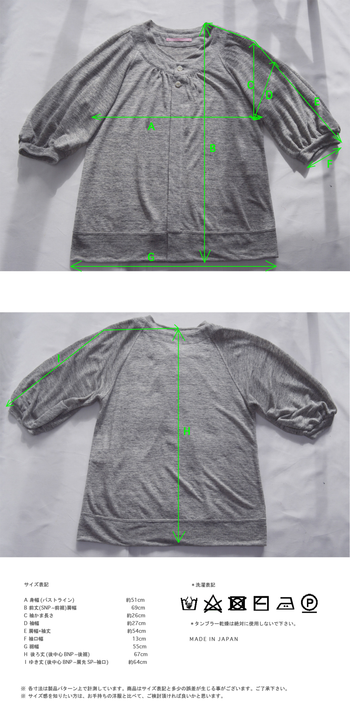衿、袖口、裾とリブ付け、衿は見返しにはさみ付け、袖口は二本針ロック始末、裾は二本針ロック始末プラスカヴァーステッチ入り。メイド イン ジャパンです。