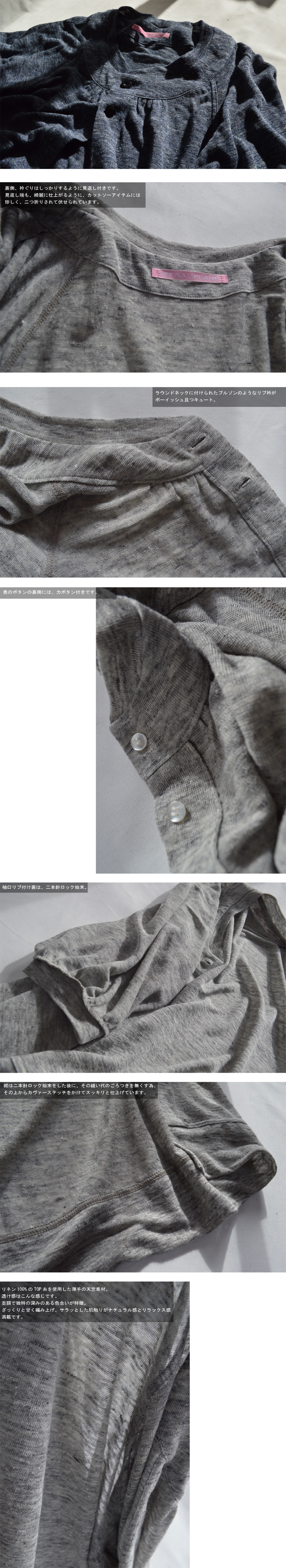 杢調で独特の深みのある色合いが特徴。ざっくりと甘く編み上げ、サラッとした肌触りがナチュラル感とリラックス感満載です。通常、リネン糸は重みがあり、キチンと編んでしまうとさらに重みが増し、高級感はありますが、重く真面目すぎてカジュアル感に欠けますが(ミセス的な感じのする)、このリネン天竺は甘くざっくりと編み上げている為、本当に優しく堅くなく手触りの気持ち良さ抜群です。夏に涼しくサラッと着れて、とても便利なアイテムになること間違いなしです。