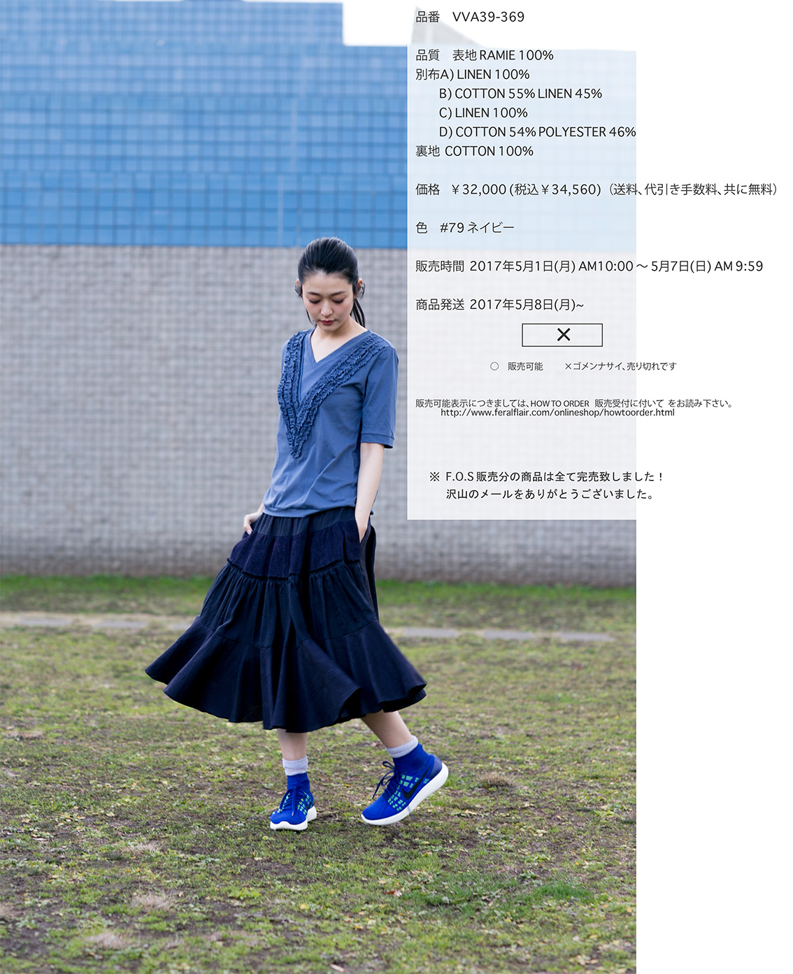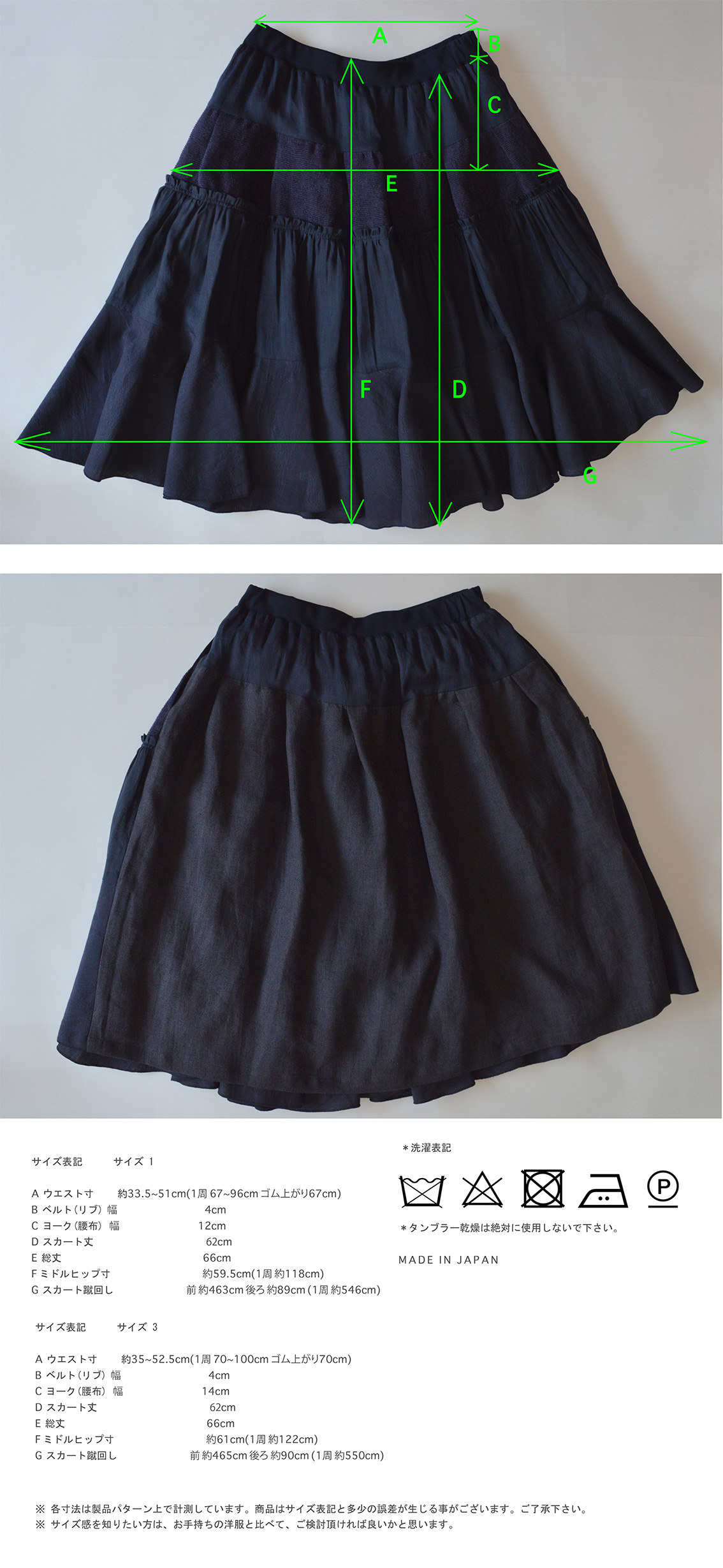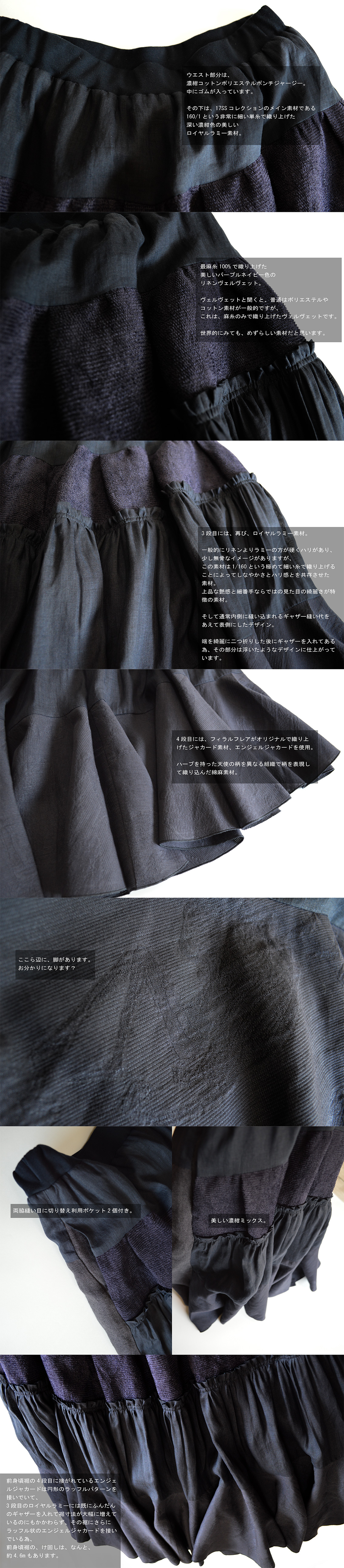 FOS第四十二弾にお届けするのは、4種類の異なる素材、微妙に異なる色のネイビーをミックスした 、ウエストゴム入りのリブ使い、前身頃のみにふんだんのギャザーとラッフルをいれた膝下丈ギャザースカート、ふんわりしているのに決して甘くなく、モード感も漂う、迫力の前身頃のギャザースカートです。 使われる素材は、ゴムの入ったウエスト布部分の濃紺コットンポリエステルポンチジャージーから始まり、その下に向かって、まず前身頃は、1段目に、17SSコレクションのメイン素材である160/1という非常に細い単糸で織り上げた深い濃紺色の美しいロイヤルラミー素材、2段目には、麻糸100%で織り上げた美しいパープルネイビー色のリネンヴェルヴェット、3段目には、再び、ロイヤルラミー素材、そして4段目には、フィラルフレアオリジナル素材、ハープを持った天使の柄が織り込まれた綿麻のエンジェルジャカード素材を使用。 後ろ身頃、1段目には、ロイヤルラミー素材を使用、2段目には、天然素材の素朴さを小ロット生産で手作業で仕上げたアンティークの風合い 褪せた色が特徴のパープルネイビー色の麻100%のリネンビエラワッシャー素材を使用、と多素材満載です。 ヴォリュームのある前身頃は着用を繰り返すとハリ感が薄れてきてどんどんスッキリとした落ち感が冴えて、大人の雰囲気が増していきます。 無類のネイビー好きの方に贈る FFならではのネイビーミックススカートです。